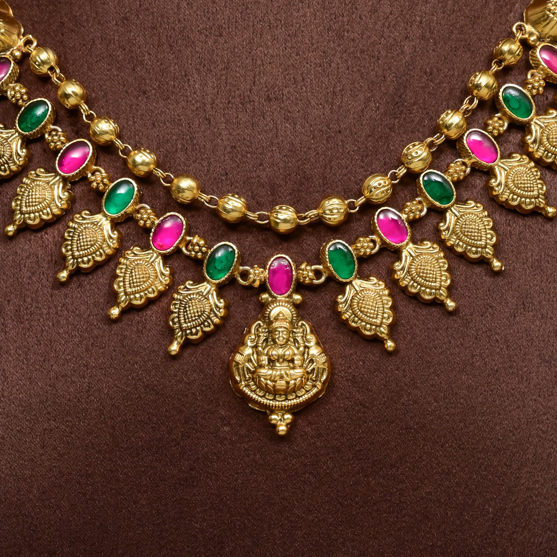Elevate your spiritual elegance with this exquisite Silver Temple Nakshi Necklace, a handcrafted masterpiece featuring the divine Goddess Lakshmi design. Crafted from premium 925 silver, this one-of-a-kind piece combines traditional temple artistry with contemporary sophistication. The necklace showcases intricate nakshi work paired with semi-precious stones that catch light beautifully, while delicate pearl drops add a graceful finishing touch. Each detail is meticulously hand-finished, ensuring a royal and classy aesthetic perfect for festive occasions, spiritual ceremonies, or those who appreciate fine traditional jewelry. A timeless investment piece that celebrates craftsmanship and devotion in equal measure.
