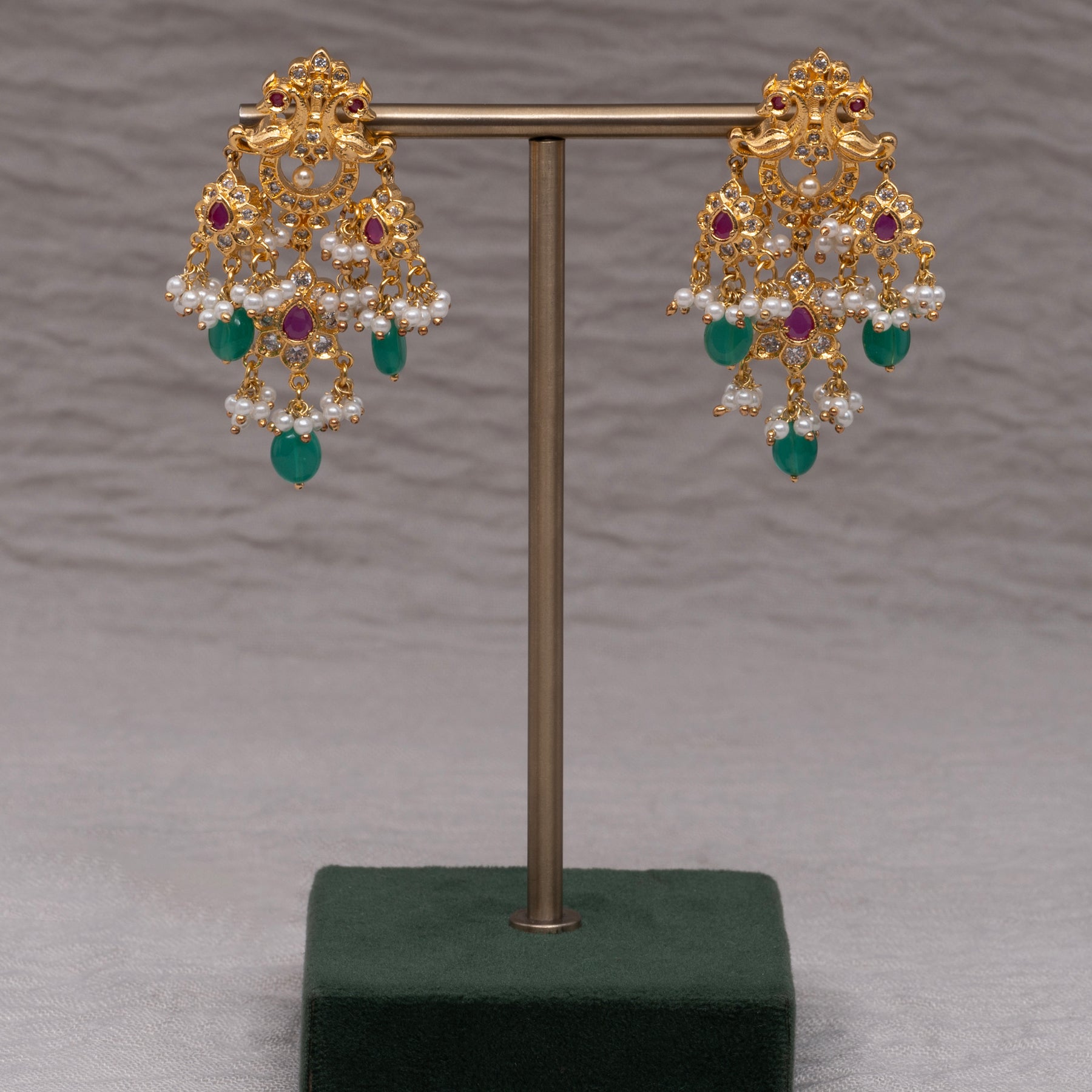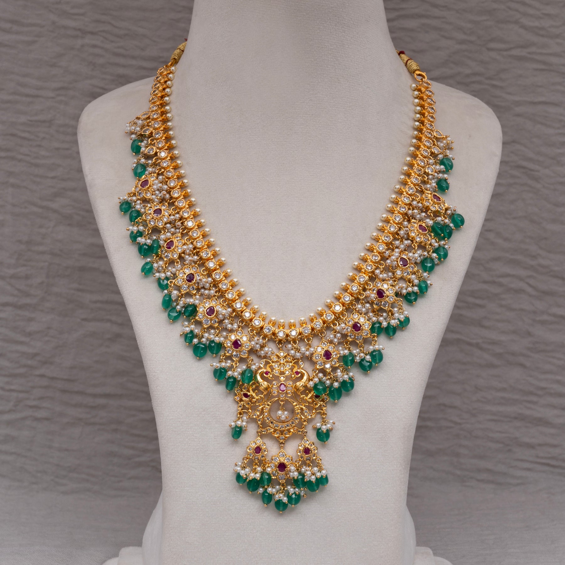 Experience luxury with the Guttapusal Necklace Set. This handmade jewelry features top quality semi-precious round pearls, real cz stones, and semi-precious mint stones, giving it a unique and exclusive design. With its real gold look and feel, this one of a kind necklace set offers a touch of elegance to any outfit.