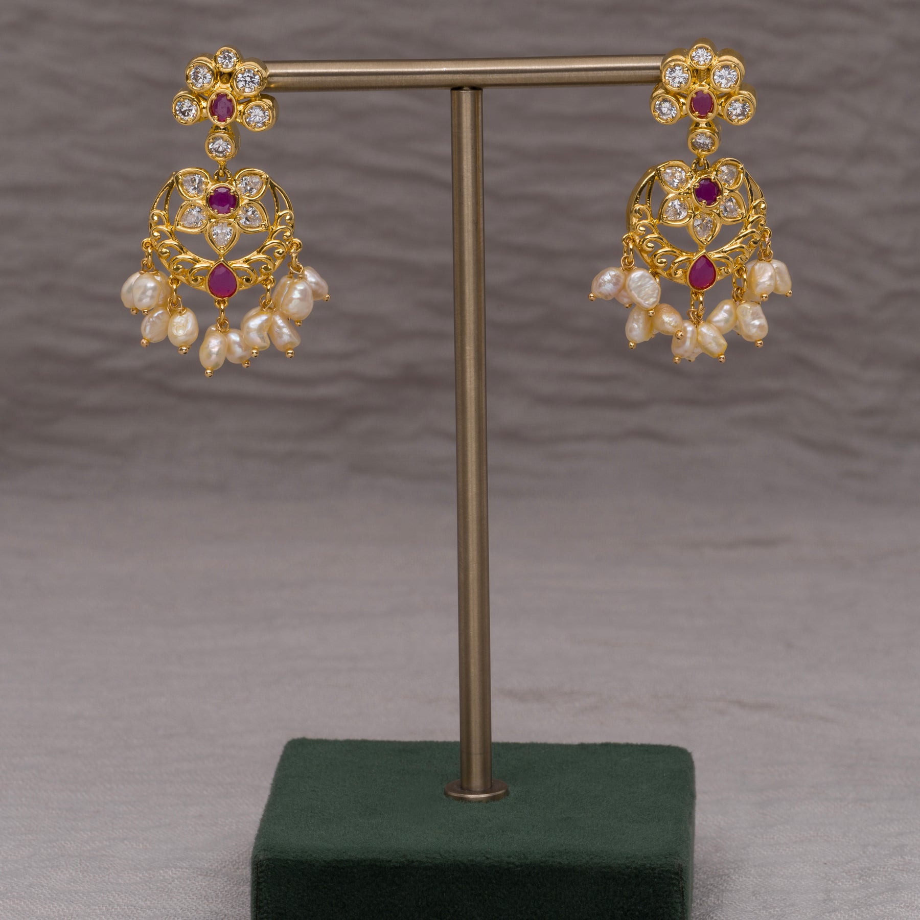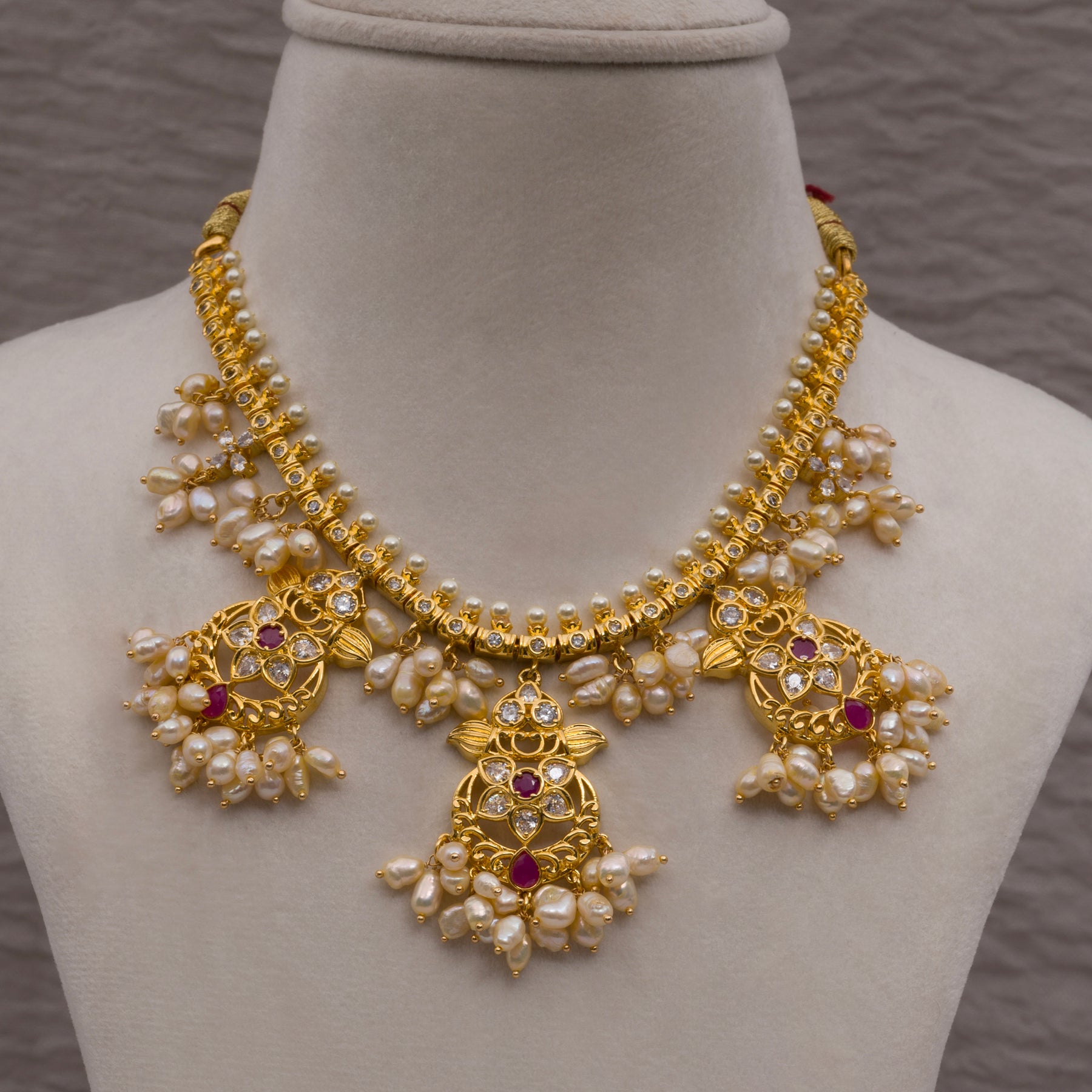 Crafted by hand with top quality rice pearls and real semi-precious ruby, this Guttapusal Necklace Set is a one-of-a-kind luxury piece. The real cz stones and gold finish add to its unique design, giving it a luxurious and elegant look. Own a timeless and exclusive piece of jewelry with this handmade necklace set.