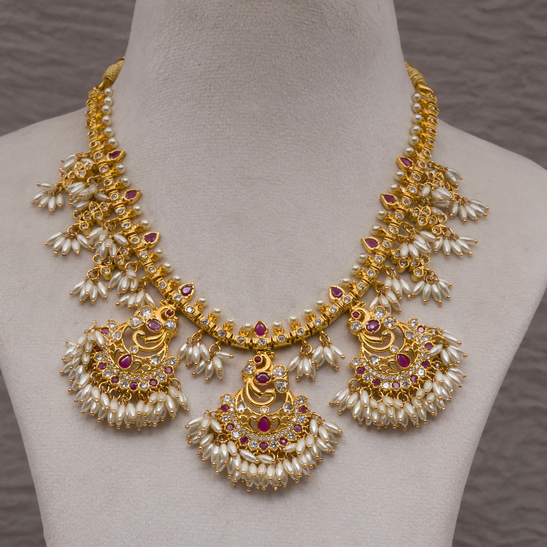 Handcrafted with top quality semi-precious rice pearls, real CZ stones, and semi-precious ruby, the Guttapusal Necklace Set boasts a luxurious and unique design. The intricate craftsmanship gives it a real gold look and feel, making it a one-of-a-kind piece. Elevate your style with this exclusive handmade necklace set.