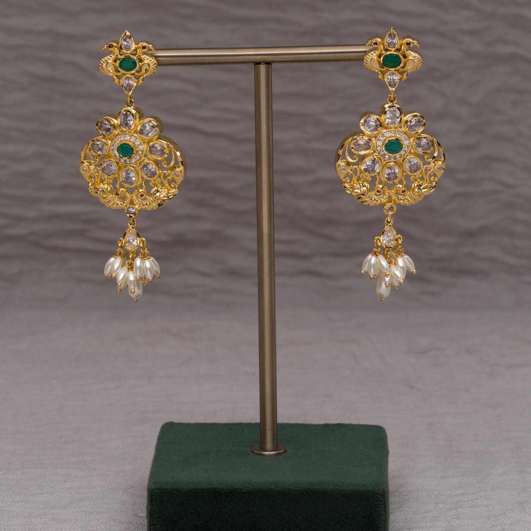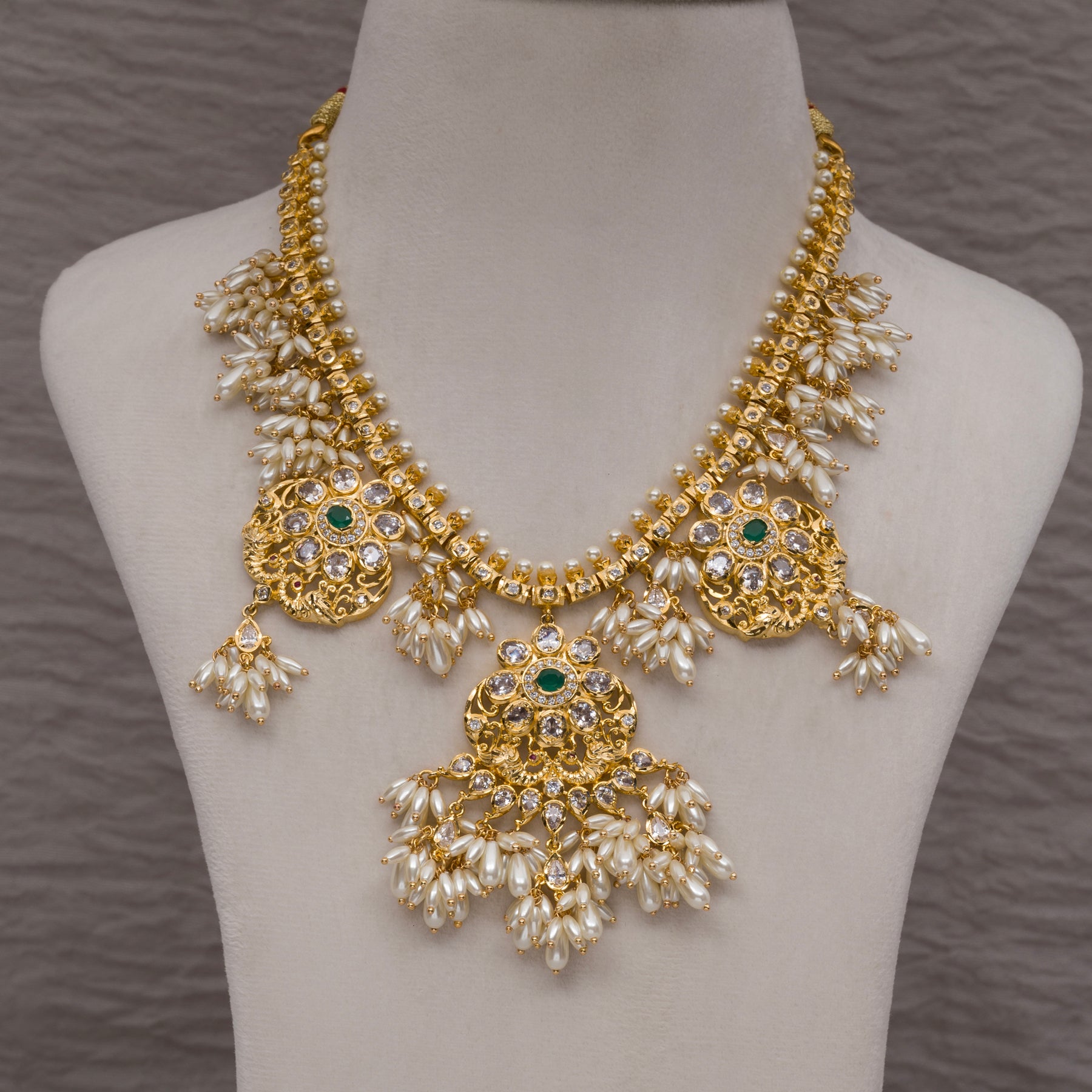 This Guttapusal Necklace Set features top quality semi-precious rice pearls, real cz stones, and semi-precious emerald. Handmade with an exclusive one of a kind design, it provides a real gold look and feel. Elevate your style with this unique and elegant piece.