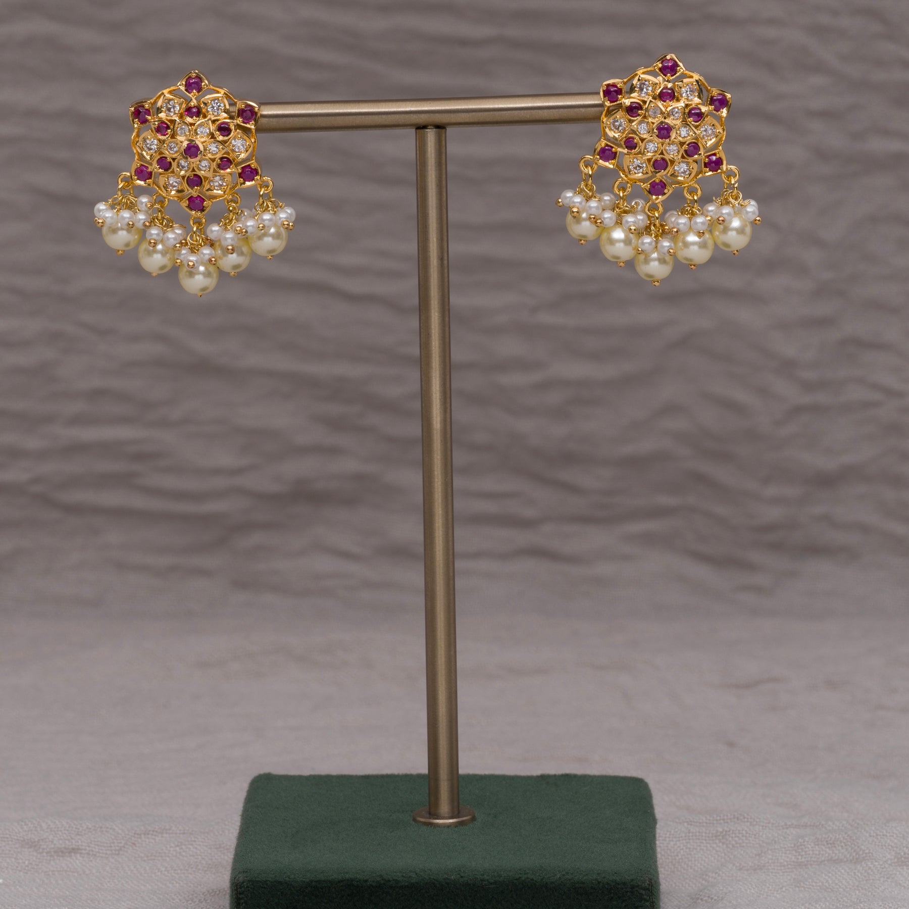 This Guttapusal Necklace Set features top quality semi-precious round pearls, real CZ stones, and semi-precious ruby. The handmade design provides a one-of-a-kind look and the real gold finish adds to the luxurious feel. Elevate any outfit with this exclusive piece.