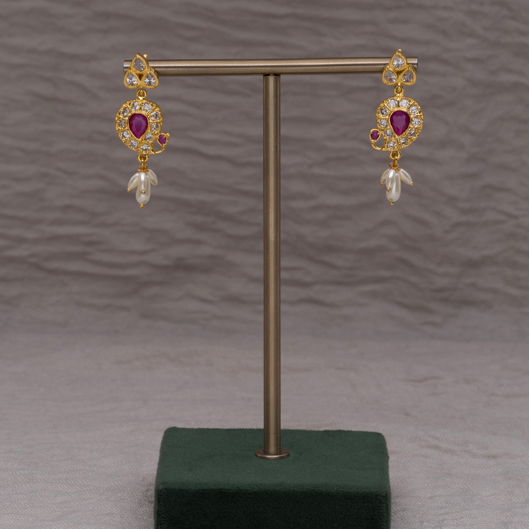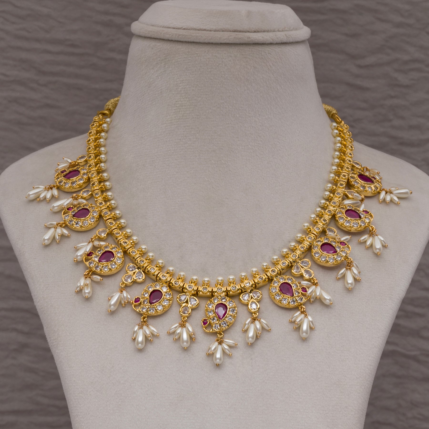 Impress with elegance in the Guttapusal Necklace Set. Made with top quality semi-precious rice pearls, real cz stones, and semi-precious ruby, this handmade piece exudes luxury and sophistication. With its one of a kind design and real gold look & feel, this necklace set is a perfect choice for any special occasion.