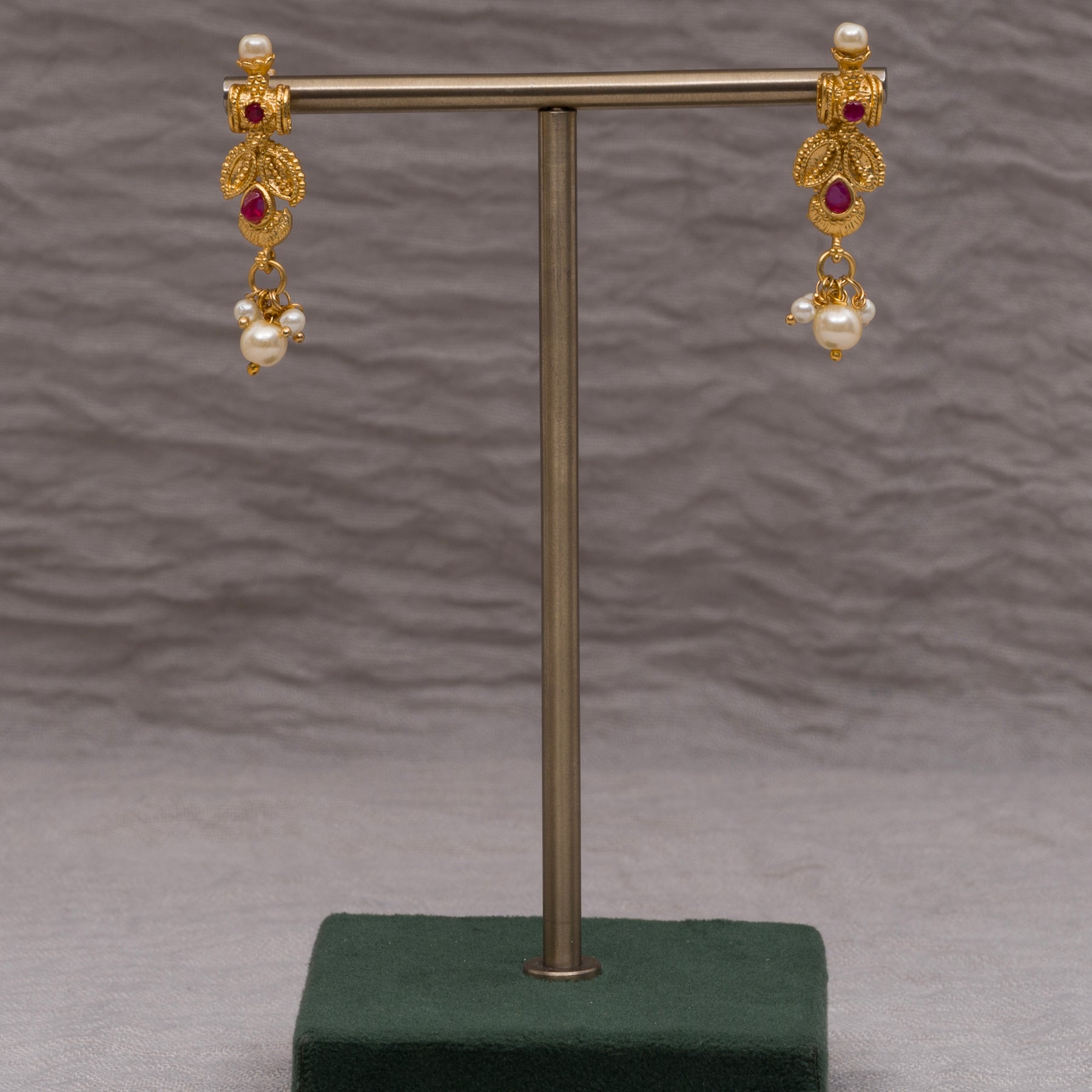 The Guttapusal Necklace Set features top quality semi-precious round pearls, and semi-precious rubies, all handcrafted into an exquisite and exclusive design. With a real gold look and feel, this one-of-a-kind set is perfect for adding a touch of elegance and sophistication to any outfit.