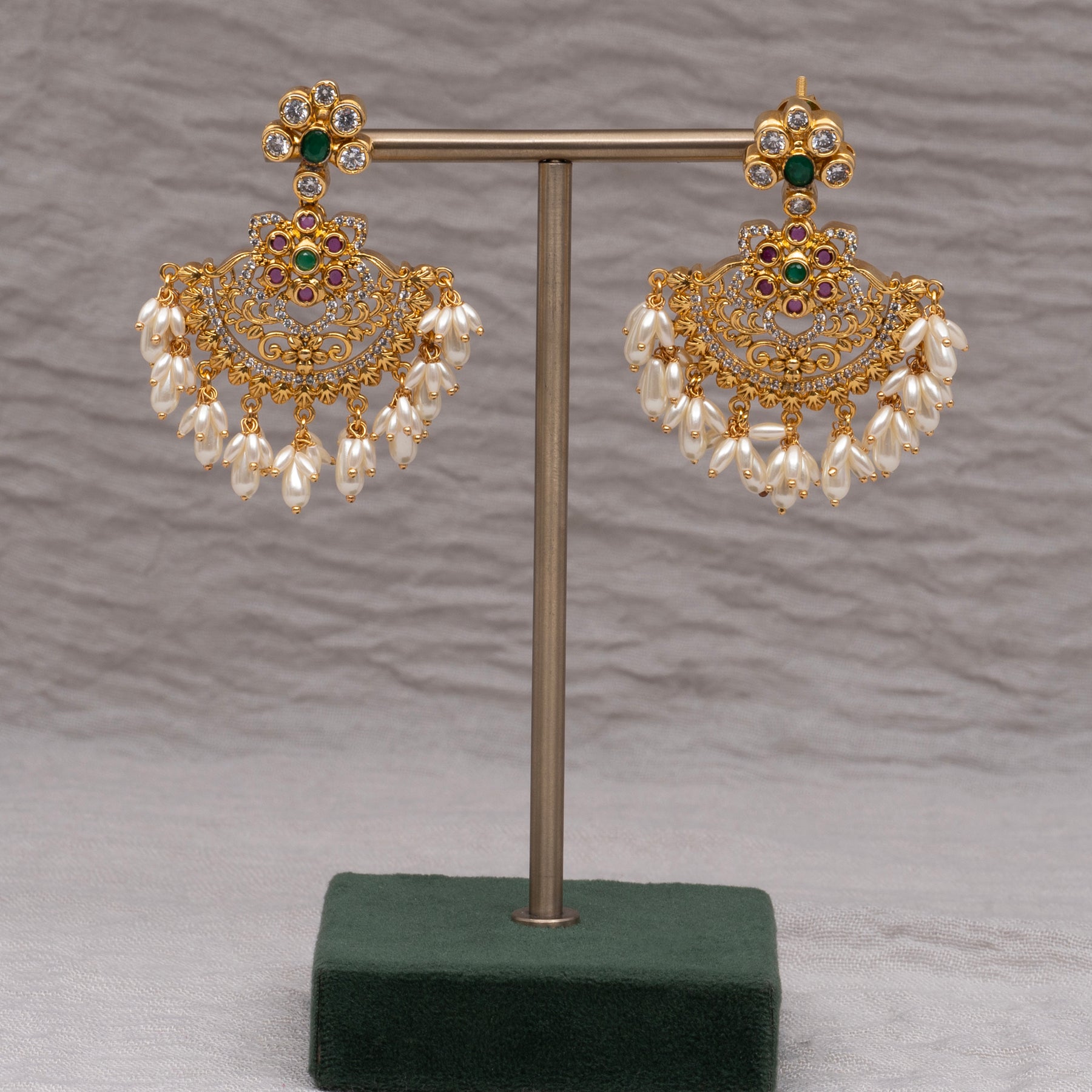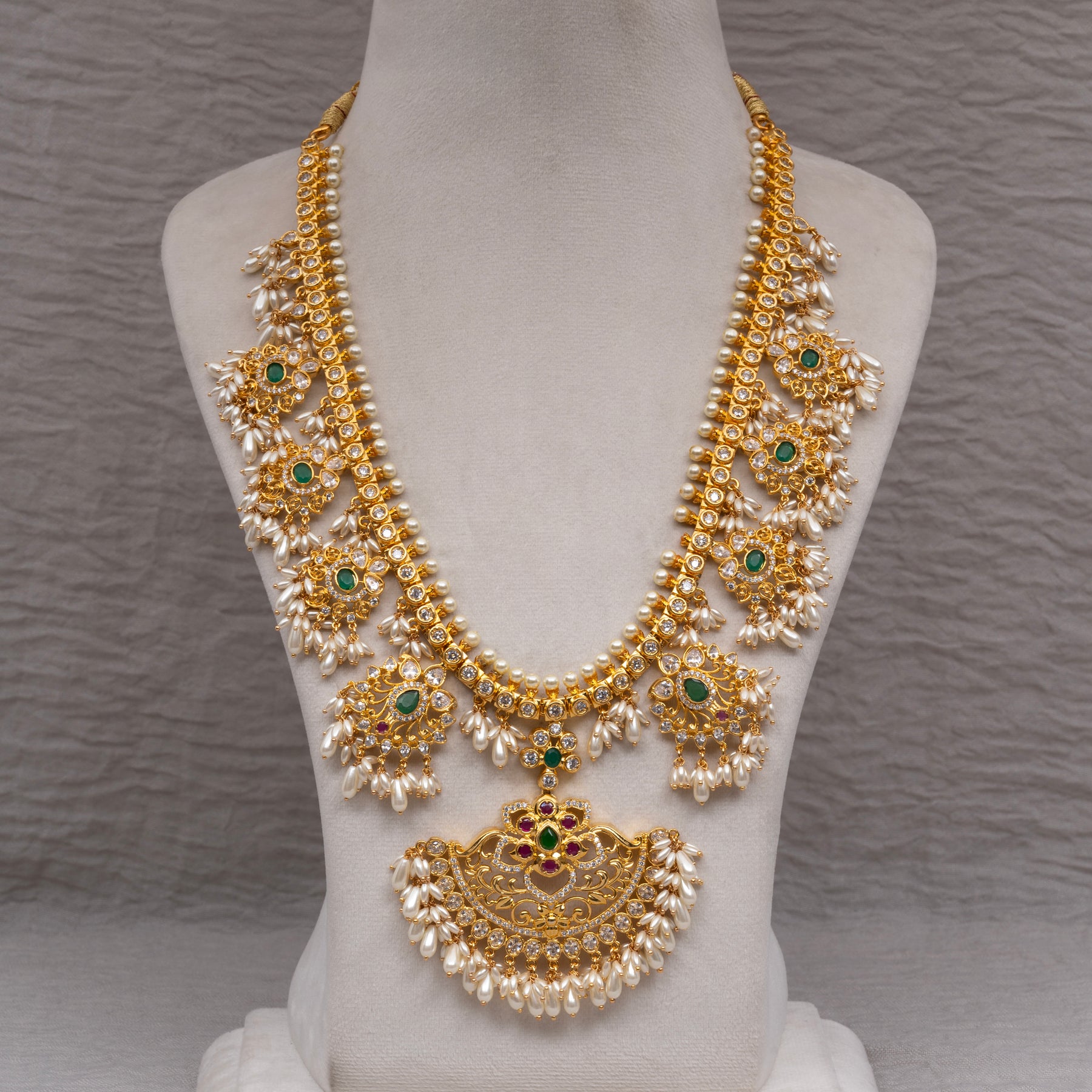 Experience the ultimate luxury with our handcrafted Guttapusal Necklace Set. Featuring top quality semi-precious rice pearls, real cz stones, and semi-precious emerald, this necklace set boasts a royal design that is one-of-a-kind. Its handmade craftsmanship and real gold look and feel make it a truly exquisite piece.