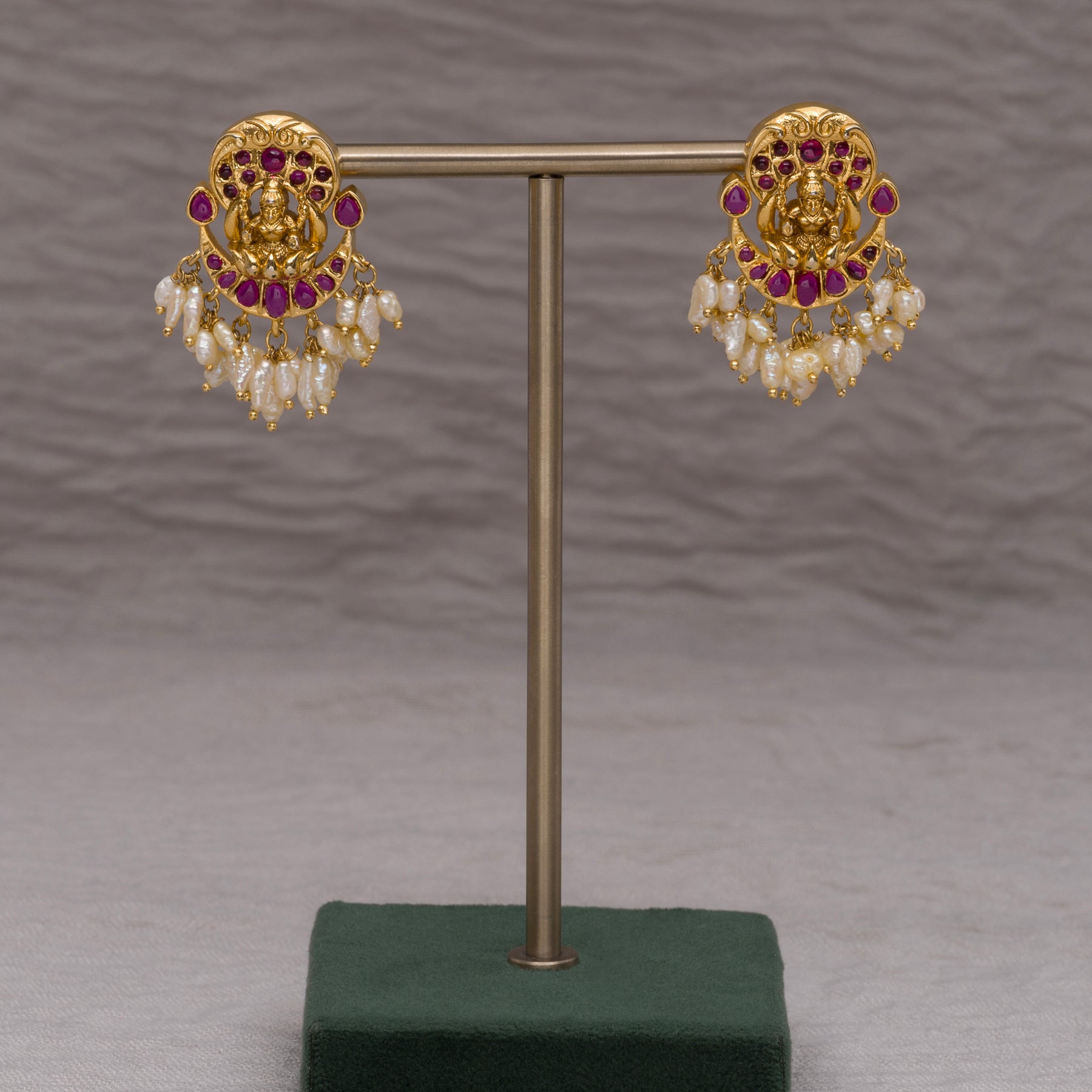 This exquisite necklace set features top quality real rice pearls, real CZ stones, and a semi-precious ruby, creating a unique royal design. Handmade and exclusively designed, it offers a luxurious real gold look and feel, making it one of a kind. Elevate your style with this beautiful Lakshmi design.