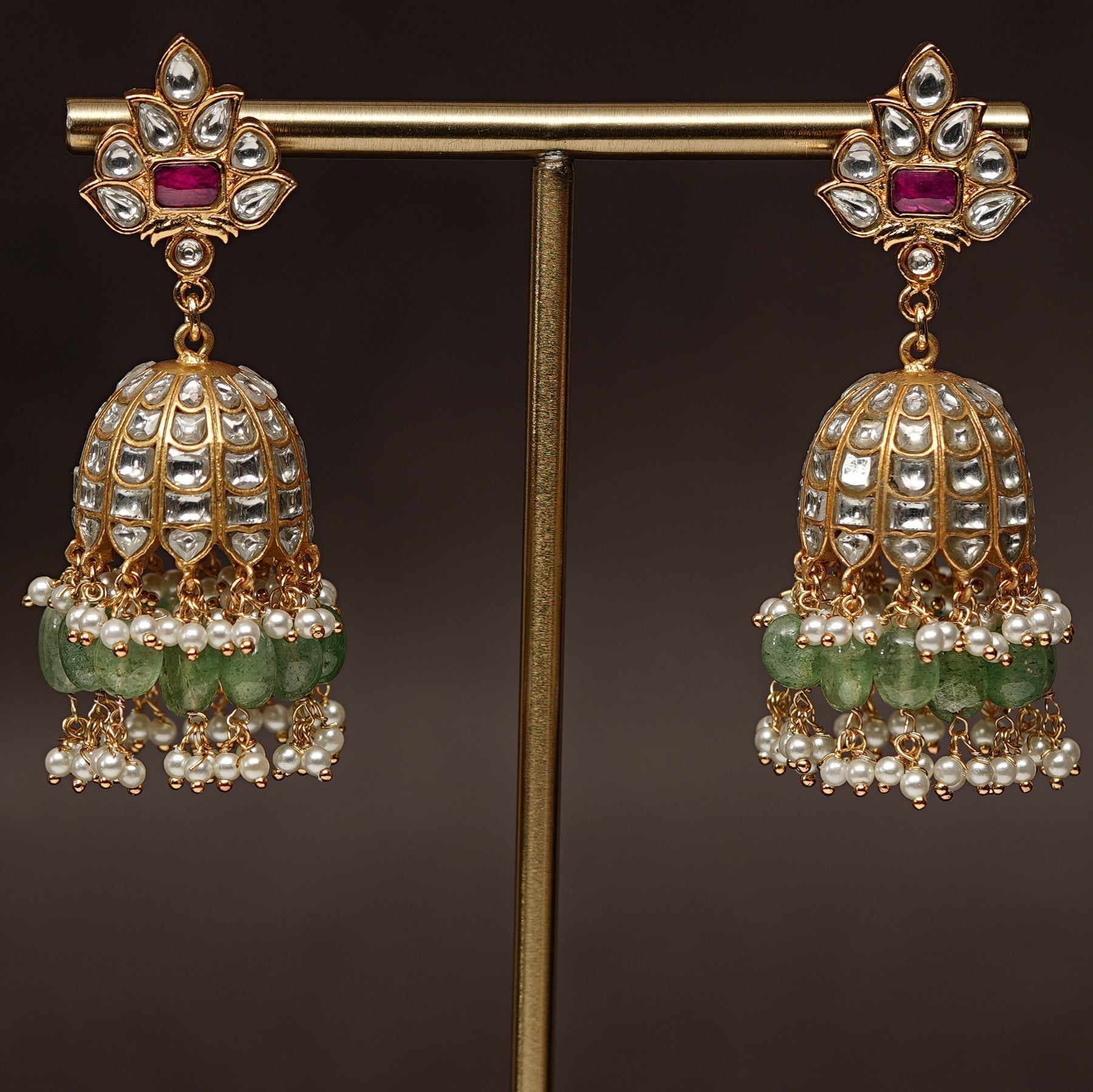 These Kundan Jhumka Earrings showcase exquisite craftsmanship with delicately dangling pearls that enhance their traditional charm. Handcrafted to perfection, they feature stones that resemble real precious gems, offering a unique and timeless design. Ideal for those seeking an authentic and elegant accessory that stands out in any collection.