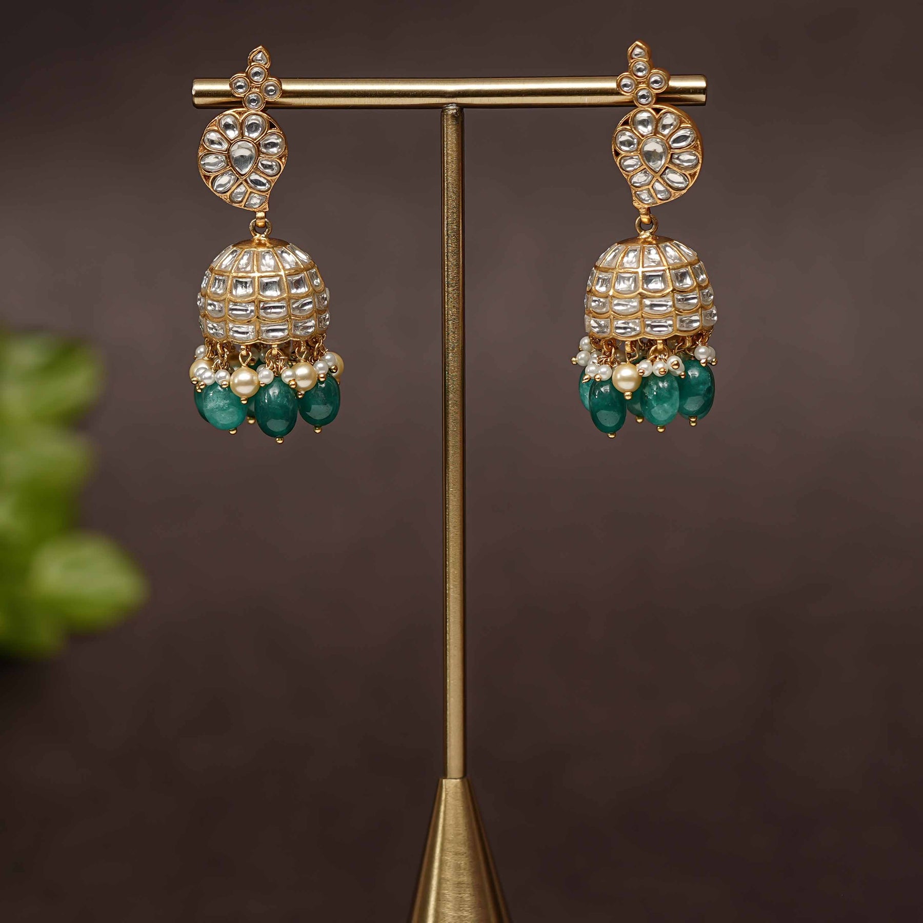 These Kundan Jhumka Earrings showcase exquisite craftsmanship with delicately dangling pearls that enhance their elegance. Handcrafted with precision, they feature a unique traditional design that mimics the appearance of real precious stones, making each pair truly one of a kind. Perfect for adding a refined touch to any ethnic ensemble.