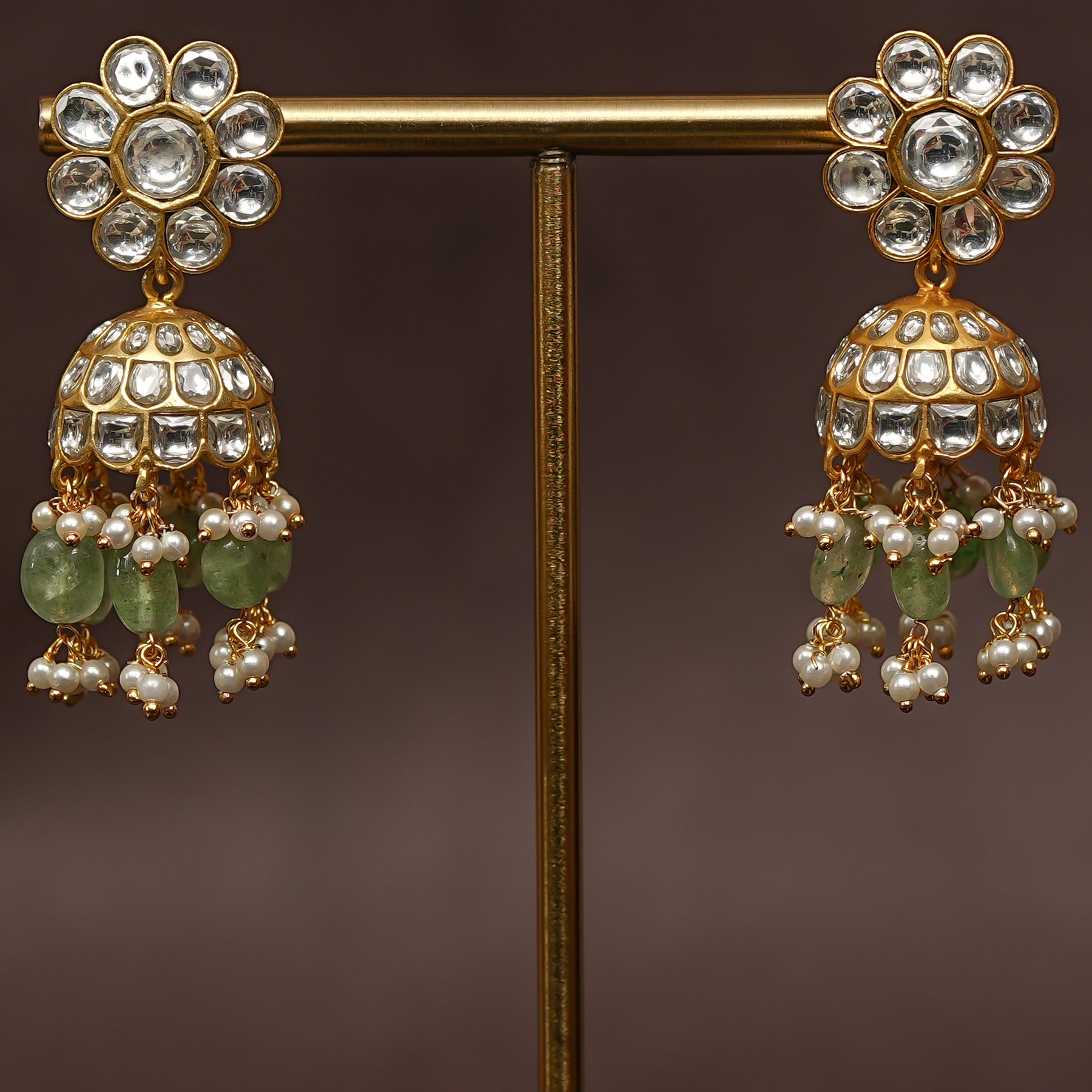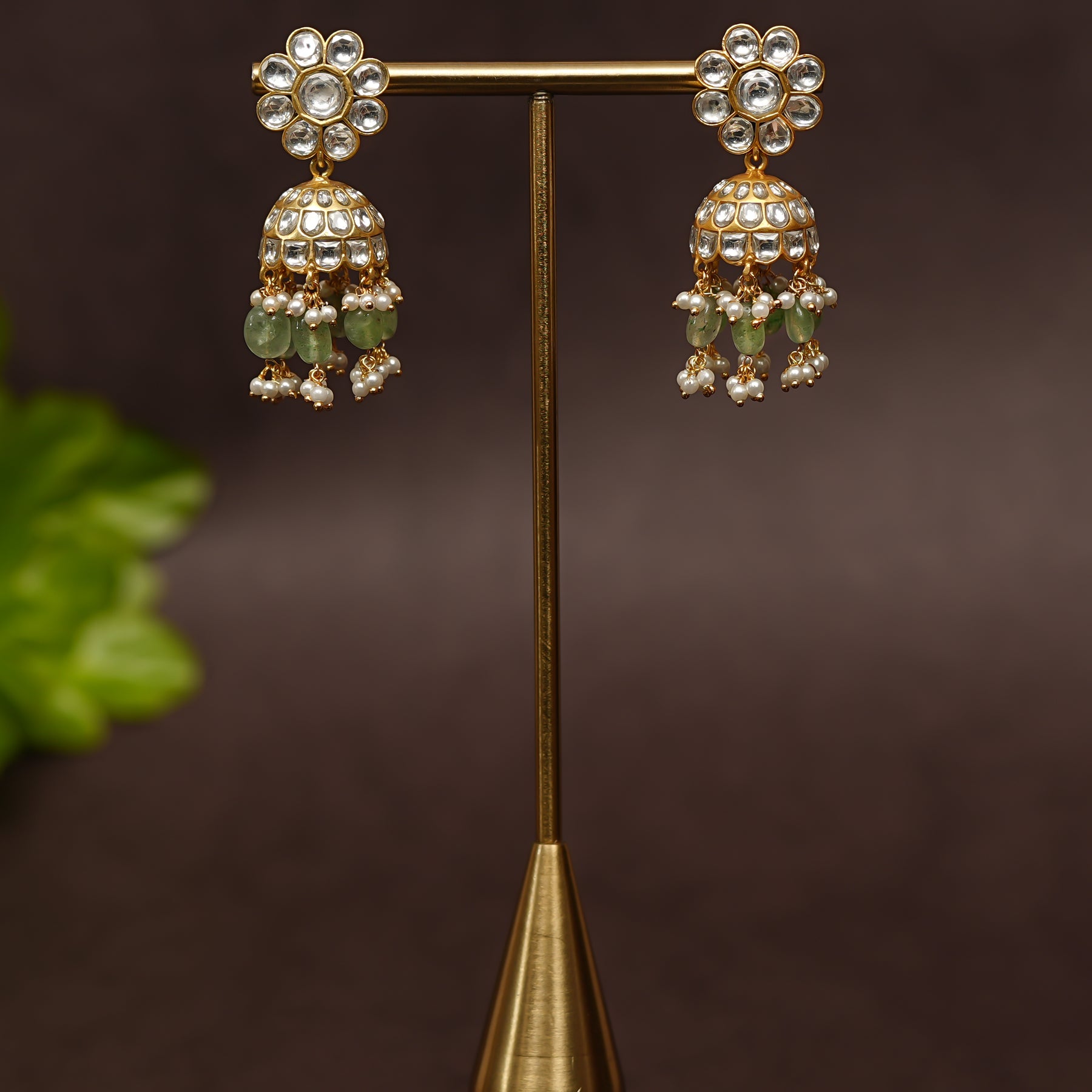 These Kundan Jhumka Earrings showcase exquisite craftsmanship with delicately dangling pearls that enhance their traditional charm. Handcrafted to perfection, they feature stones that resemble real precious gems, offering a unique and timeless design. Ideal for those seeking an authentic piece that blends heritage with elegance.