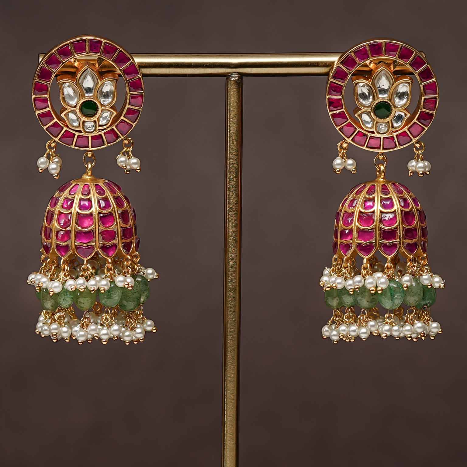 These Kundan Jhumka Earrings showcase exquisite craftsmanship with delicately dangling pearls that enhance their elegance. Handcrafted to perfection, they feature a unique traditional design that mimics the appearance of real precious stones, making each pair truly one of a kind. Ideal for those seeking timeless sophistication with an authentic artisanal touch.