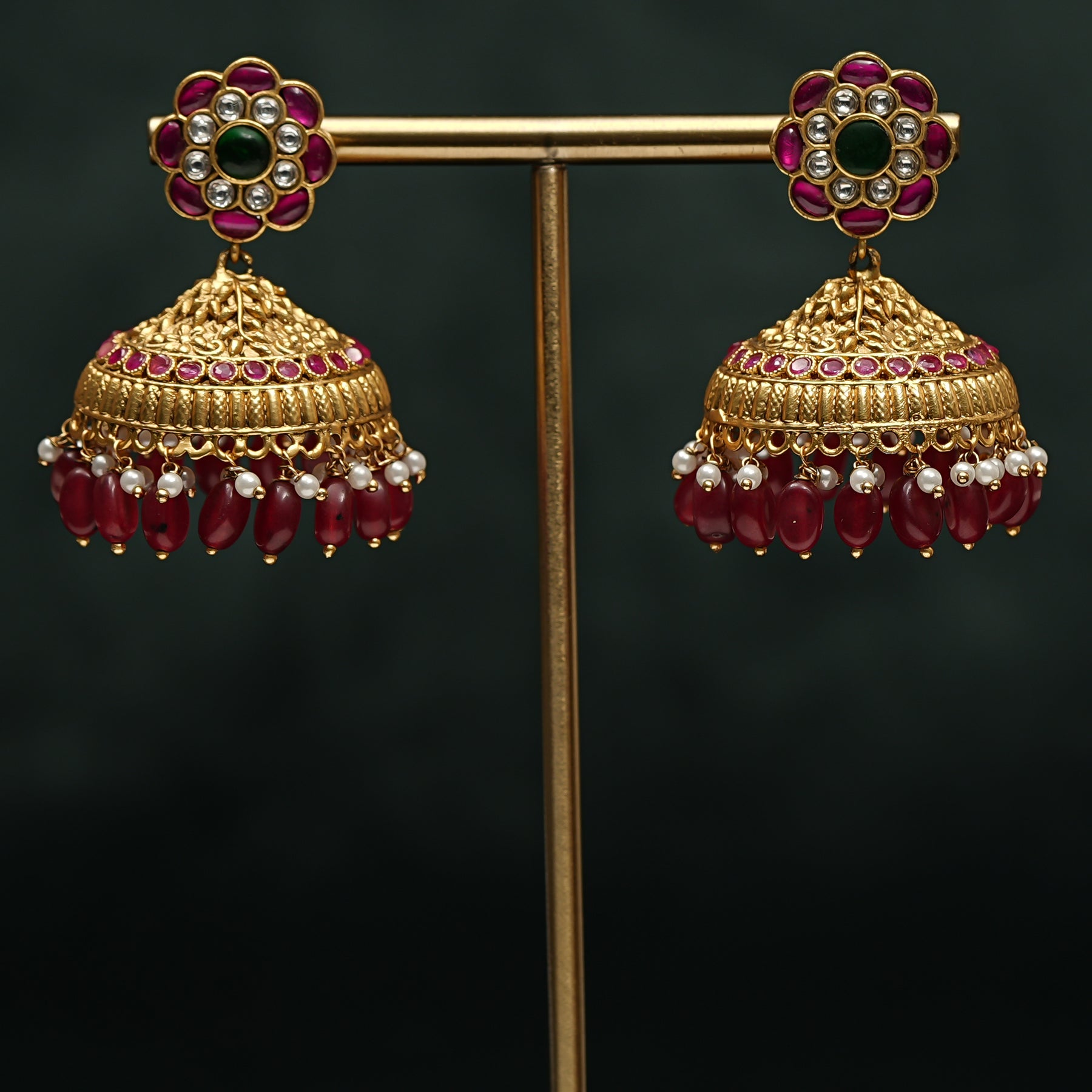 These Kundan Jhumka Earrings showcase exquisite craftsmanship with beautifully handcrafted details. Featuring delicate pearls that dangle gracefully, they emulate the brilliance of real precious stones. Their unique traditional design makes them a standout piece, perfect for adding an elegant touch to any ethnic ensemble.