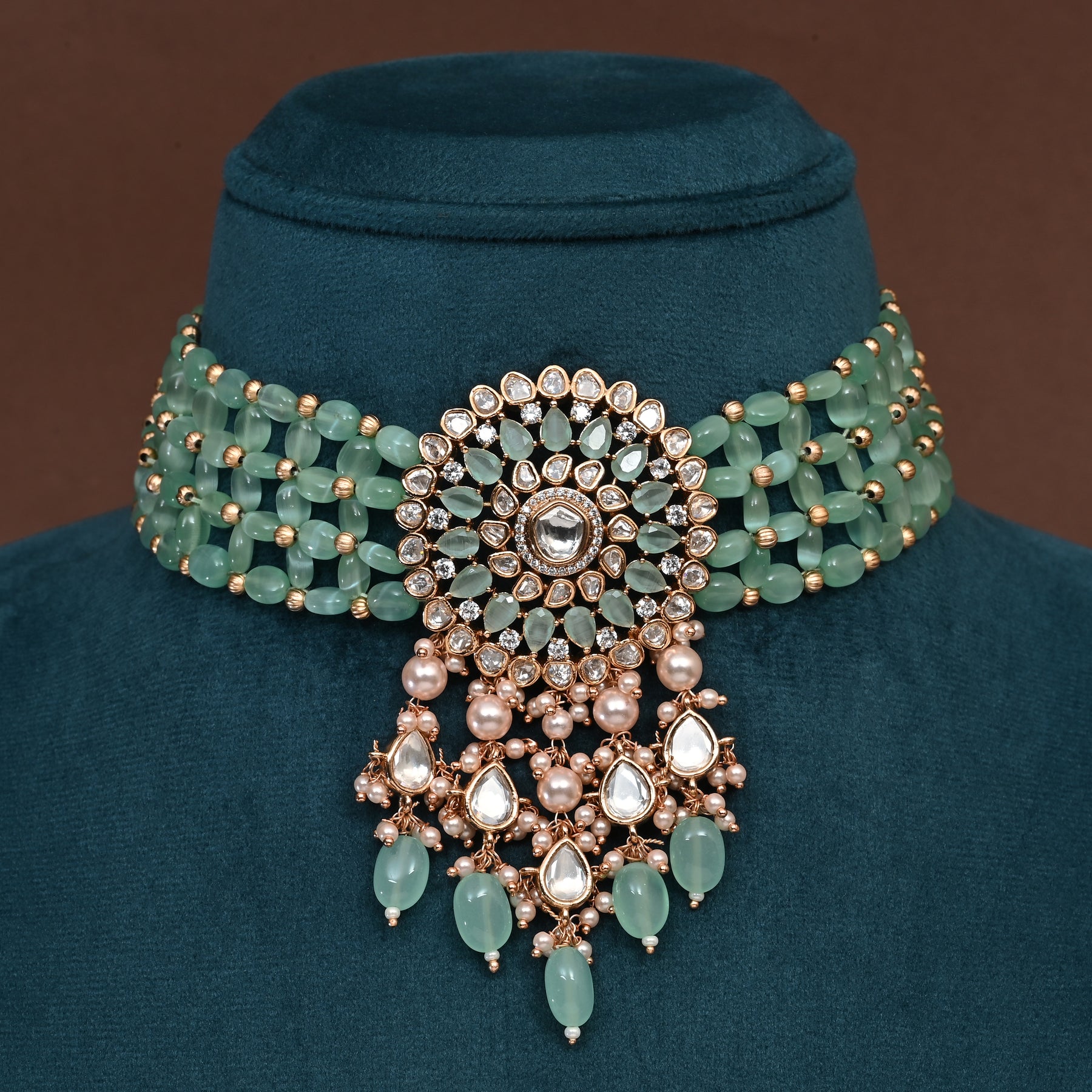 Elevate your elegance with this handcrafted Moissanite Choker Set, featuring dazzling moissanite and real CZ stones that mimic the brilliance of diamonds. Each piece showcases a unique, one-of-a-kind design, expertly crafted to offer the timeless sparkle and sophistication of genuine diamonds at an exceptional value. Perfect for those who appreciate refined craftsmanship and lasting beauty.
