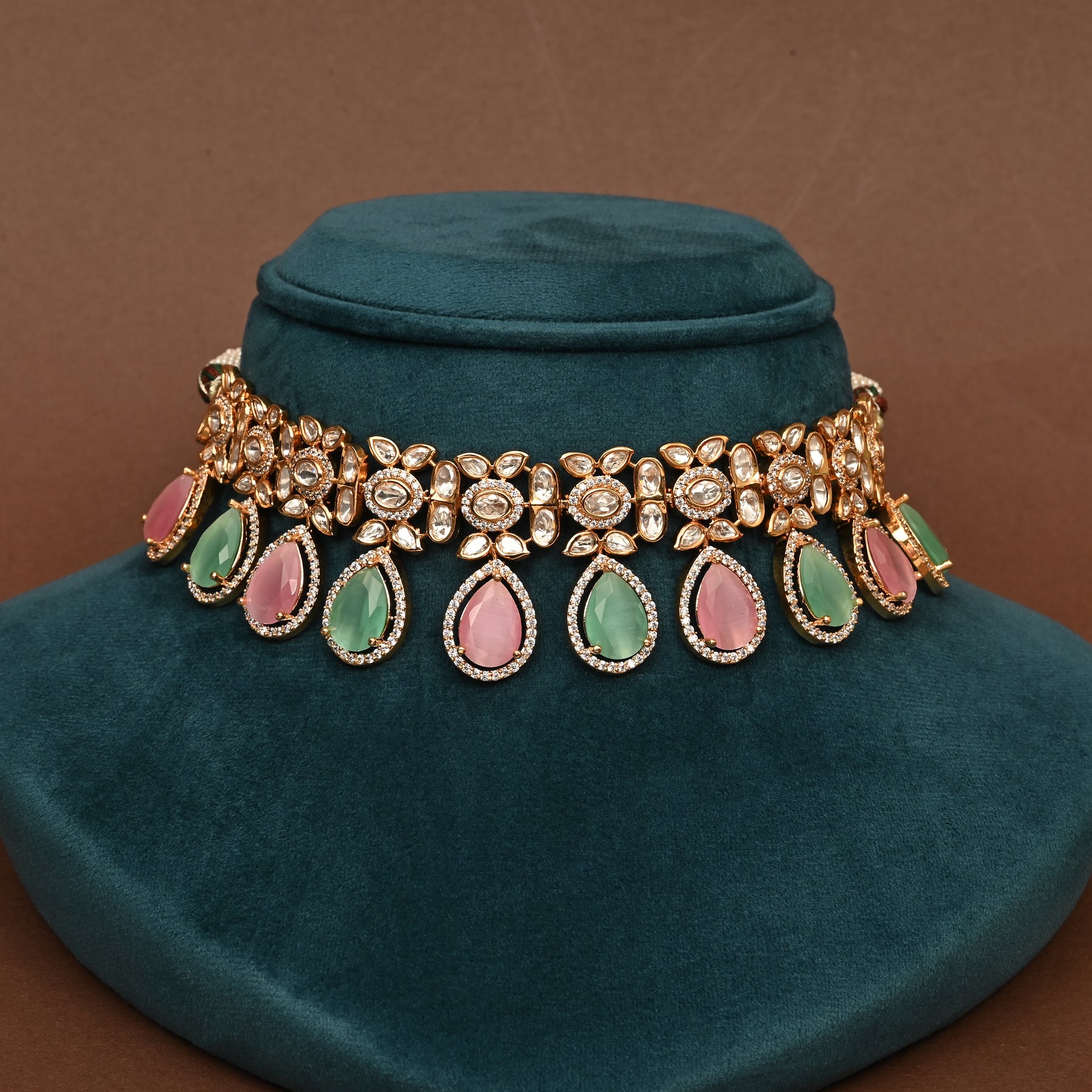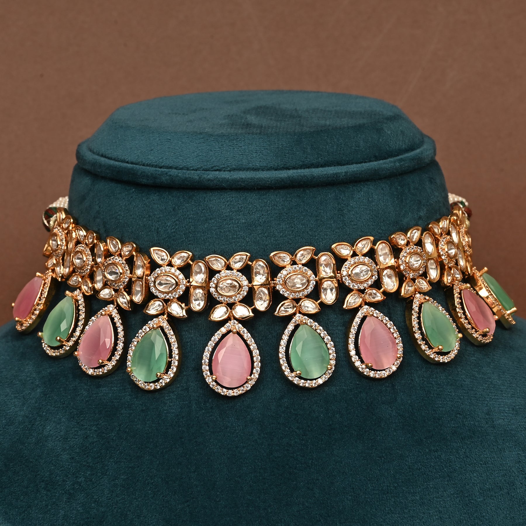 Elevate your elegance with this handcrafted Moissanite Choker Set, featuring dazzling real CZ and moissanite stones that closely mimic the brilliance of real diamonds. Each piece is uniquely designed to offer a one-of-a-kind look, combining expert craftsmanship with exceptional sparkle for a timeless statement. Perfect for those seeking luxury with lasting shine and sophistication.