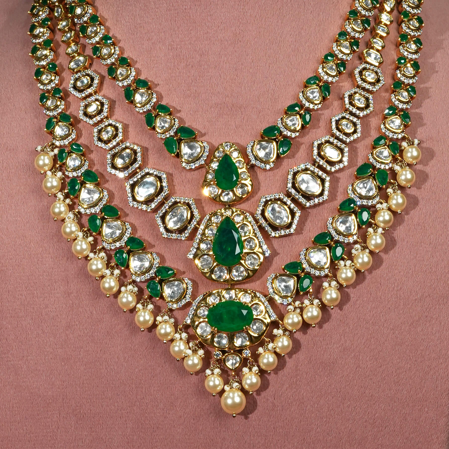 This Moissanite Necklace Set showcases expertly handcrafted luxury, combining real cubic zirconia stones with semi-precious emerald accents. Its design offers the brilliance and elegance of real diamonds, delivering a sophisticated and timeless look. Ideal for those seeking a classy statement piece with exceptional sparkle and refined craftsmanship.