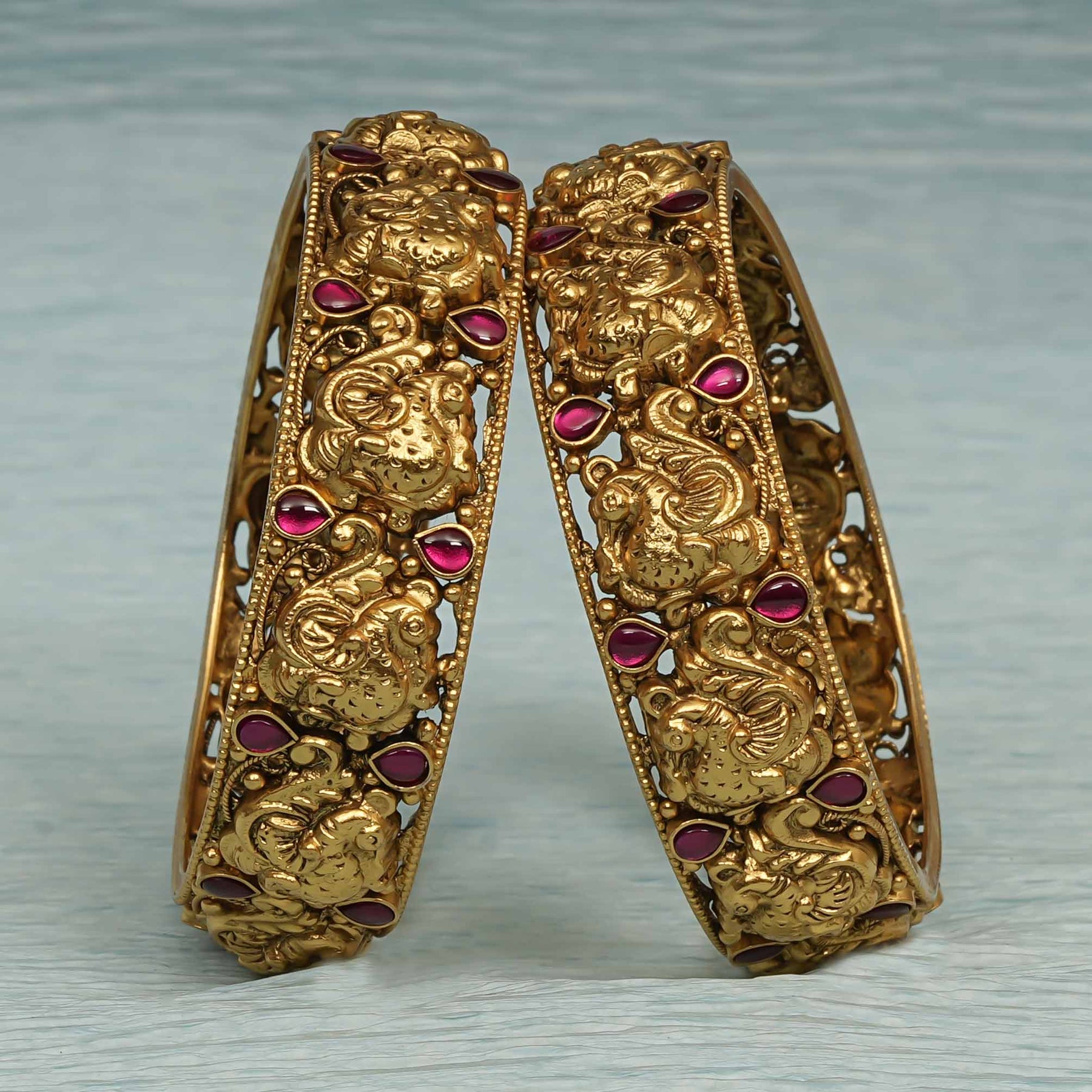 These Temple Kundan Bangles are expertly handcrafted from 92.5% silver, showcasing a unique traditional design that captures the essence of classic temple jewelry. Their intricate craftsmanship offers a rich, real gold appearance, making each piece a one-of-a-kind treasure that elevates any ethnic ensemble with timeless elegance.