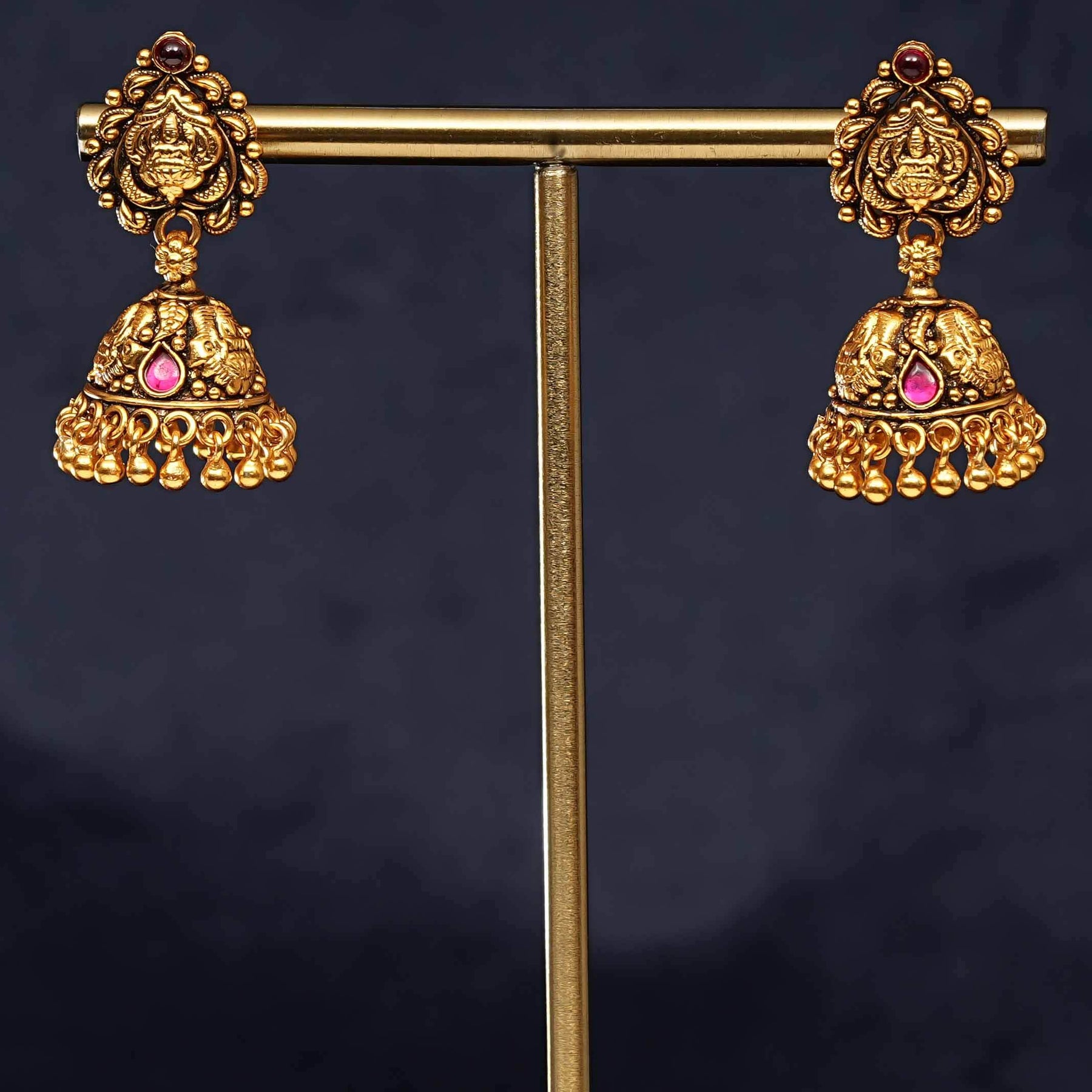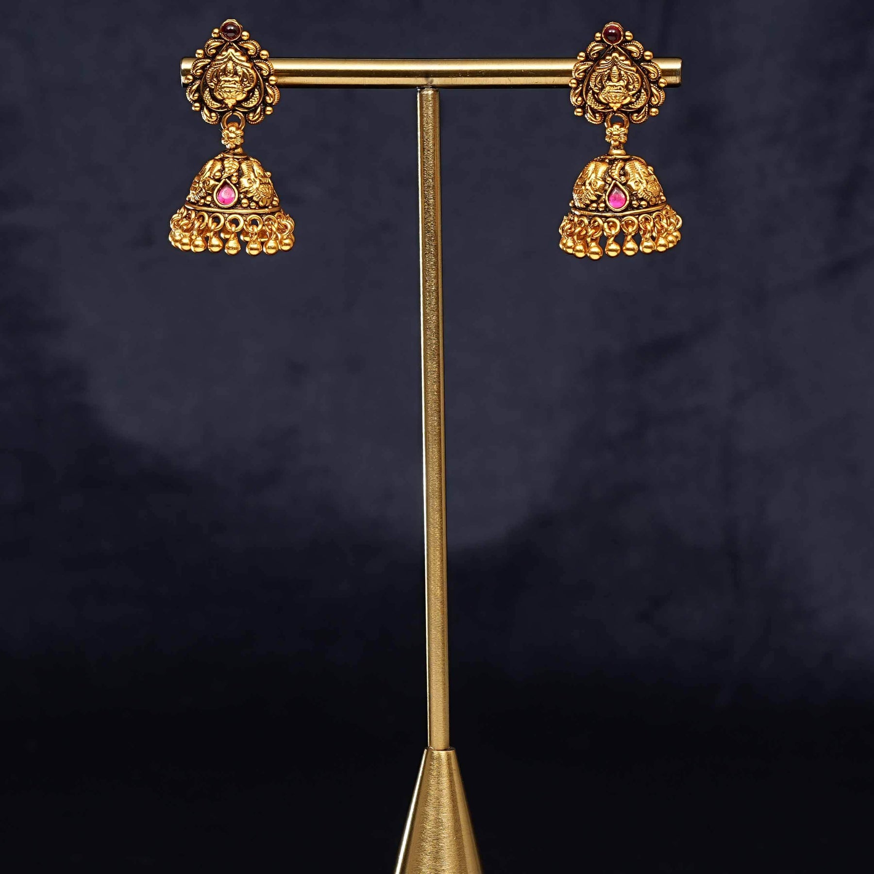 These Temple Jhumka Earrings are expertly crafted in 92.5% sterling silver, designed to emulate the rich, traditional gold look cherished in Indian heritage. Featuring a unique, one-of-a-kind design, they blend timeless elegance with cultural artistry, making them a distinguished addition to any jewelry collection.