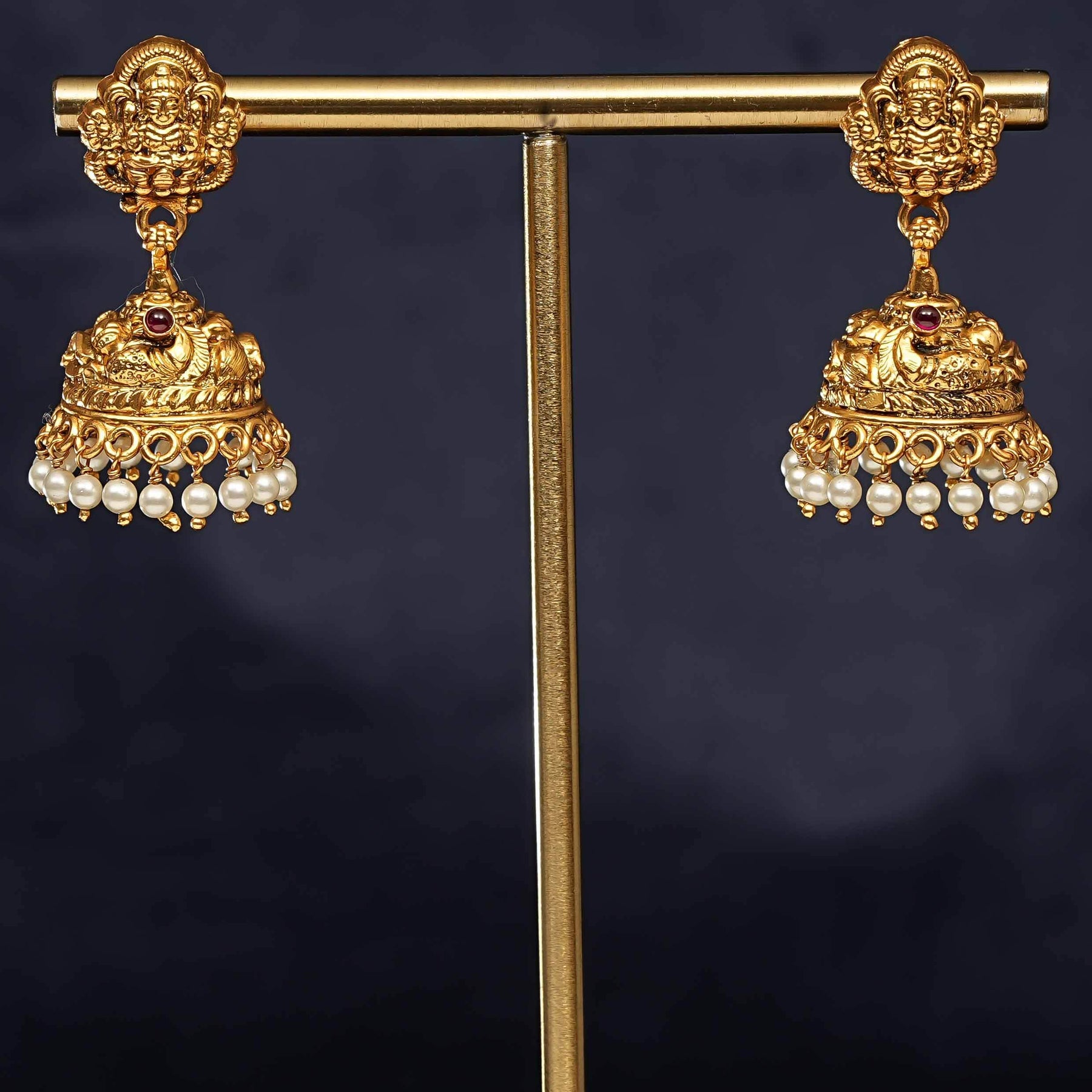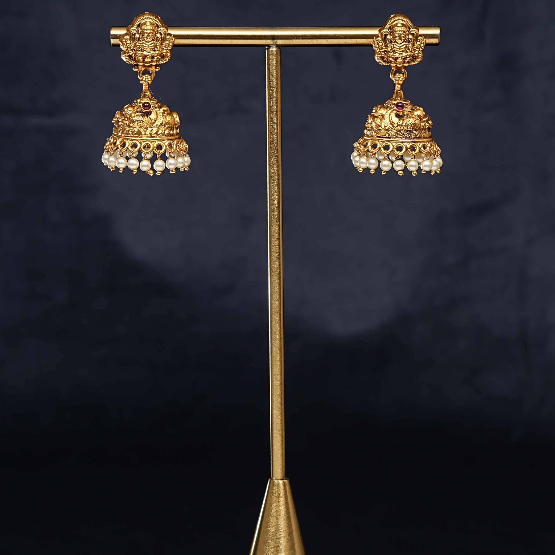 These Temple Jhumka Earrings are expertly crafted in 92.5% sterling silver, designed to emulate the rich gold appearance cherished in Indian tradition. Featuring a unique, one-of-a-kind design, they blend cultural heritage with timeless elegance, making them a distinguished addition to any jewelry collection.