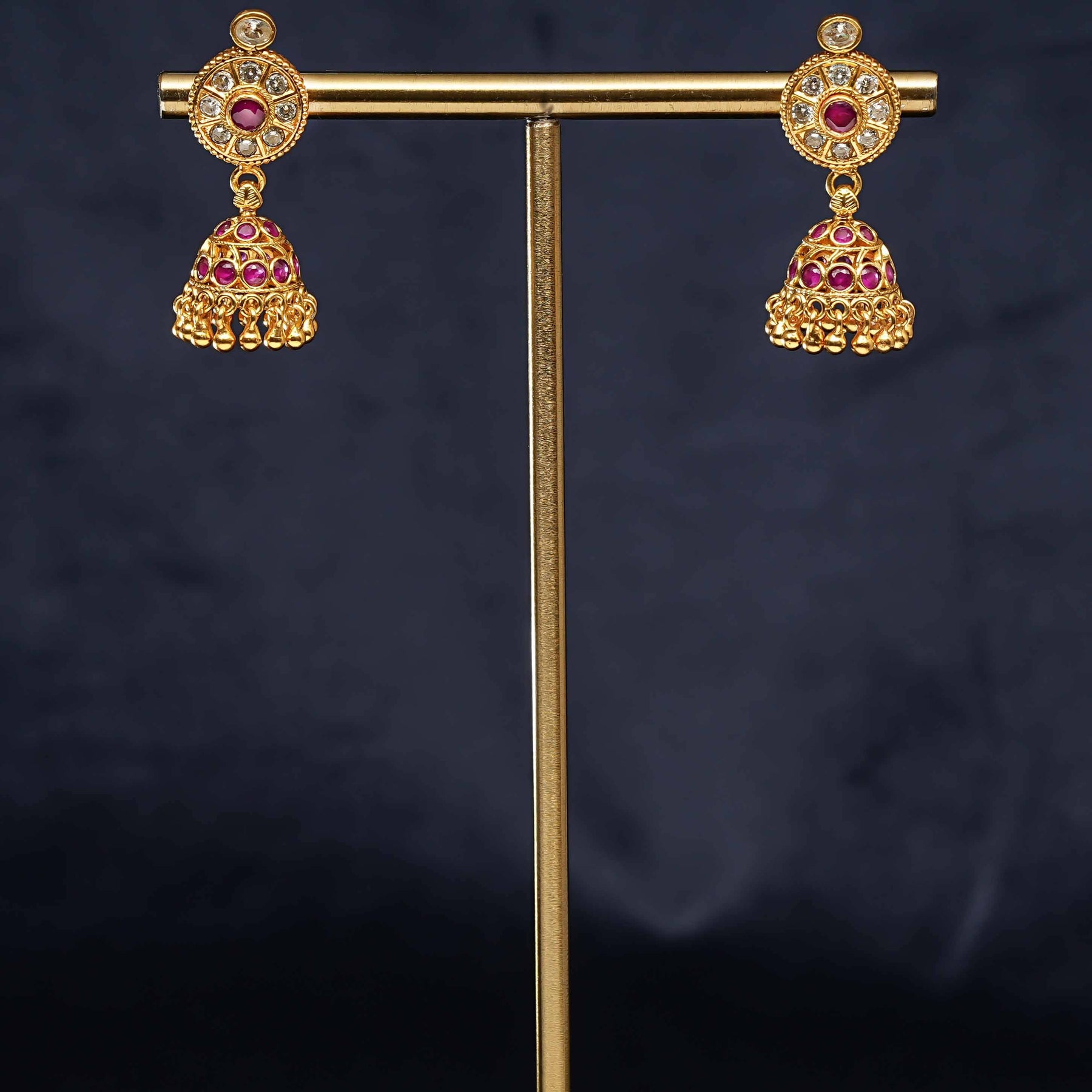 These Temple Jhumka Earrings are expertly crafted in 92.5% sterling silver, designed to emulate the rich, traditional gold look cherished in Indian heritage. Featuring a one-of-a-kind design, they blend timeless elegance with cultural artistry, making them a distinguished addition to any jewelry collection.