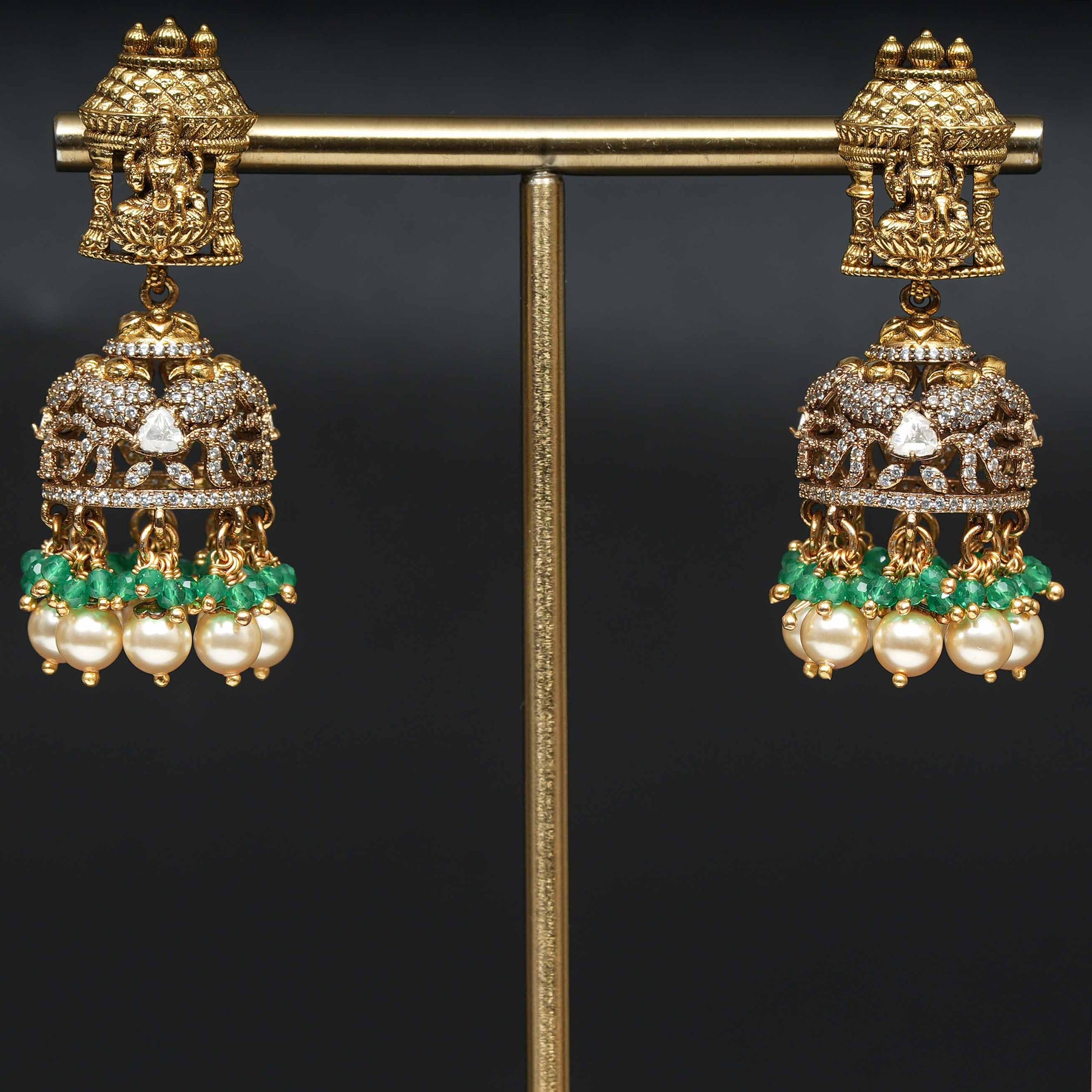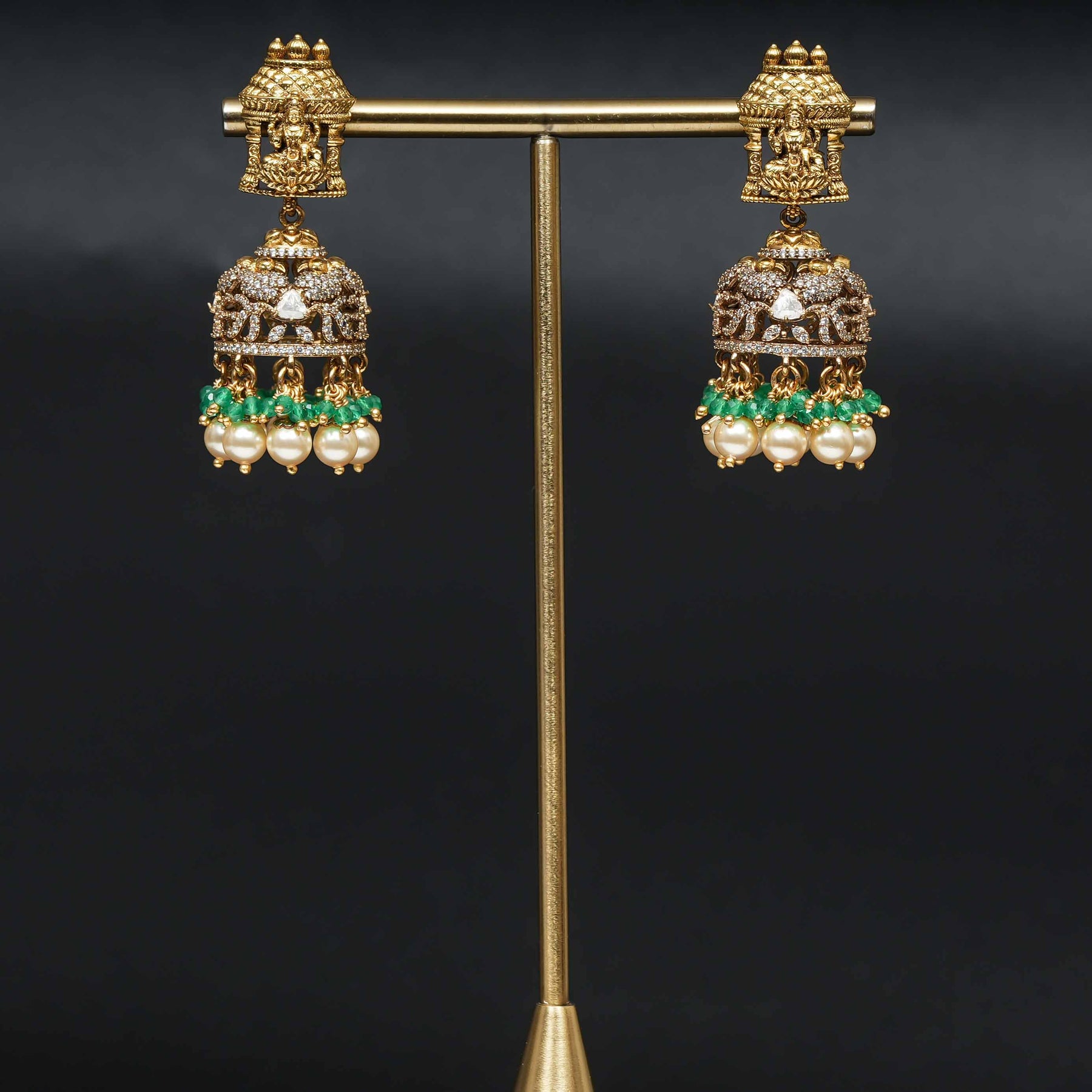 The Temple Moissanite Earrings are meticulously handcrafted from 92.5% sterling silver with a gold-like finish, combining elegance and durability. They feature brilliant moissanite and real cubic zirconia stones, enhancing their sparkle and sophistication. Dangling pearls add a delicate touch to this one-of-a-kind design, making these earrings a refined choice for those who appreciate expert craftsmanship and unique style.