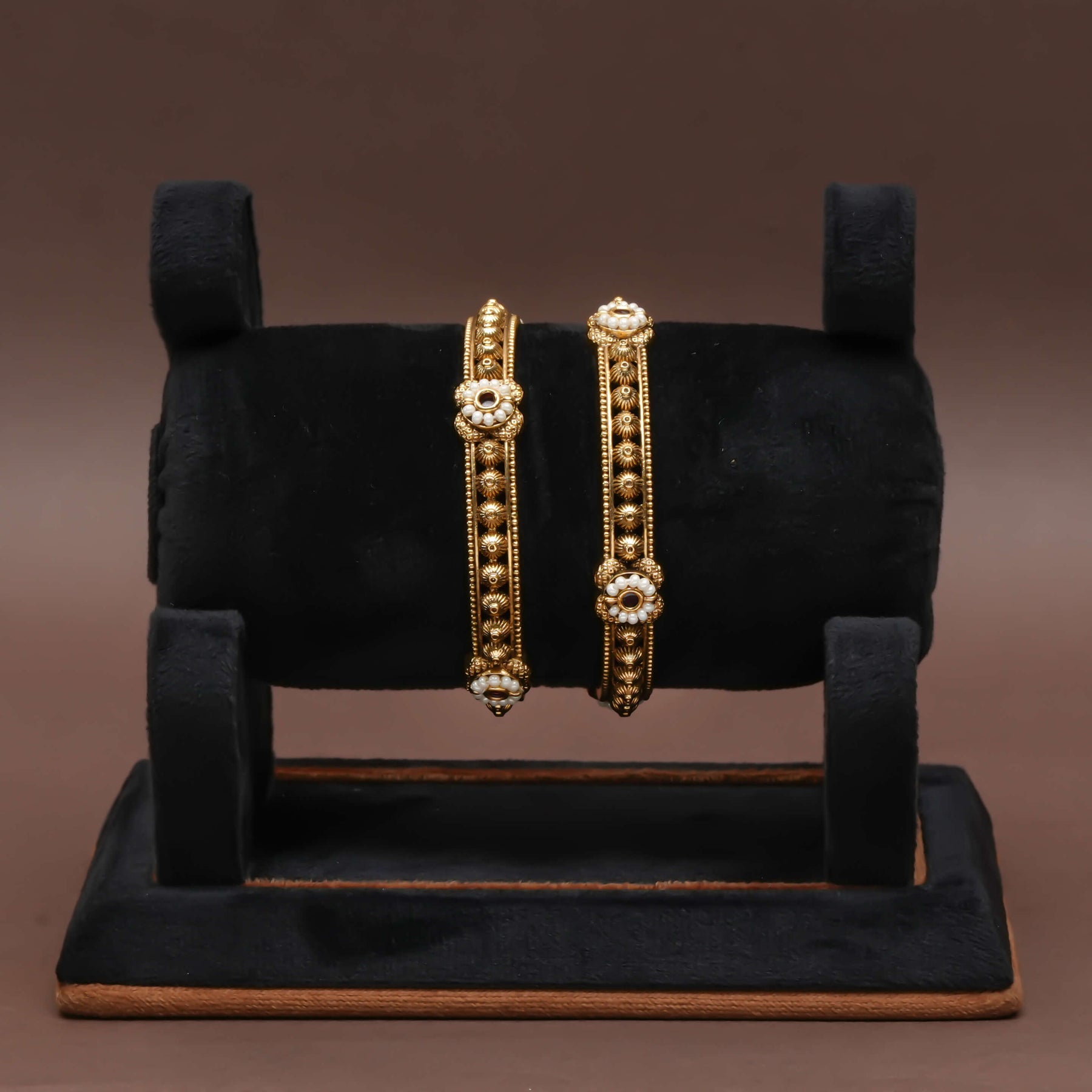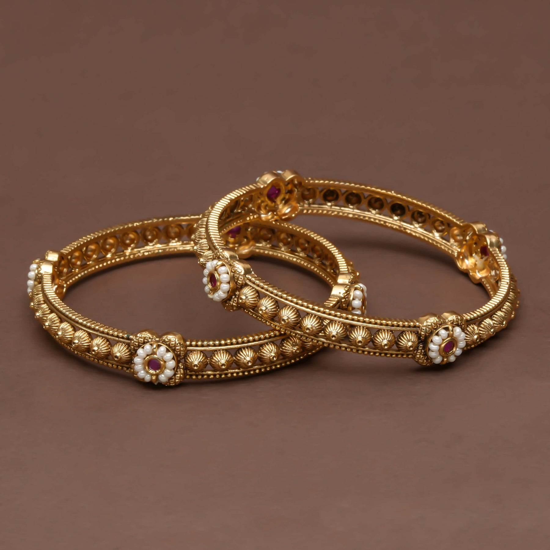 These handcrafted Temple Bangles showcase an exclusive design inspired by traditional motifs, enhanced with semi-precious ruby stones. Each bangle reflects meticulous craftsmanship, offering a sophisticated accessory that complements ethnic attire with timeless elegance. Perfect for those seeking a classic yet distinct statement piece.
