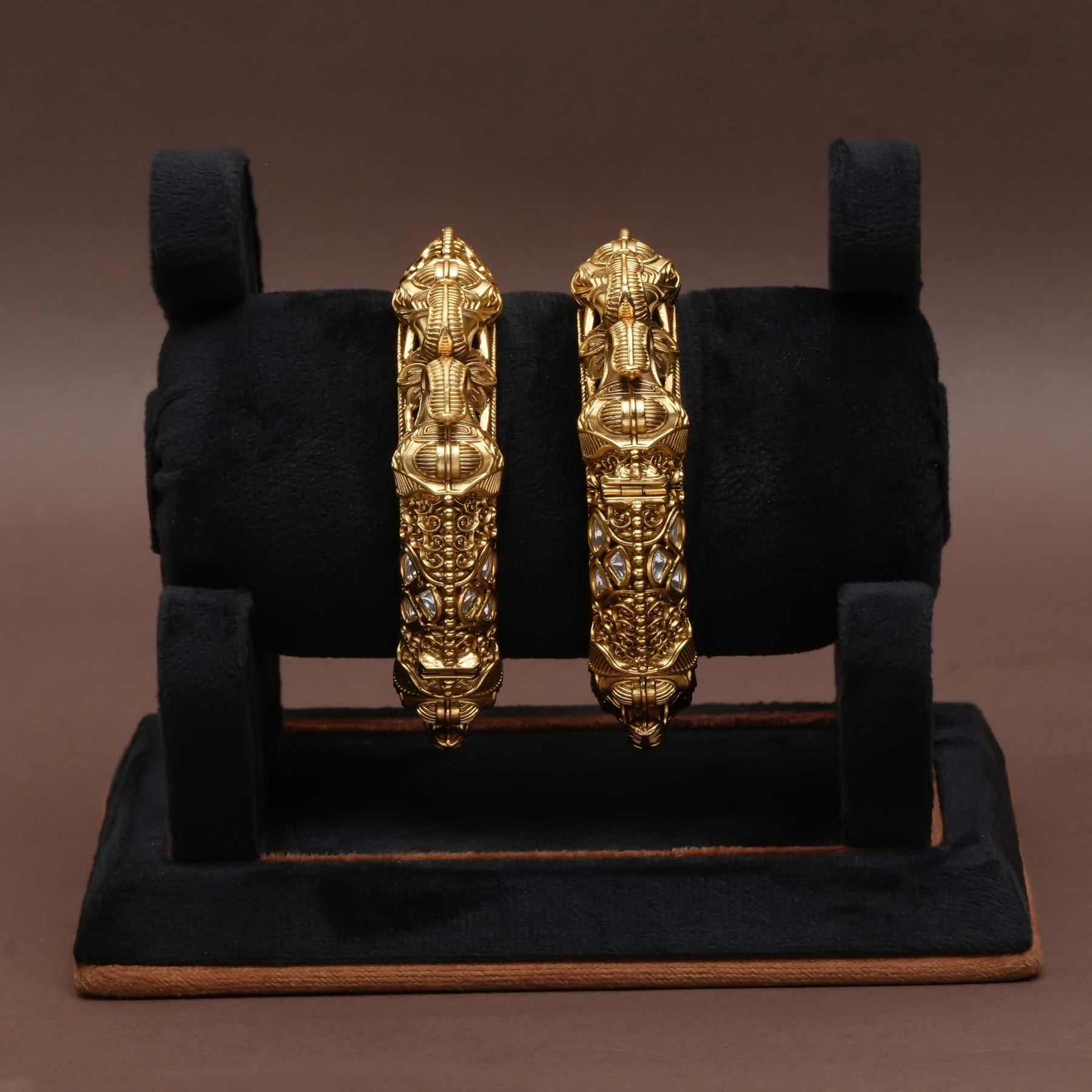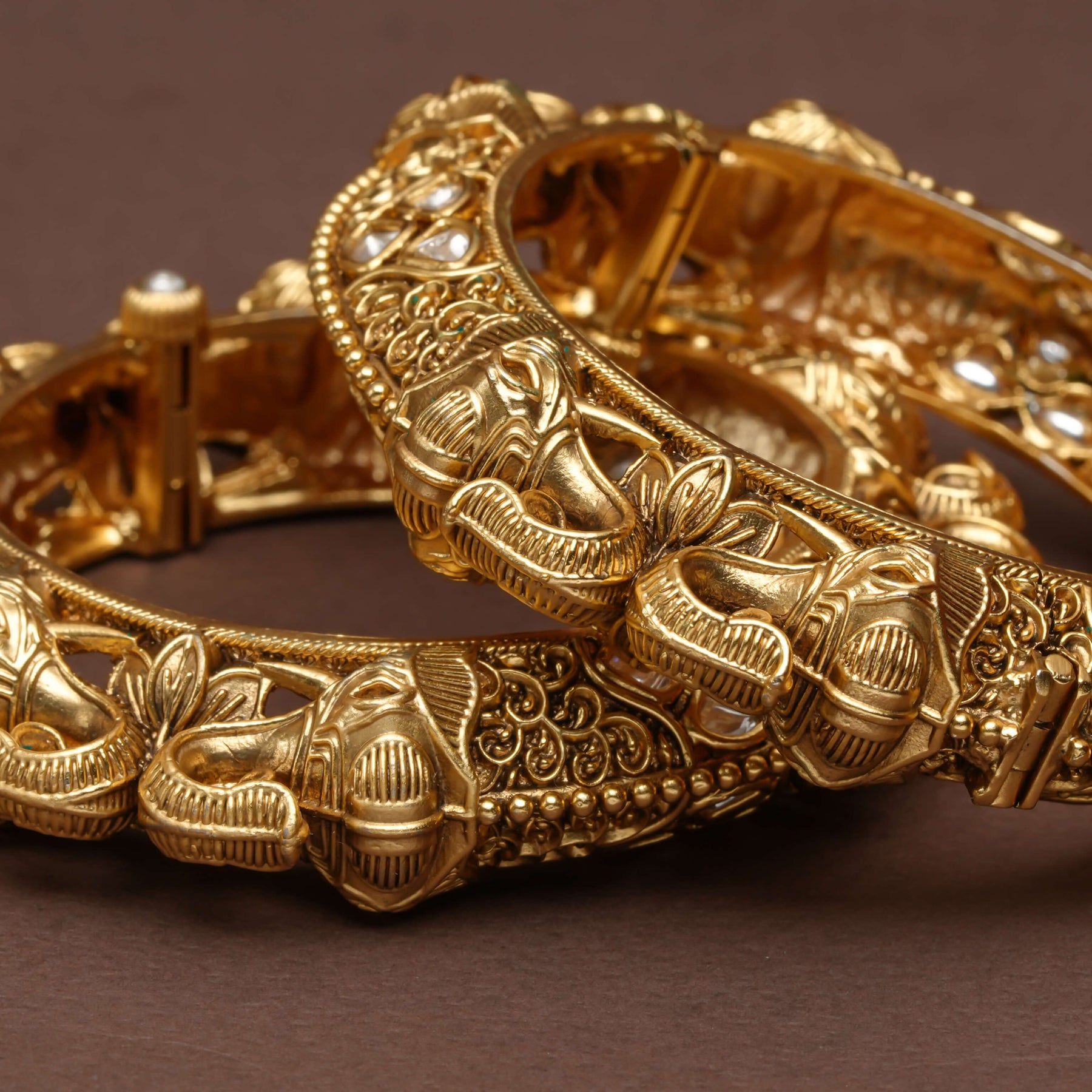 Experience the elegance of our Temple Bangles, expertly handcrafted to showcase a rich, traditional design with the authentic appearance of real gold. Featuring an innovative side screw mechanism, these bangles ensure easy and secure wear without compromising style. Each piece reflects exclusive craftsmanship, making it a timeless addition to your jewelry collection that honors heritage while offering practical comfort.
