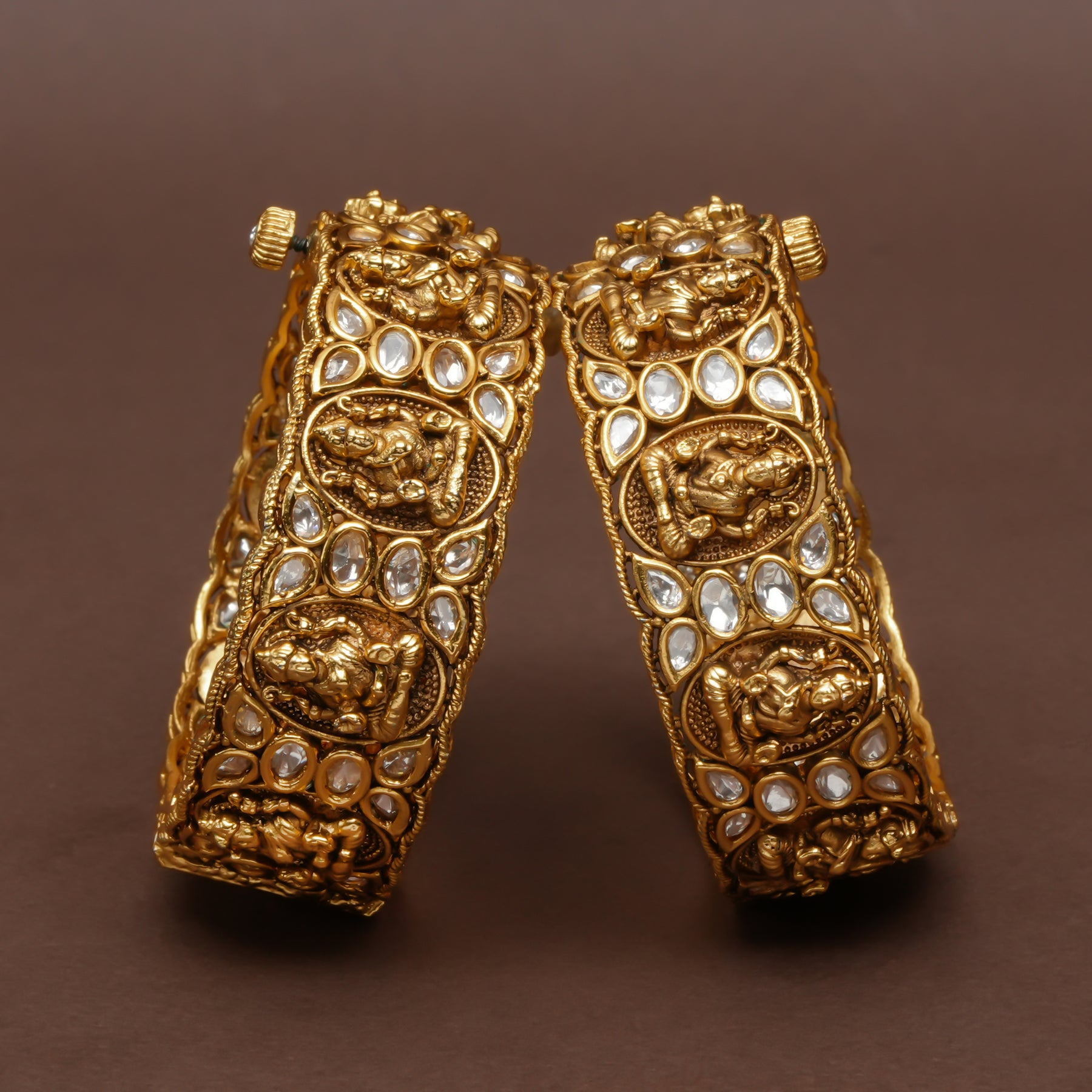 Elevate your traditional jewelry collection with these exquisite temple bangles, meticulously handcrafted in a lustrous gold finish. Each piece is a one-of-a-kind creation, showcasing authentic artisanal craftsmanship that honors classical design principles. The intricate detailing reflects generations of jewelry-making expertise, making these bangles a timeless addition to your ethnic wear. Perfect for festive occasions, weddings, or everyday elegance, these temple bangles combine cultural heritage with refined artistry.