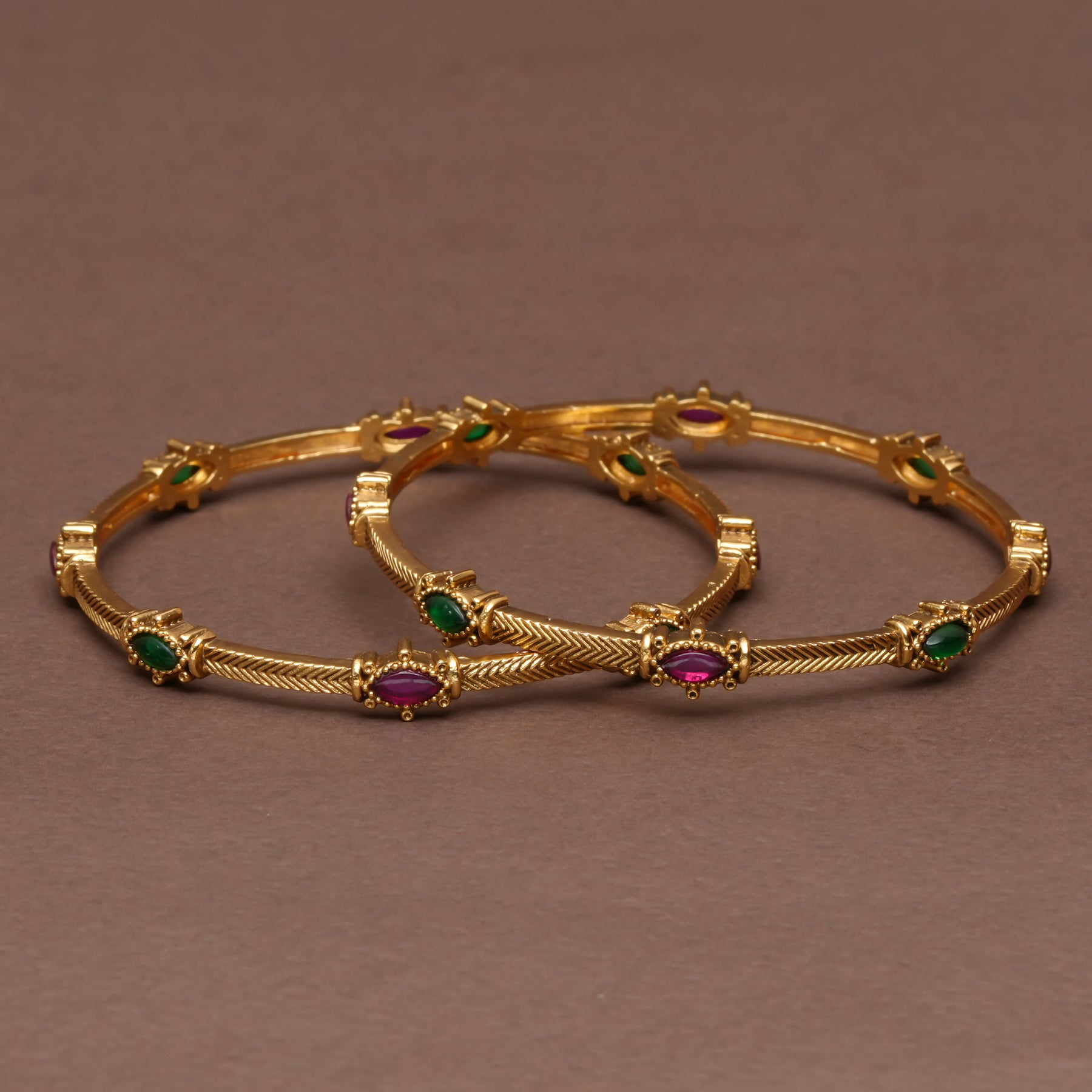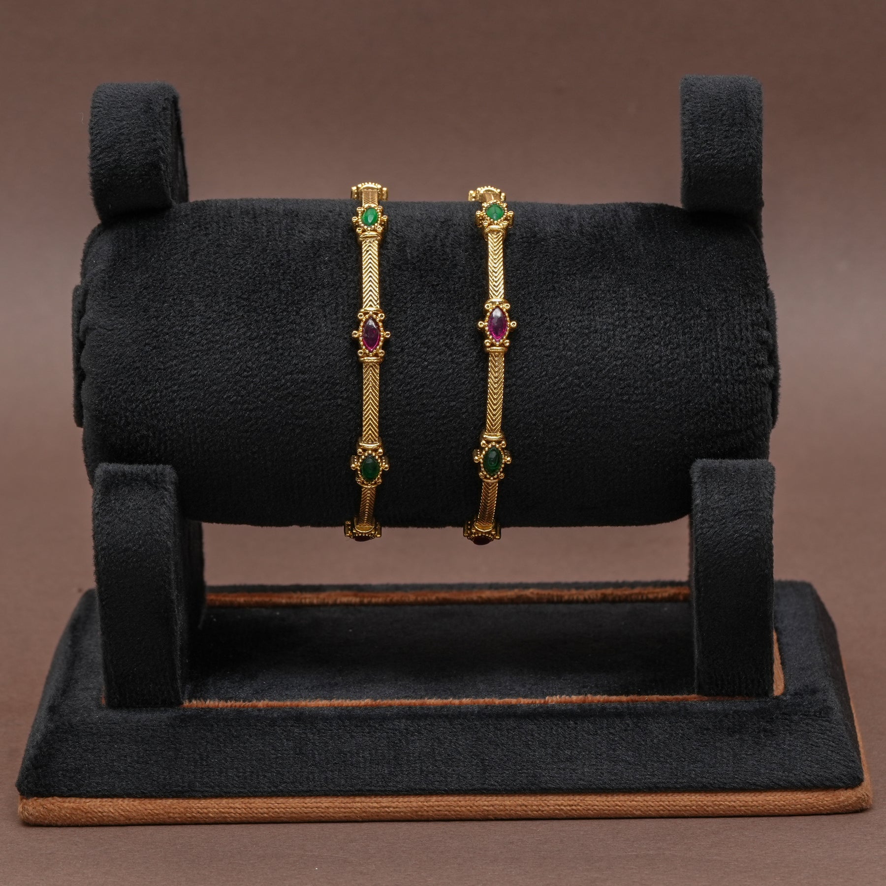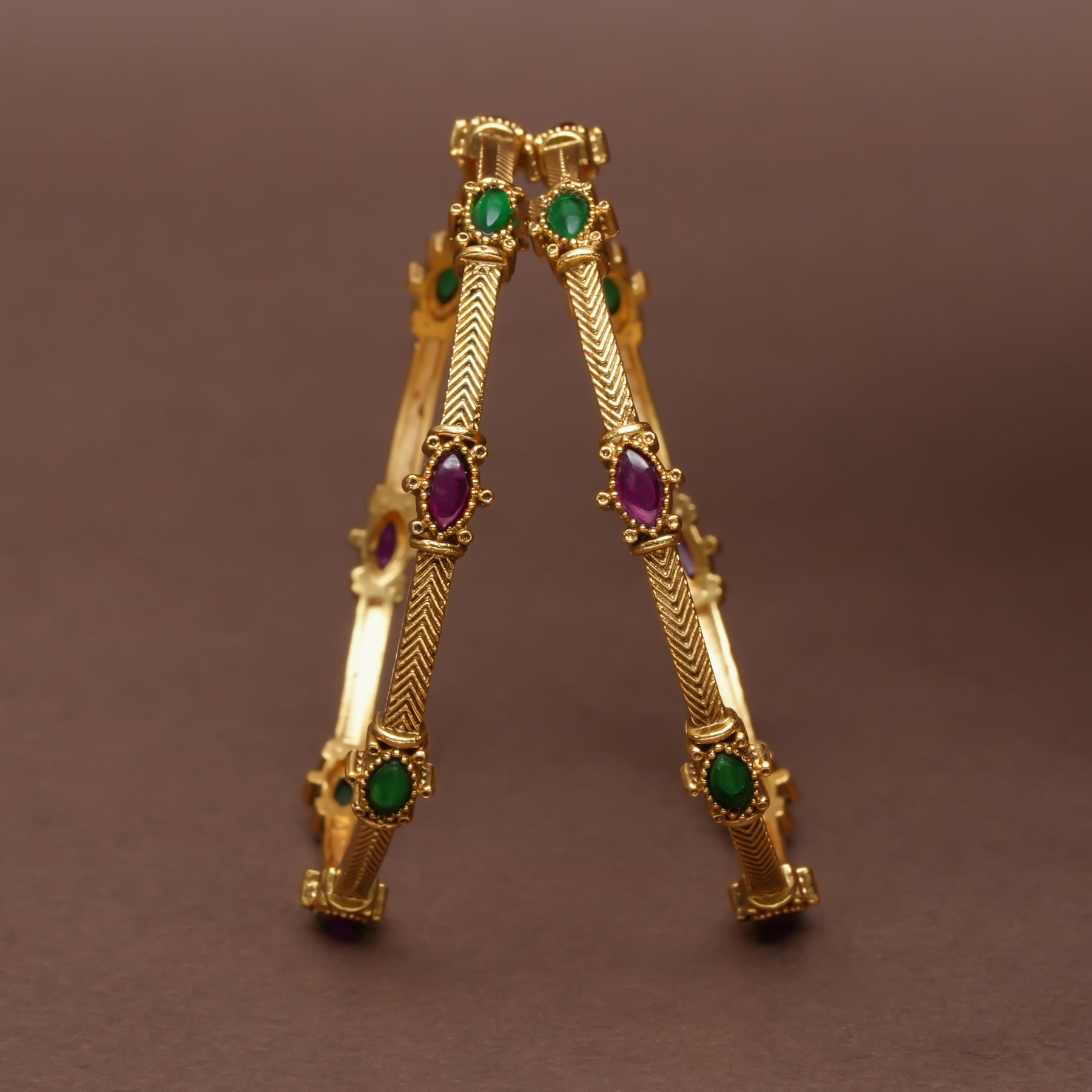 Elevate your traditional jewelry collection with these exquisite temple bangles, meticulously handcrafted in a lustrous gold finish. Each piece is a one-of-a-kind creation, showcasing authentic artisanal craftsmanship that honors classical design principles. The intricate detailing reflects generations of jewelry-making expertise, making these bangles a timeless addition to your ethnic wear. Perfect for festive occasions, weddings, or everyday elegance, these temple bangles combine cultural heritage with refined artistry. Invest in jewelry that tells a story of tradition and unparalleled skill.