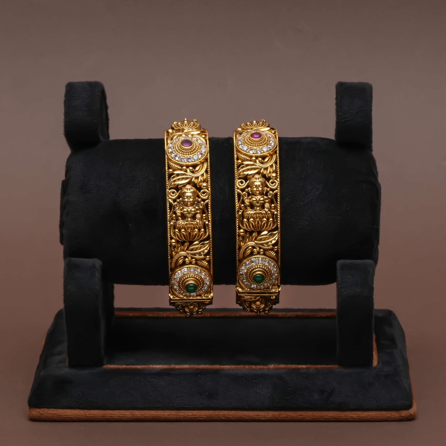 Experience the elegance of tradition with these Temple Bangles, featuring a rich gold finish and adorned with semi-precious rubies and emeralds. Handcrafted with expert precision, each bangle showcases an exclusive design that honors classic artistry while elevating your style. These bangles offer a timeless accessory for those who appreciate fine craftsmanship and cultural heritage.
