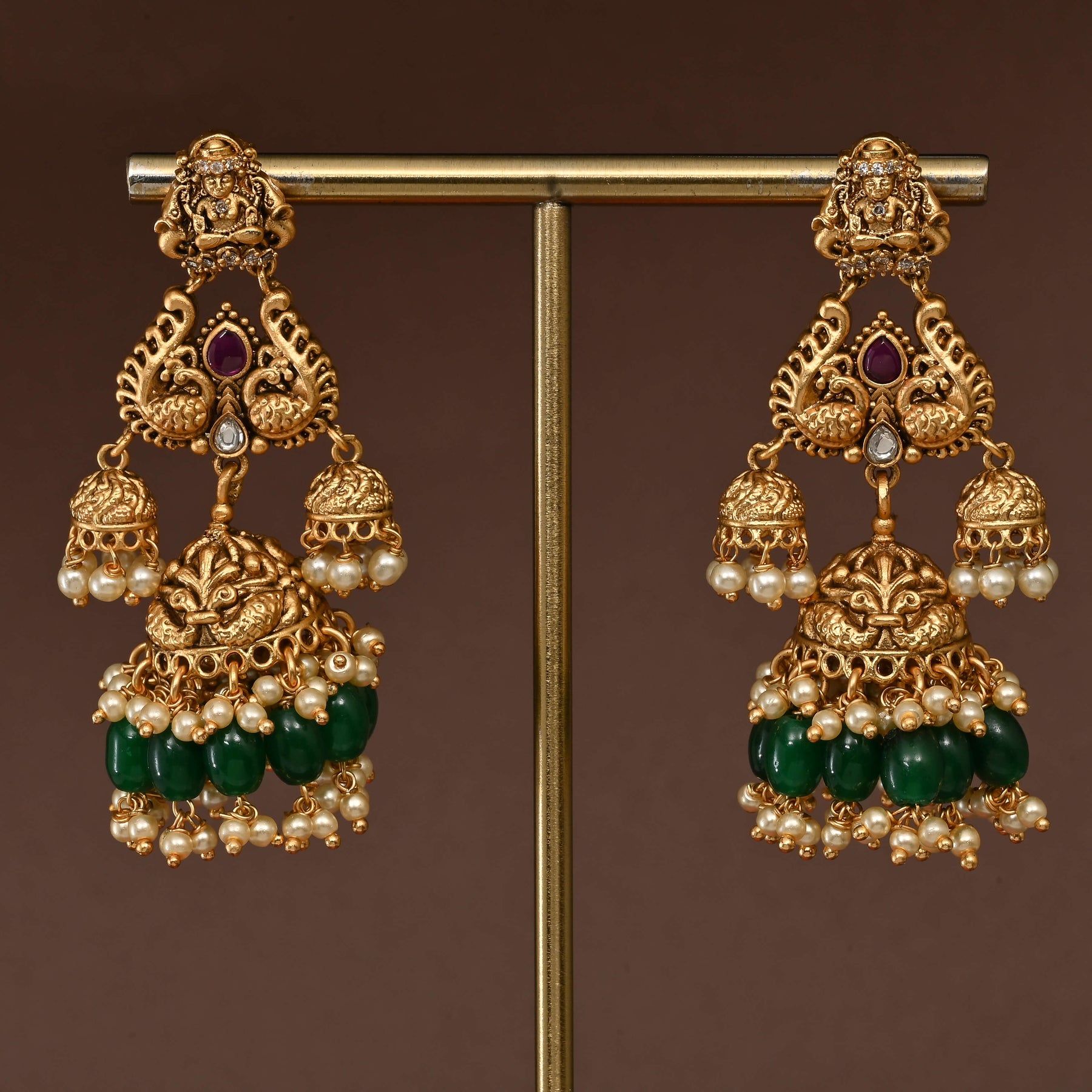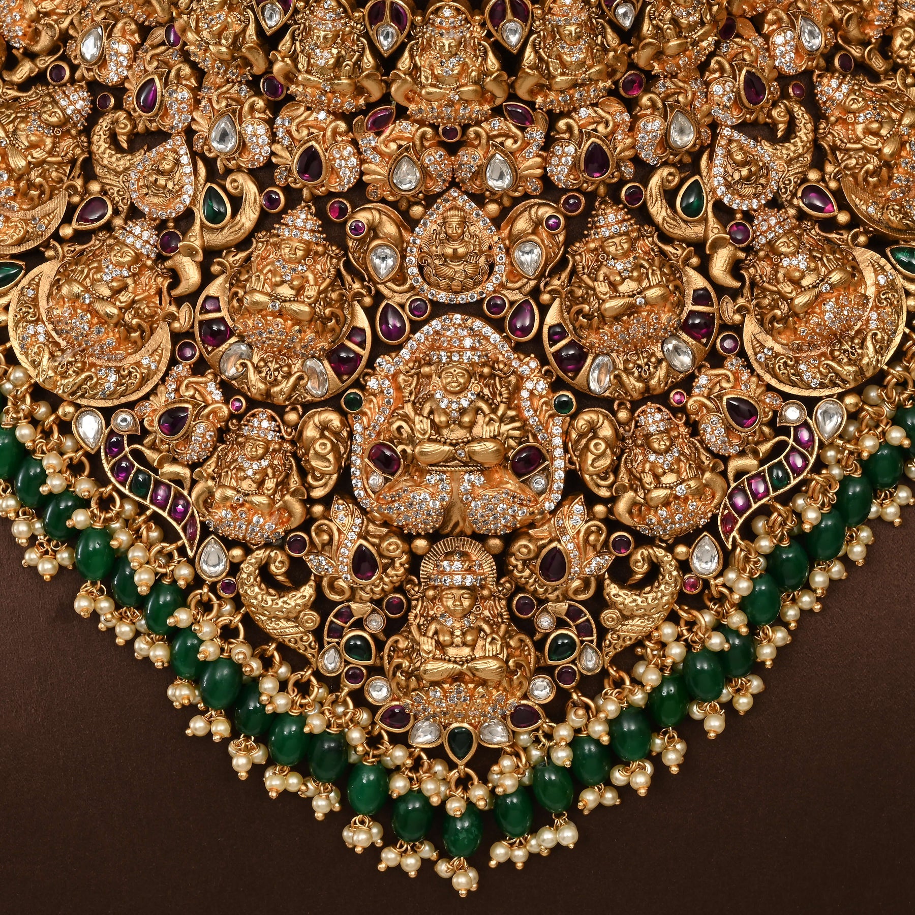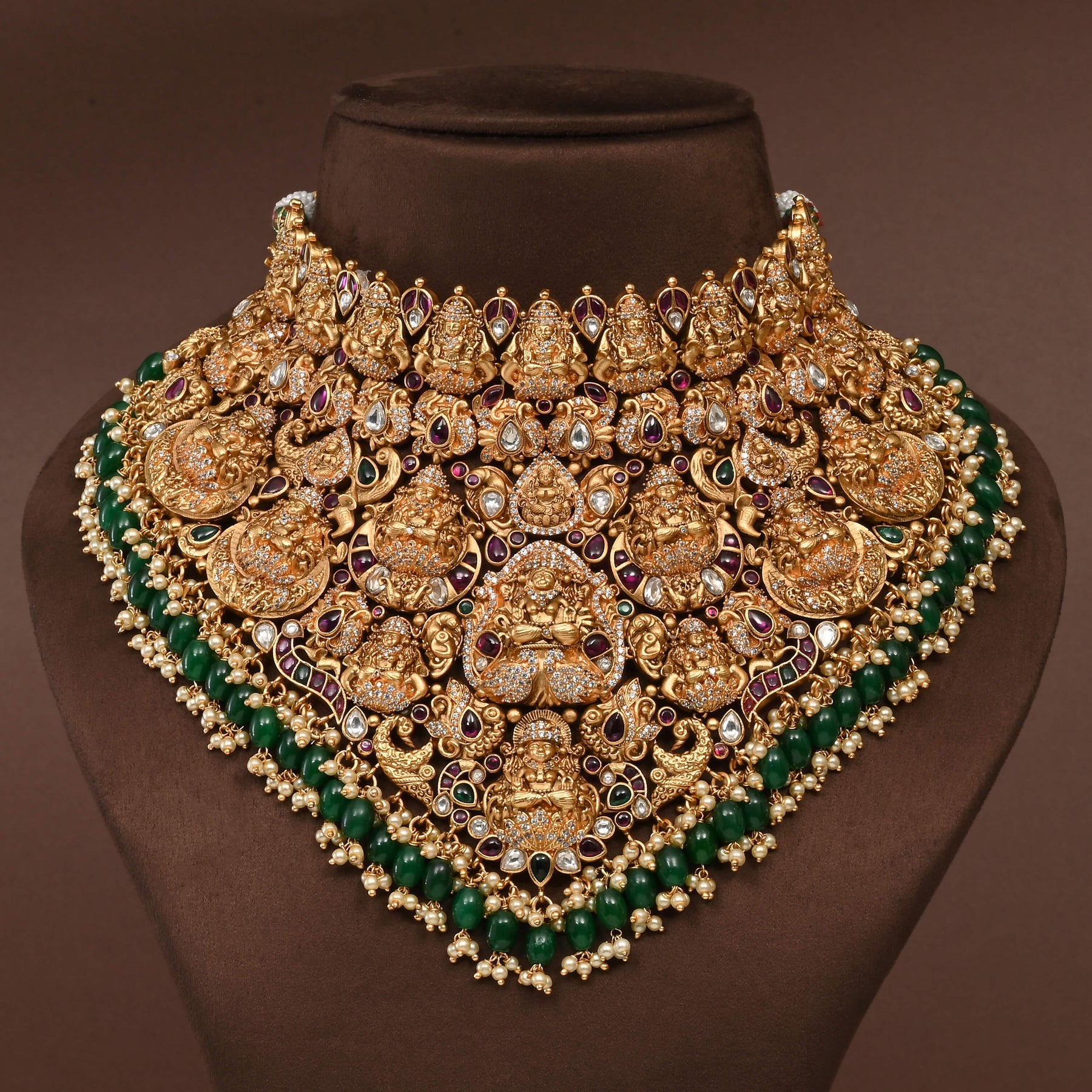 Elevate your bridal ensemble with this exquisite Temple Choker Set, a handcrafted masterpiece featuring a stunning gold finish. Inspired by the divine grace of Goddess Lakshmi, this traditional necklace set embodies timeless elegance and spiritual significance. Each piece is meticulously crafted to create a one-of-a-kind treasure, blending authentic temple artistry with contemporary sophistication. Perfect for weddings and special occasions, this set captures the essence of heritage craftsmanship while radiating luxurious appeal. A true collector's piece that honors tradition.