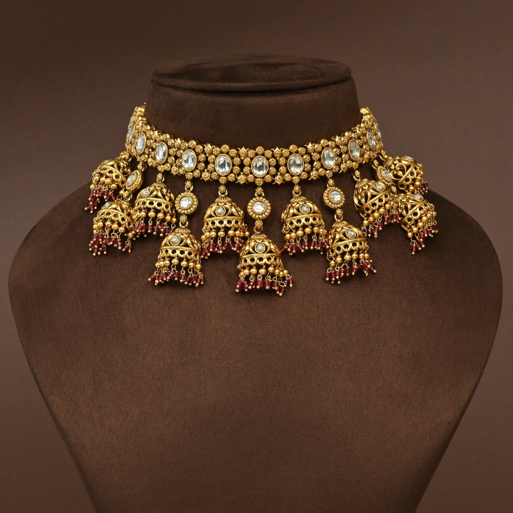 Embrace timeless elegance with this exquisite Temple Choker Set, a masterpiece of traditional craftsmanship. Featuring an authentic gold finish that captures the lustre of precious metal, this handcrafted ensemble showcases intricate jhumka design elements that reflect centuries of artisanal heritage. Each piece is meticulously created, making it truly one of a kind. Perfect for special occasions or adding a touch of cultural sophistication to your everyday wear, this choker set represents the finest in traditional jewellery artistry.