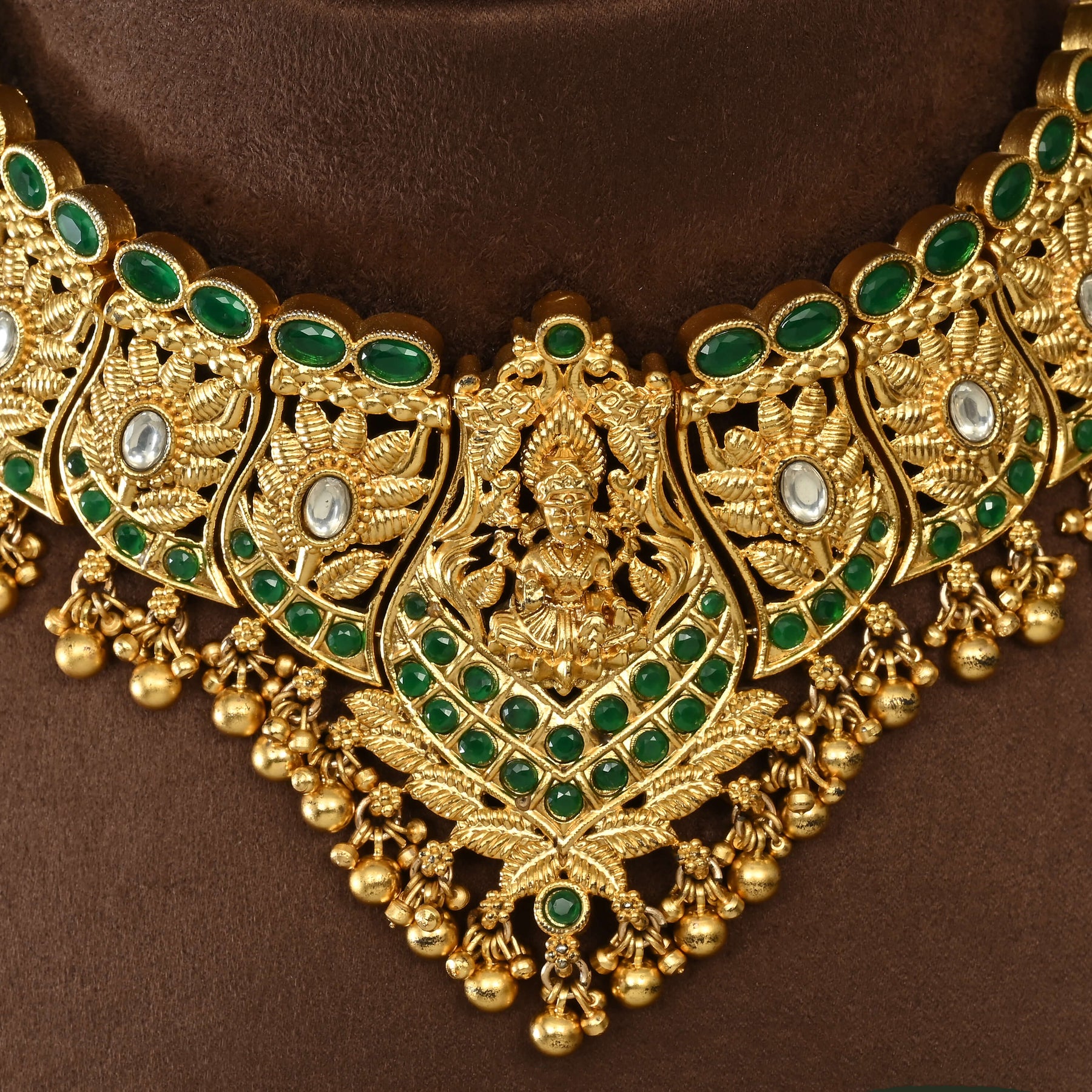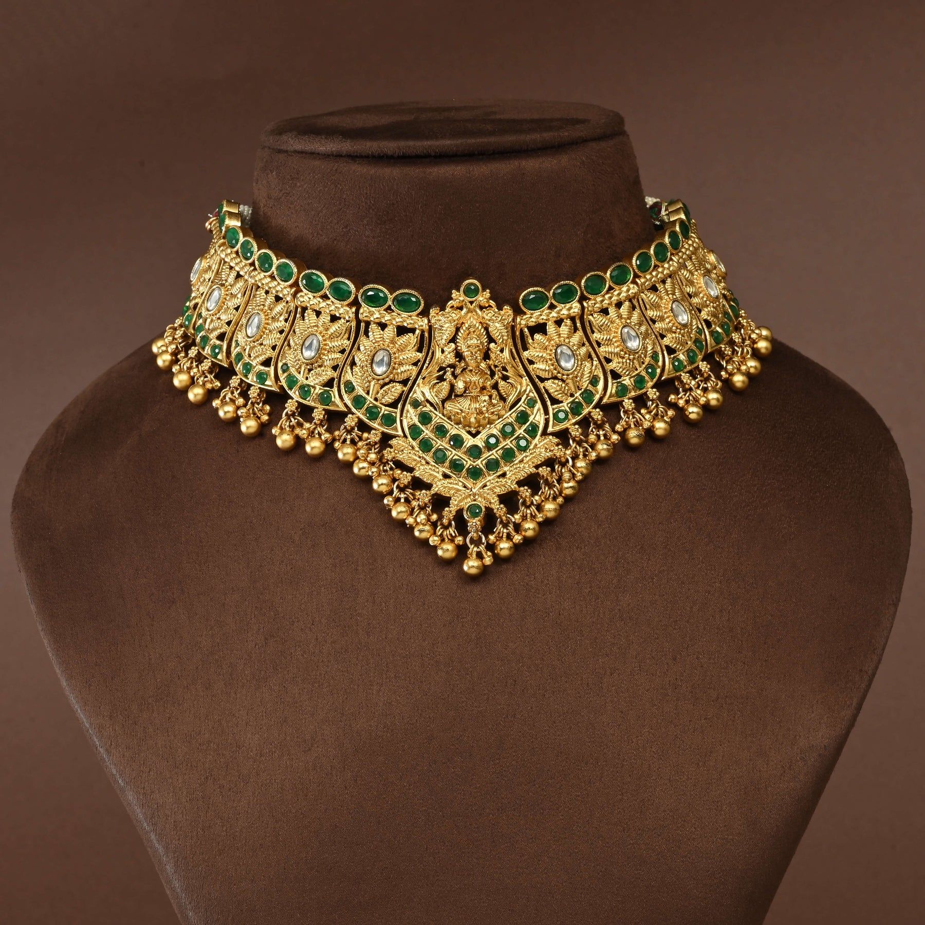 Elevate your traditional ensemble with this exquisite Temple Choker Set, a handcrafted masterpiece inspired by divine aesthetics. Featuring an authentic gold finish, this one-of-a-kind piece captures the essence of Goddess Lakshmi with intricate temple-inspired detailing. Each choker is meticulously crafted by skilled artisans, ensuring exceptional quality and timeless elegance. Perfect for festivals, weddings, and special occasions, this set embodies the grace and sophistication of traditional Indian jewelry craftsmanship.