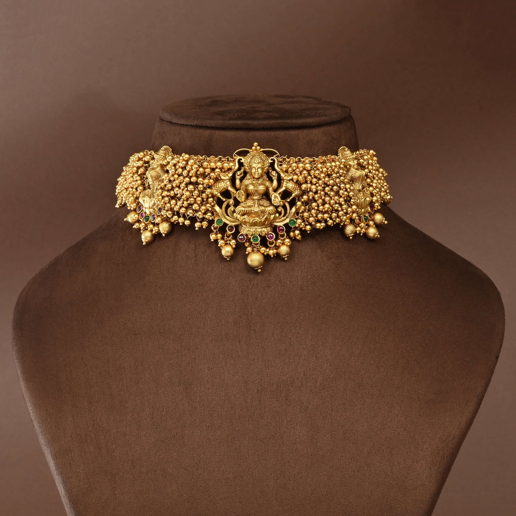 Embrace divine elegance with this exquisite Temple Choker Set, a handcrafted masterpiece inspired by Goddess Lakshmi's timeless grace. Featuring an authentic gold finish, this traditional choker captures the essence of temple jewelry with intricate detailing that reflects centuries of artisanal craftsmanship. Each piece is uniquely created, making it a one-of-a-kind treasure perfect for special occasions, festivals, or those who appreciate authentic heritage jewelry. A stunning addition to any collection that honors both tradition and individual style.