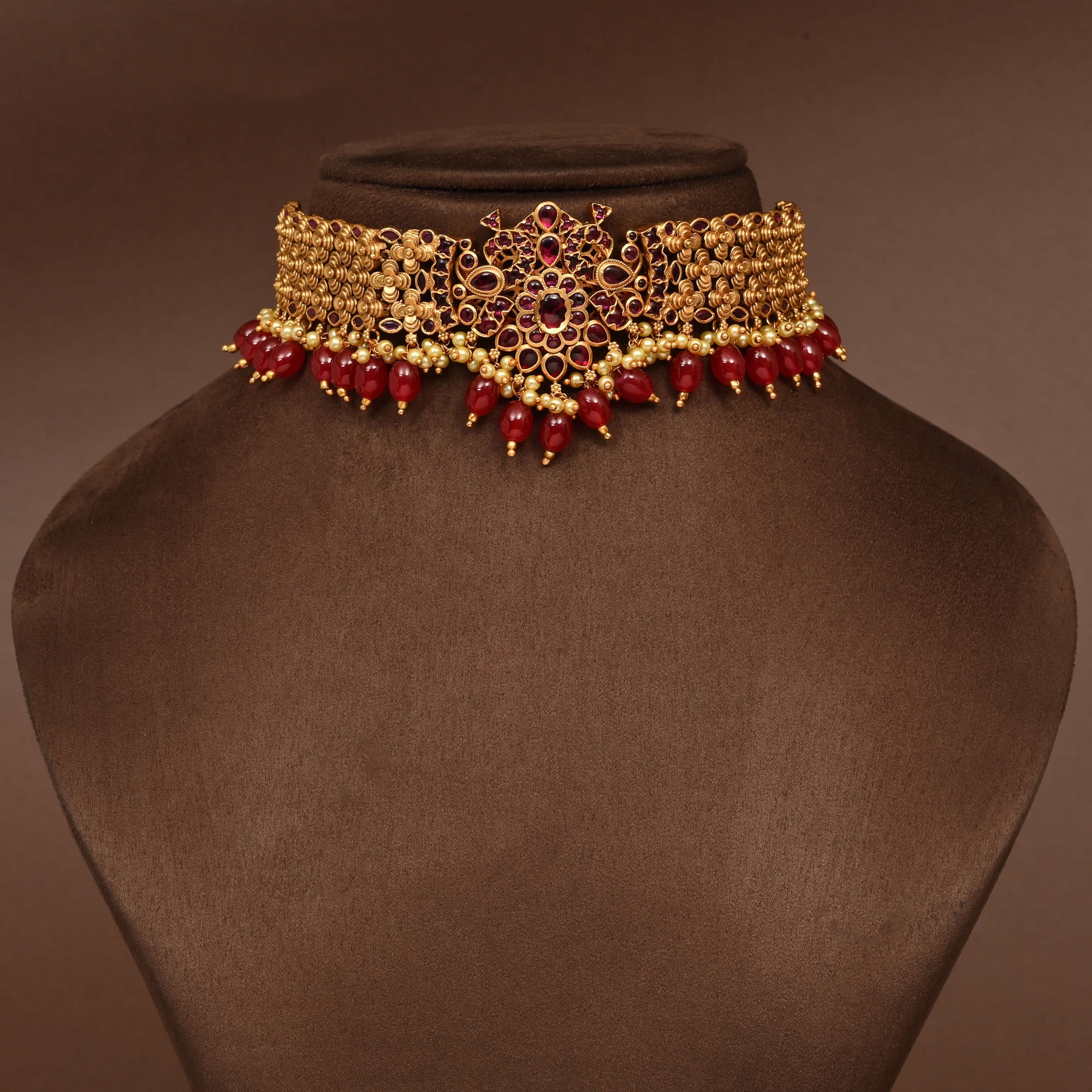 Temple Choker Set features an authentic gold finish that captures the timeless elegance of traditional Indian jewelry. Each piece is meticulously handcrafted, showcasing intricate detailing that reflects centuries-old artisanal techniques. The one-of-a-kind design ensures you own a distinctive accessory that stands apart from mass-produced alternatives. Perfect for festive occasions, weddings, or adding a touch of cultural sophistication to your everyday ensemble. This temple choker combines heritage craftsmanship with contemporary styling.