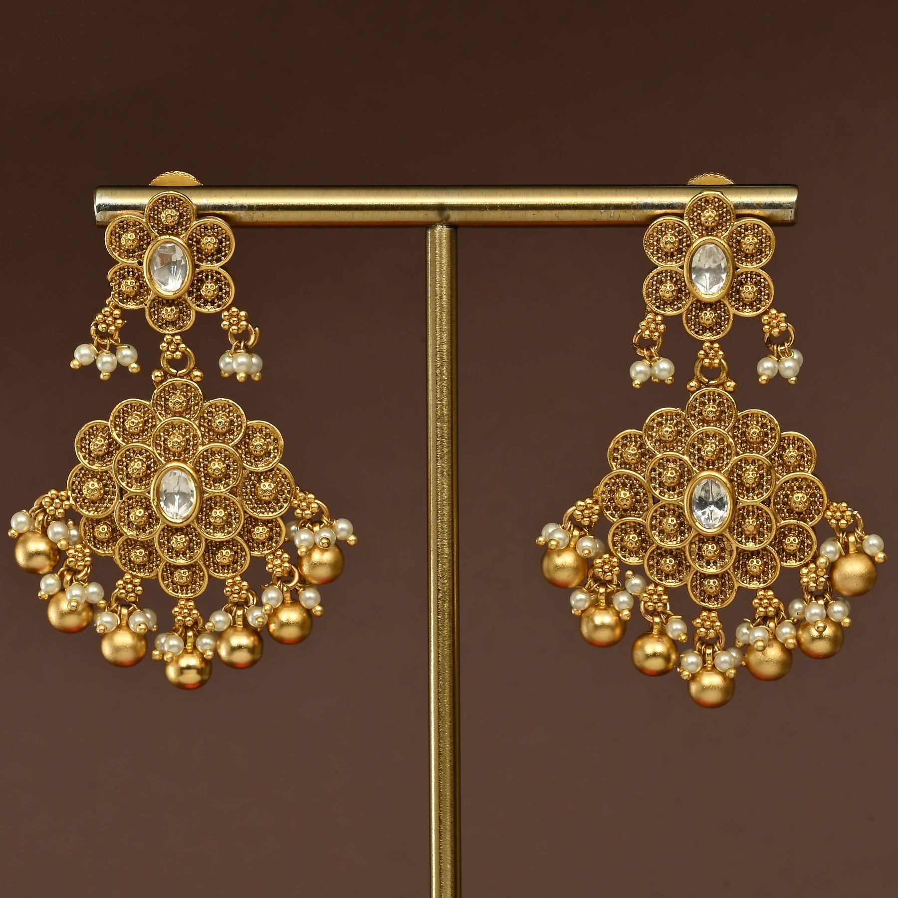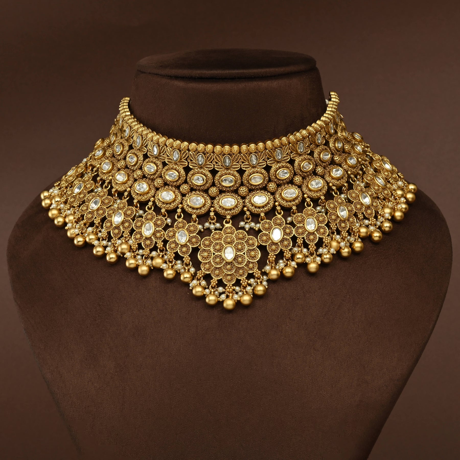 Temple Choker Set showcases authentic craftsmanship with its distinctive gold finish and traditional design. Each piece is meticulously handcrafted, capturing the essence of classical temple jewelry aesthetics. The one-of-a-kind nature of this choker ensures you possess a truly unique accessory that reflects timeless elegance and artisanal excellence. Perfect for those who appreciate heritage-inspired jewelry with genuine character and individuality.