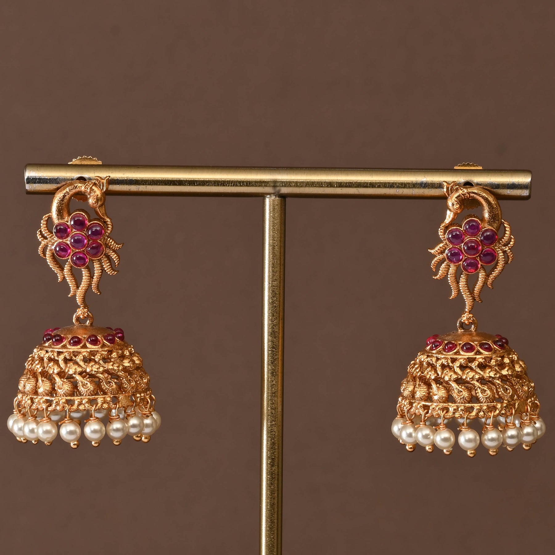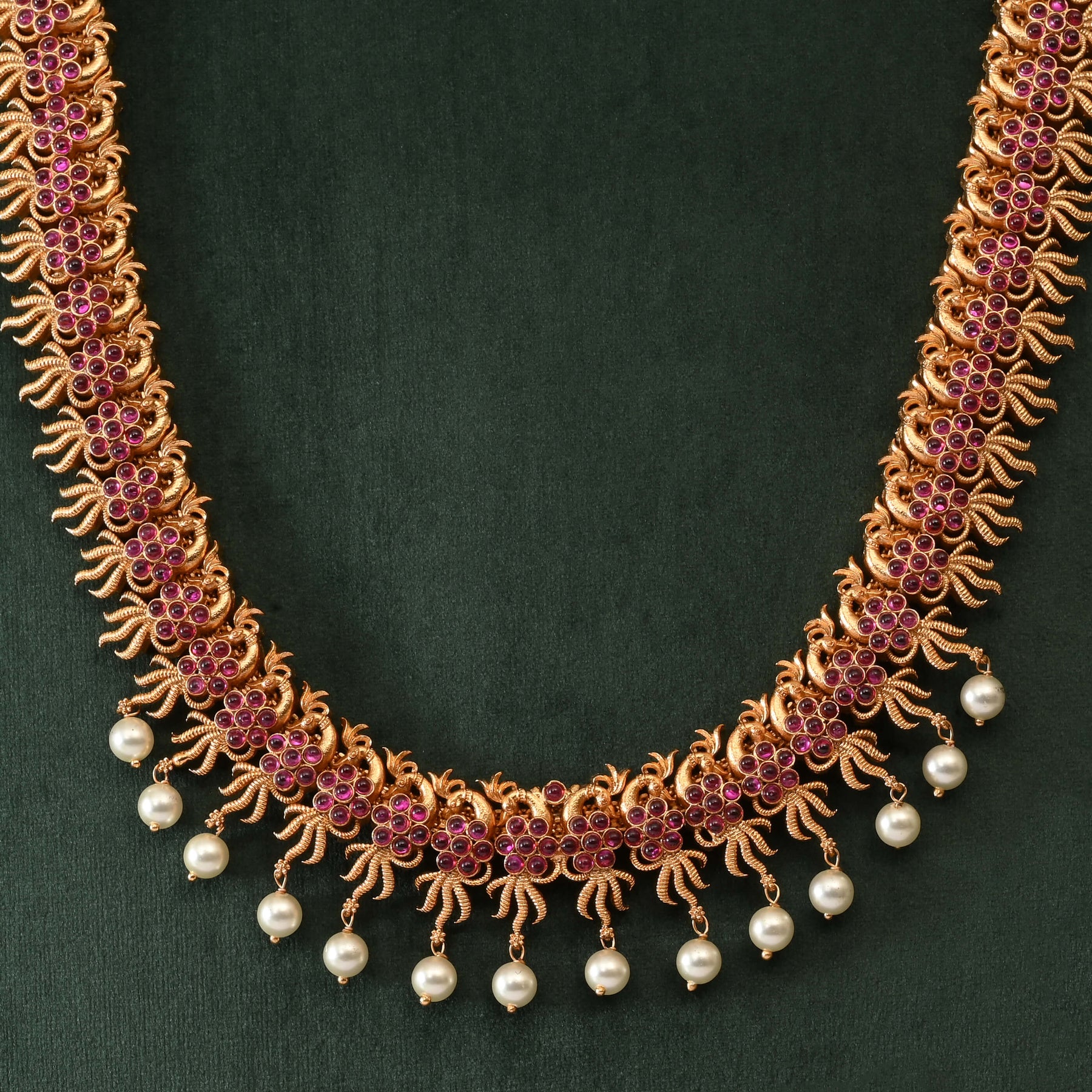 This exquisite Temple Long Necklace features a luxurious gold finish paired with semi-precious ruby stones, offering the rich appearance of real gold. Its one-of-a-kind traditional design highlights intricate craftsmanship, making it an elegant statement piece perfect for cultural and festive occasions. Combining timeless appeal with expert artistry, this necklace set enhances any ensemble with regal sophistication.