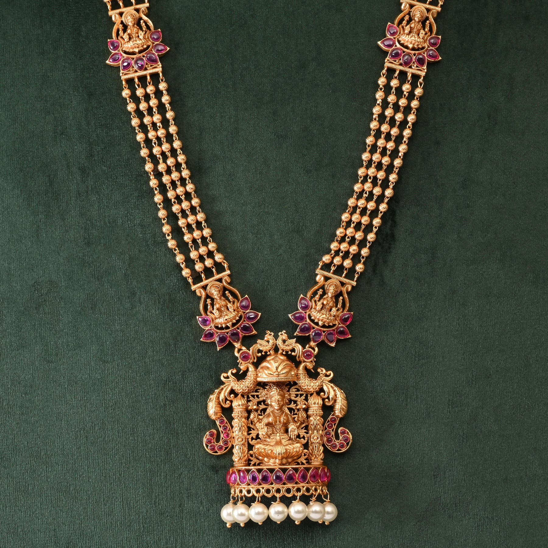 This Temple Long Necklace features a unique traditional design inspired by goddess Lakshmi, crafted in a rich gold finish that mimics the brilliance of real gold. Its detailed artistry and one-of-a-kind style make it an exquisite statement piece, perfect for complementing ethnic attire with timeless elegance.