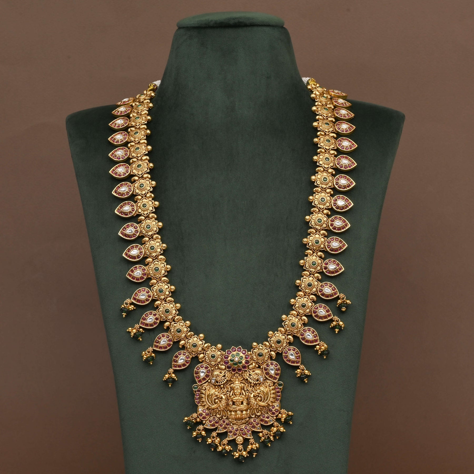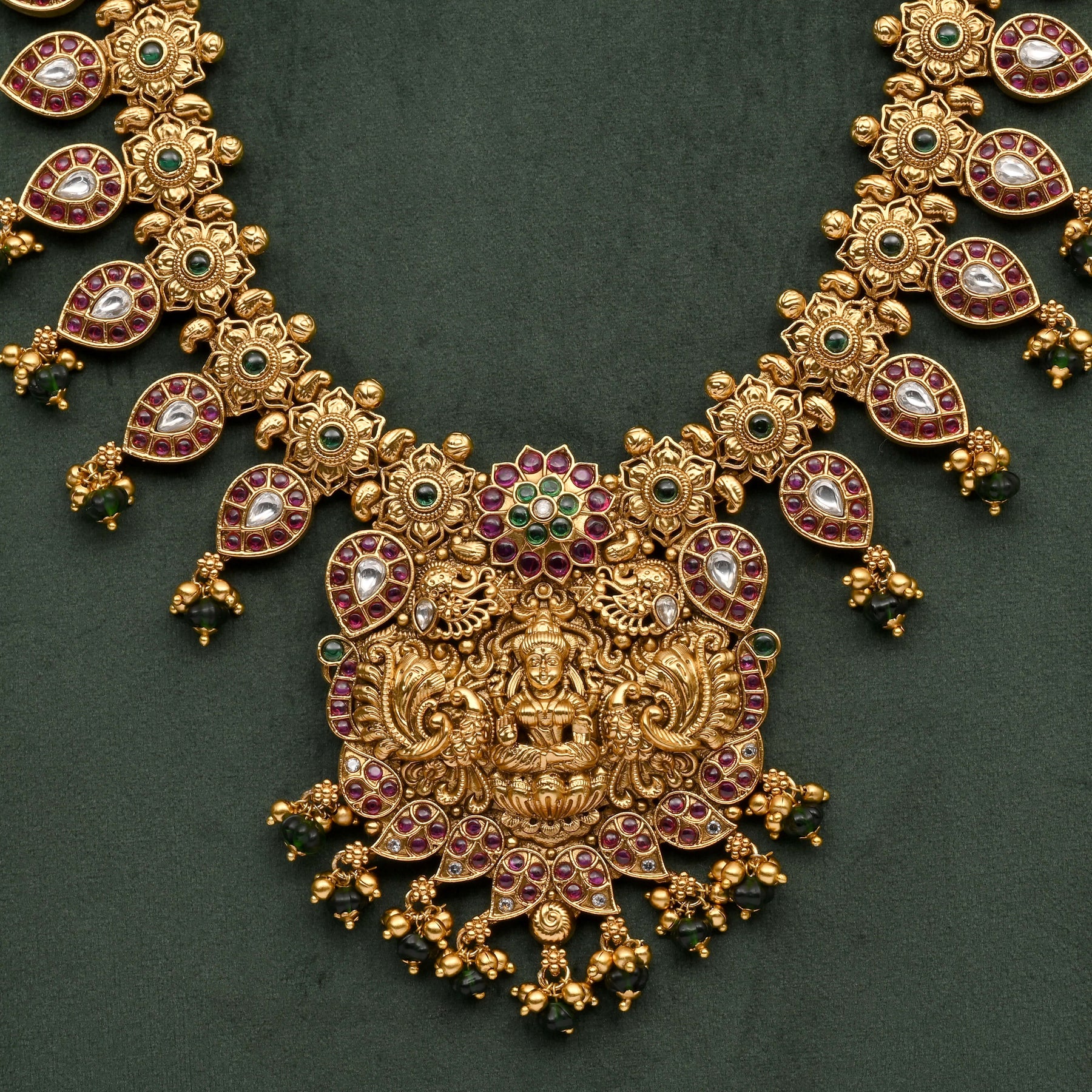 This handcrafted Temple Necklace Set exudes traditional elegance with its intricate design inspired by the goddess Lakshmi. Finished to resemble real gold, it offers the timeless charm of authentic temple jewelry while ensuring exclusivity. Perfect for those seeking a classic statement piece rooted in cultural heritage.