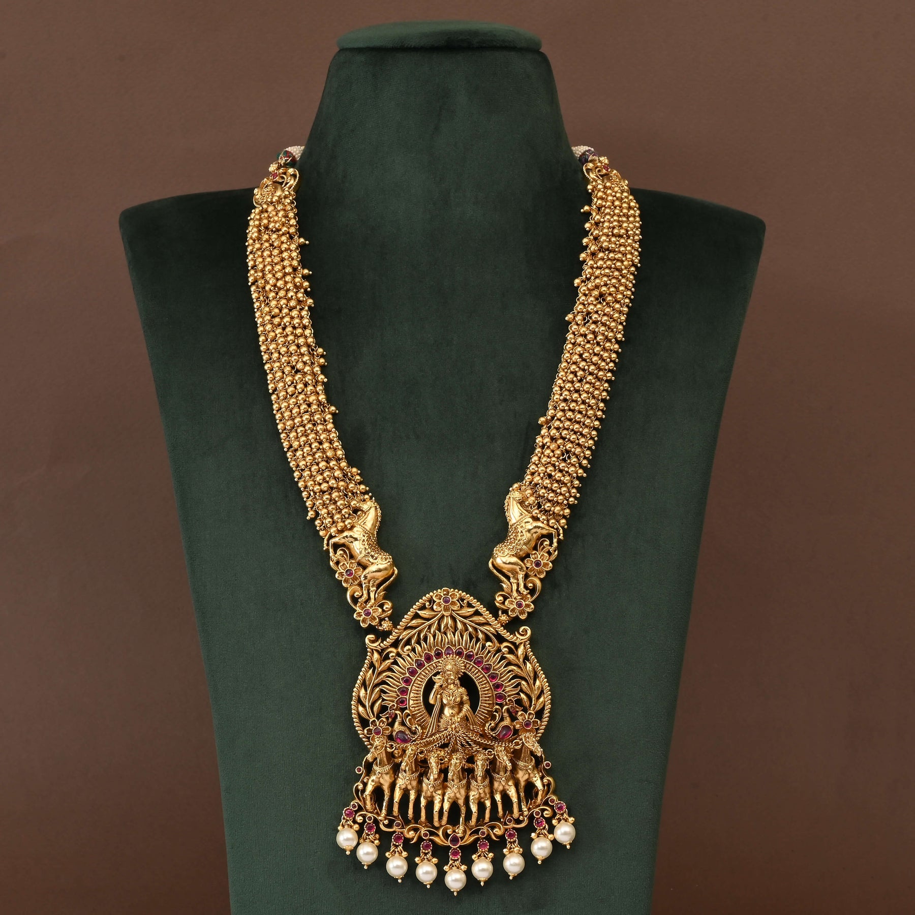 Experience the timeless elegance of our Temple Necklace Set, expertly handcrafted to capture the authentic look of real gold. This traditional jewelry piece features an exclusive design that reflects cultural heritage with intricate detailing, making it perfect for special occasions. Crafted with precision, it offers the distinguished appearance of genuine gold while celebrating classic artistry. Elevate your style with this unique, handcrafted set that embodies sophistication and tradition.