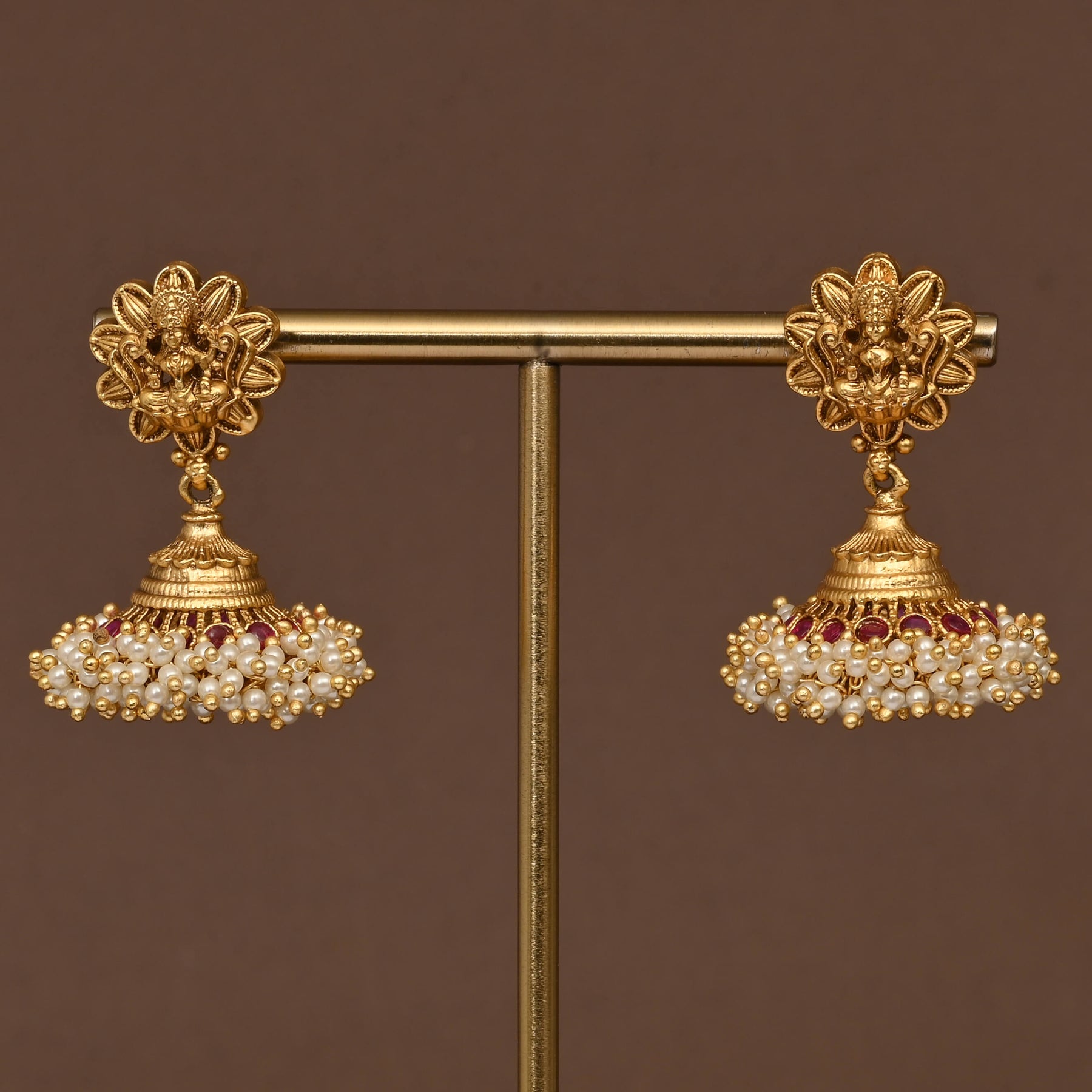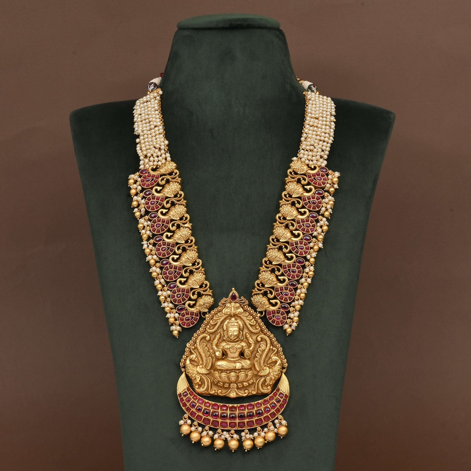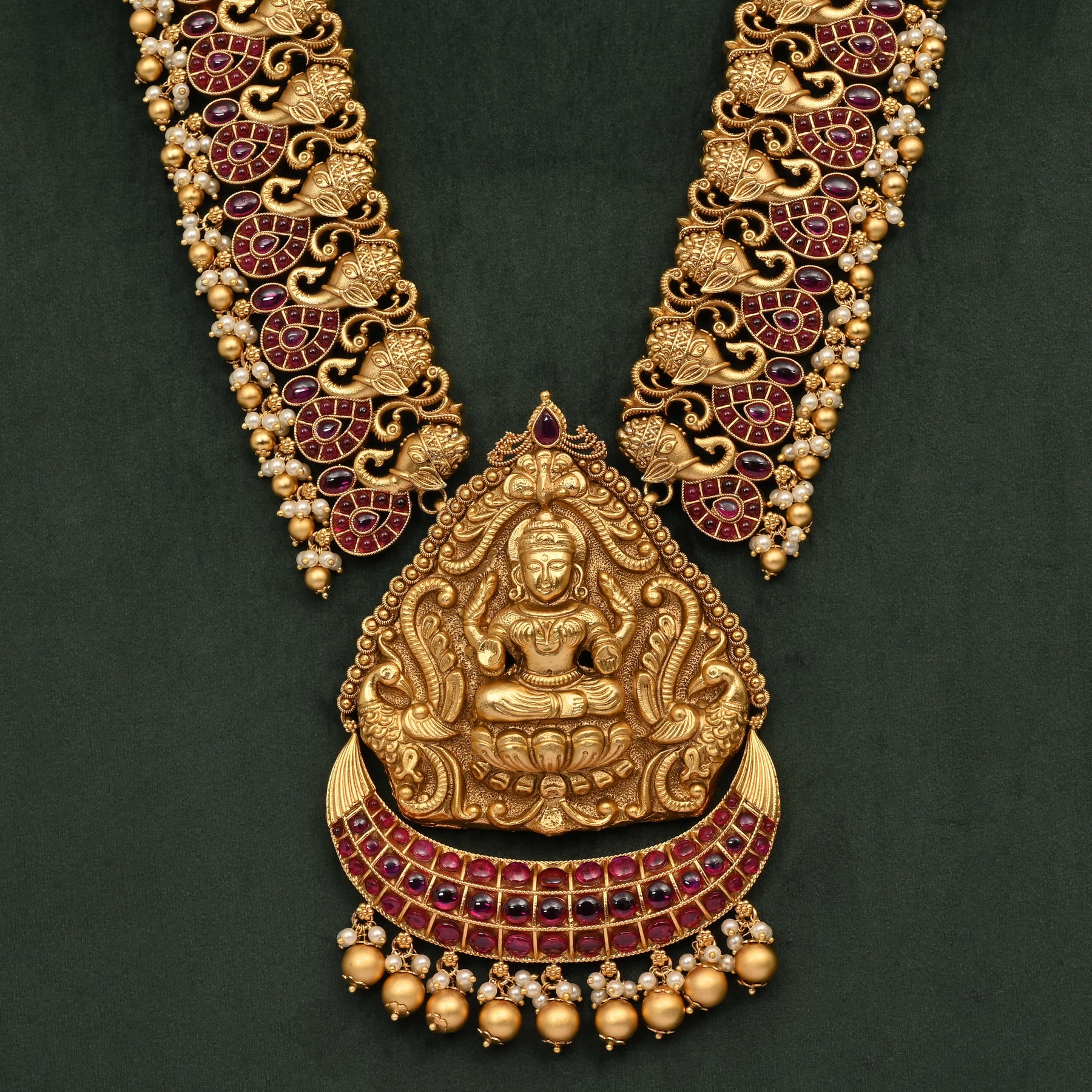 This exquisite Temple Necklace Set showcases a handcrafted design inspired by goddess Lakshmi, reflecting traditional artistry with a realistic gold finish. Its exclusive craftsmanship offers an authentic appearance, making it a distinguished choice for those appreciating heritage elegance in fine jewelry.