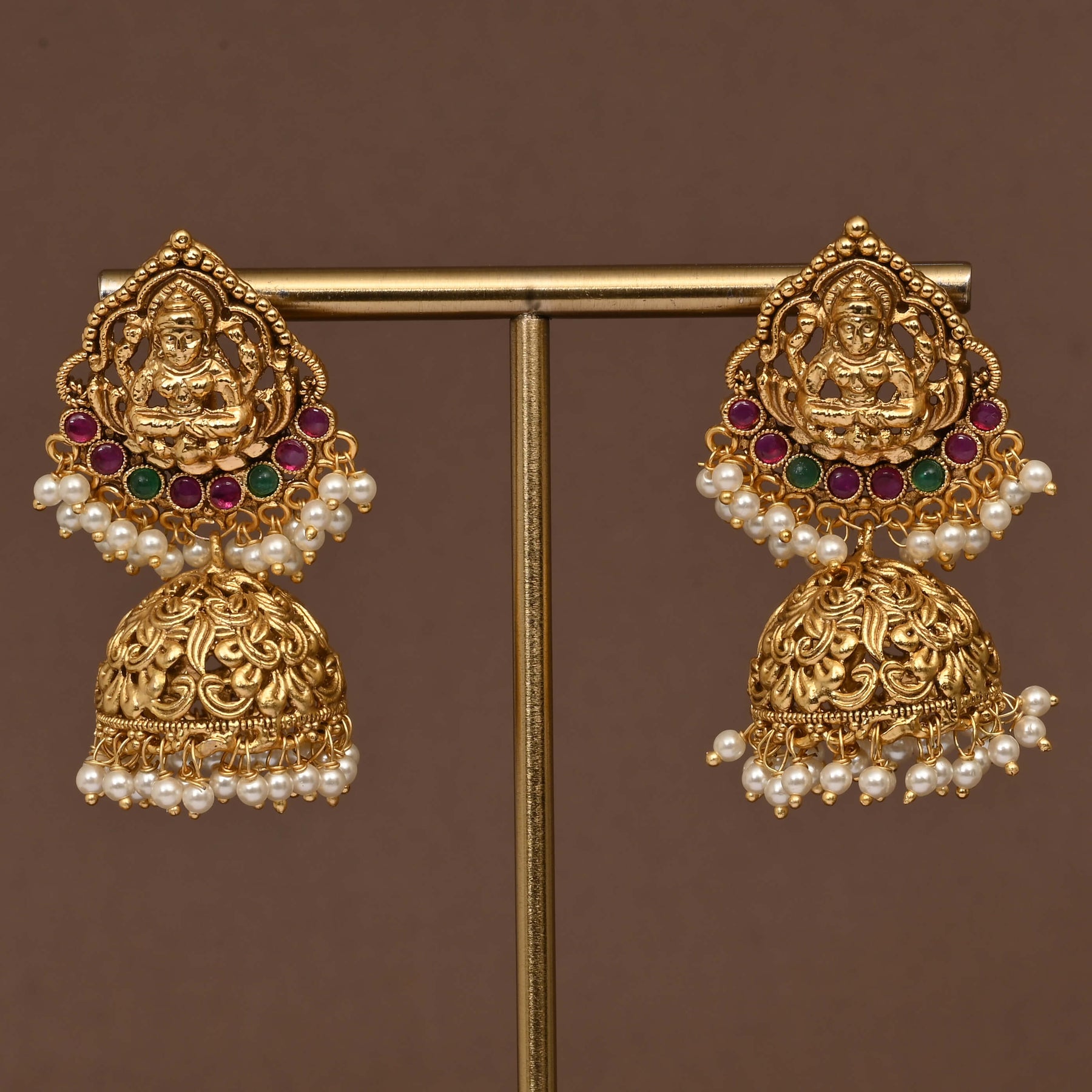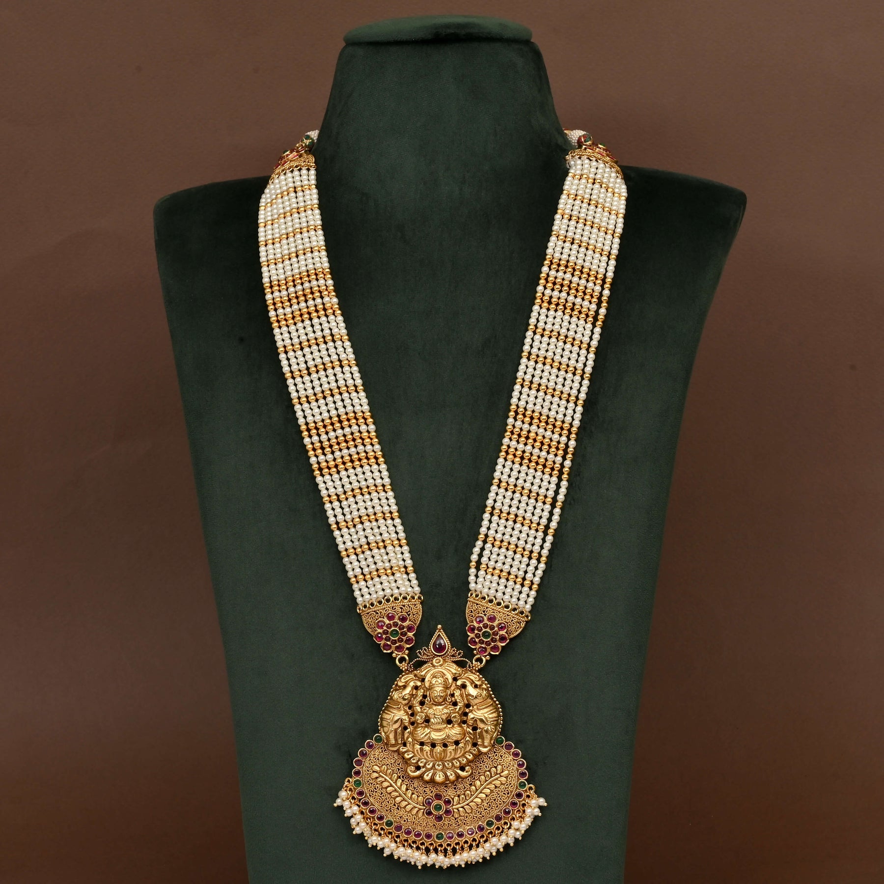 This Temple Necklace Set features an exclusive handcrafted design inspired by Goddess Lakshmi, embodying traditional artistry with a luxurious gold finish. Meticulously crafted to offer the appearance of real gold, it brings an authentic and regal touch to your collection. Perfect for those seeking a timeless, culturally rich accessory, this necklace set combines heritage with elegance for special occasions.