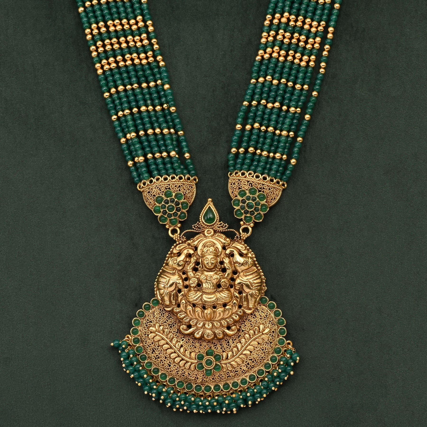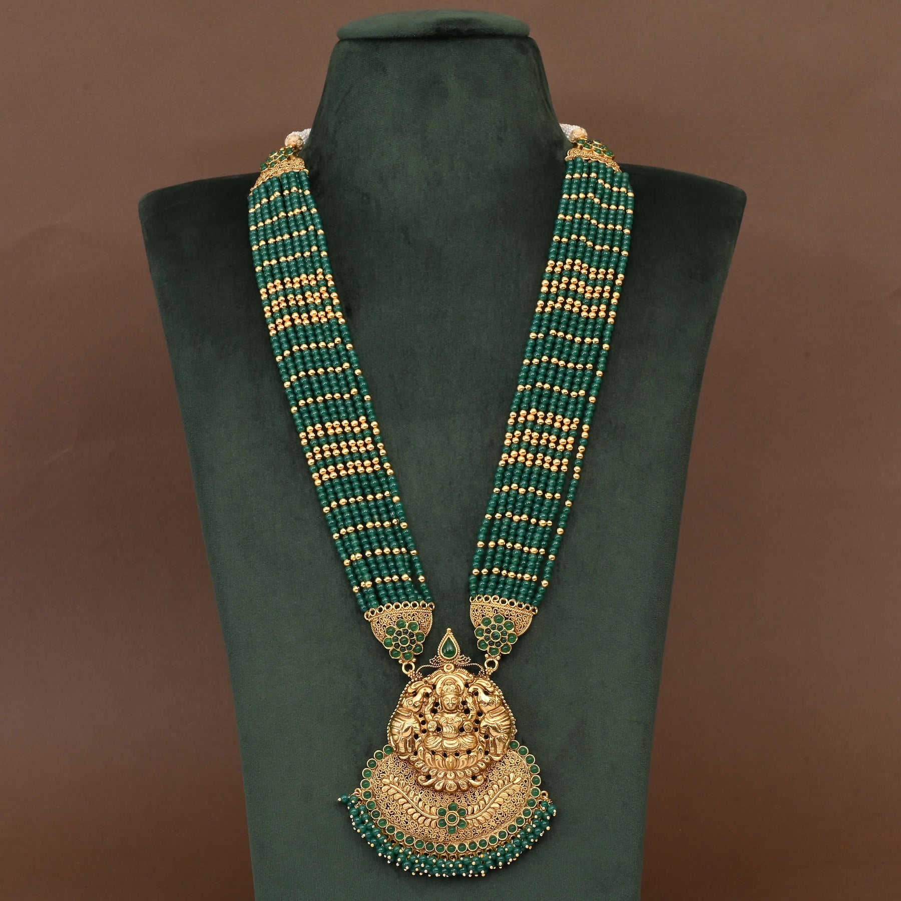 This handcrafted Temple Necklace Set features multiple bead strands and an exclusive goddess Lakshmi design, offering a traditional look with the appearance of real gold. Expertly crafted to highlight cultural elegance, it brings a distinguished charm to any special occasion.