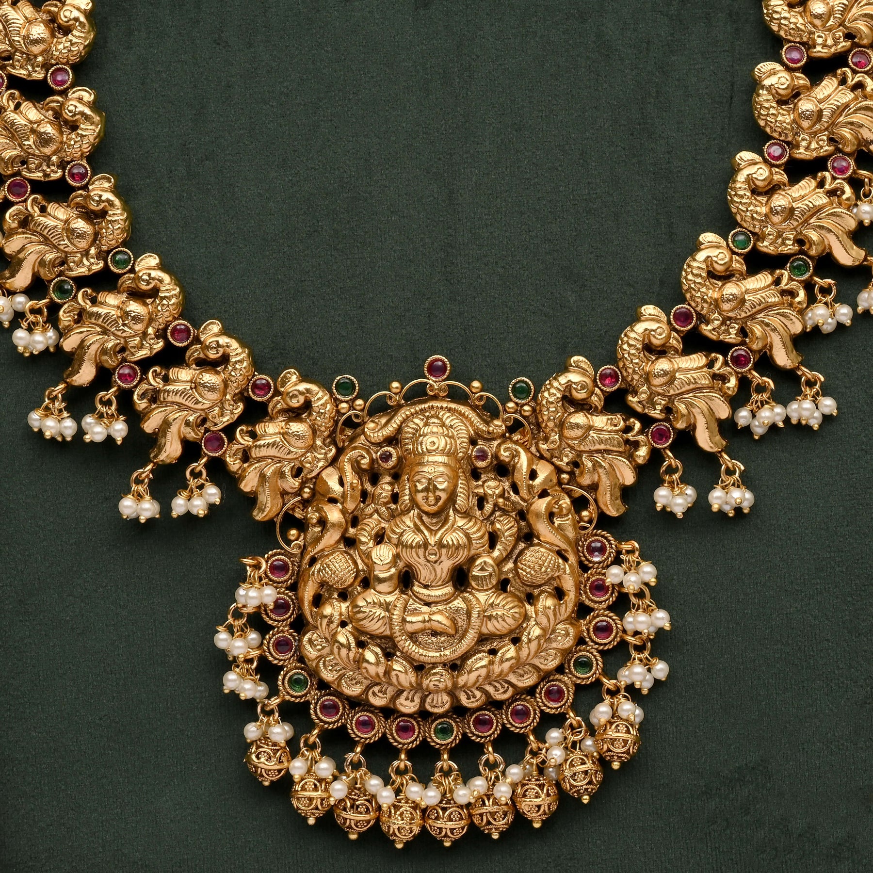 Experience the timeless charm of tradition with our Temple Necklace Set, featuring an exquisite Lakshmi Goddess motif. Handcrafted with meticulous attention to detail, this set offers a rich gold finish that mimics the allure of real gold. Its exclusive design honors classical artistry, making it a perfect choice for cultural celebrations or enhancing your everyday elegance with a touch of heritage.