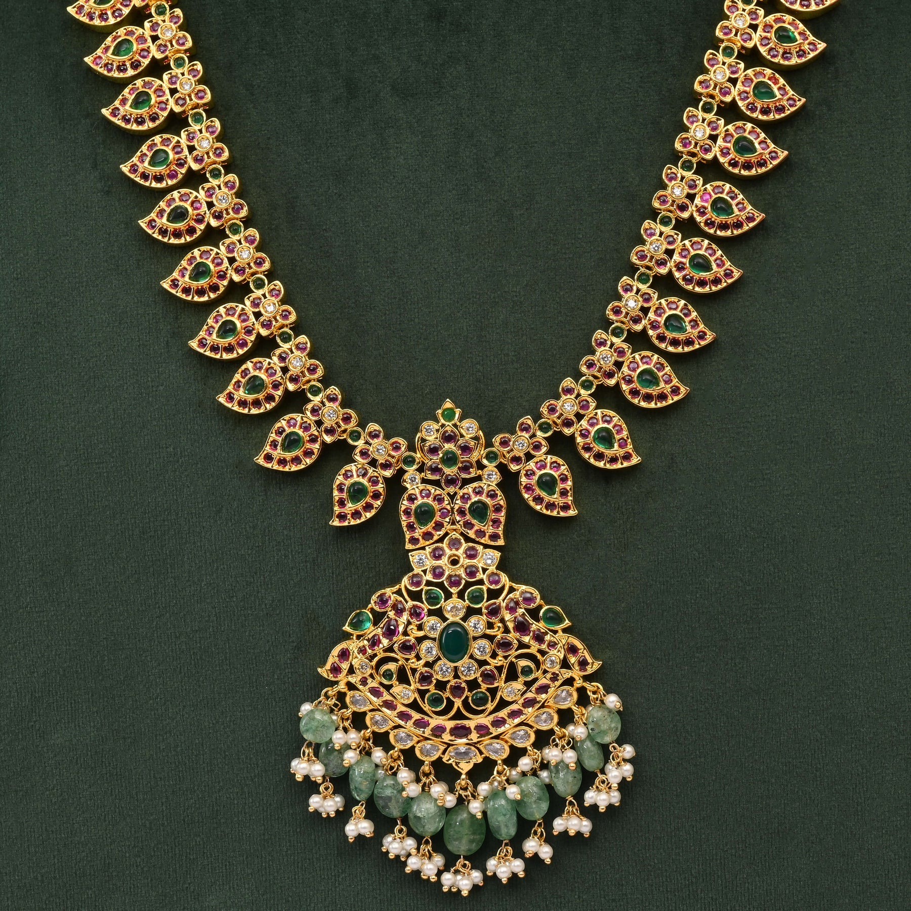 Elevate your traditional ensemble with this exquisite Temple Necklace Set, a masterpiece of handcrafted artistry. Featuring authentic nakshi work in lustrous gold finish, embodying grace and prosperity. Each intricate detail reflects meticulous craftsmanship, honoring centuries-old temple jewelry traditions. Perfect for festive occasions, weddings, or spiritual celebrations, this necklace set combines timeless elegance with cultural significance, making it an heirloom-worthy addition to your jewelry collection.