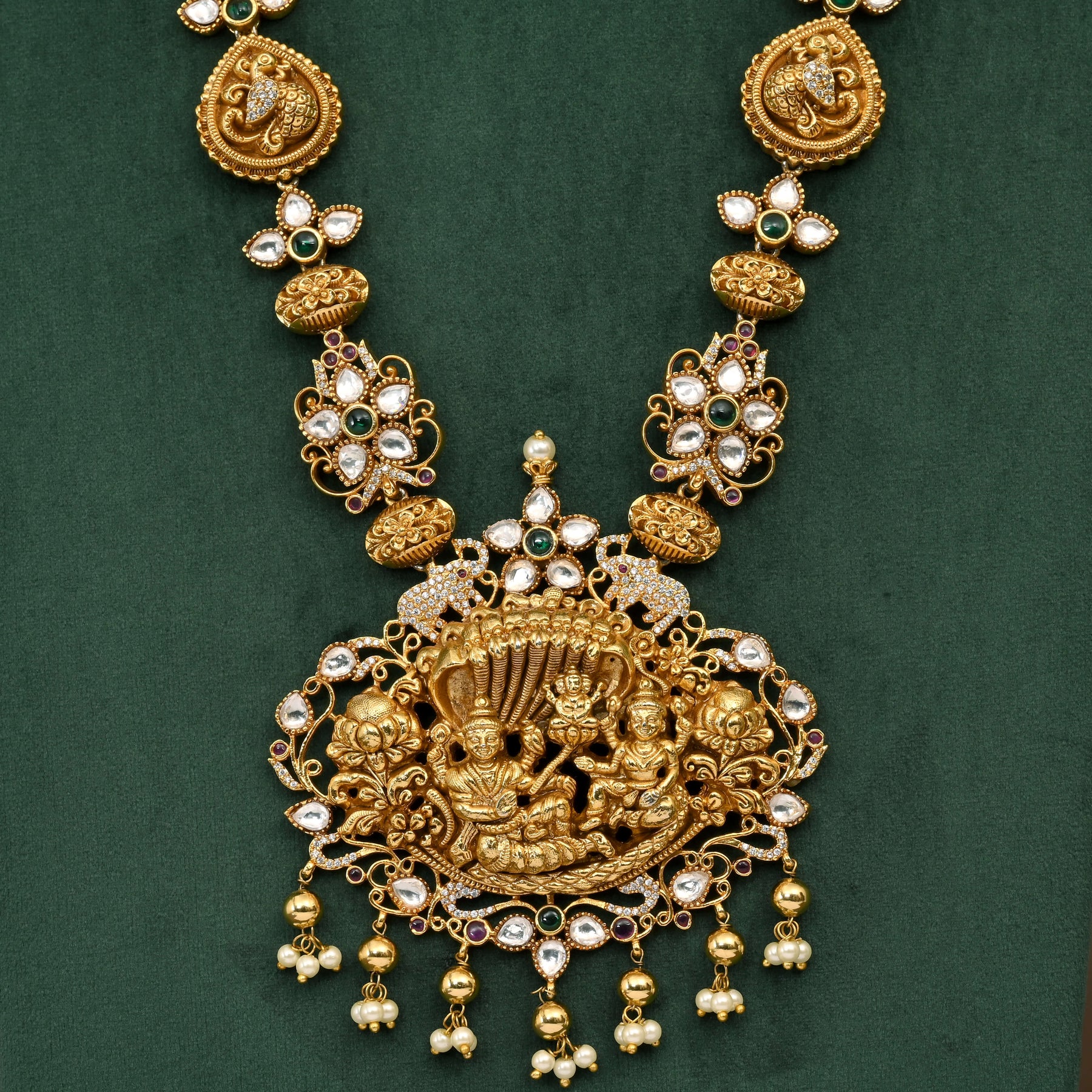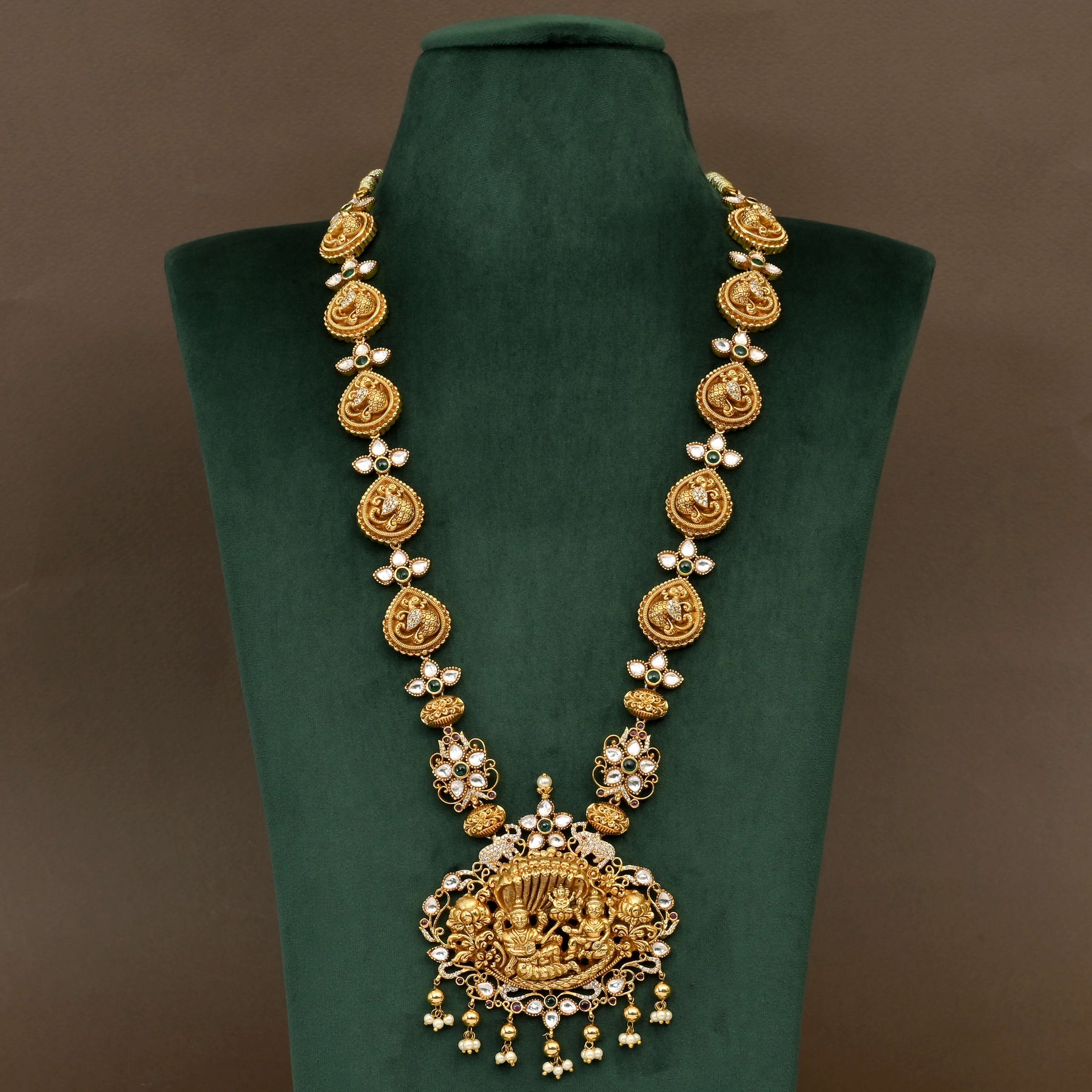 This handcrafted Temple Necklace Set features an exclusive traditional design with a rich gold finish that offers the authentic appearance of real gold. Expertly crafted to embody cultural elegance, it enhances your ensemble with timeless appeal and meticulous detail. Perfect for special occasions, this set combines artistry and heritage in a stunning accessory.