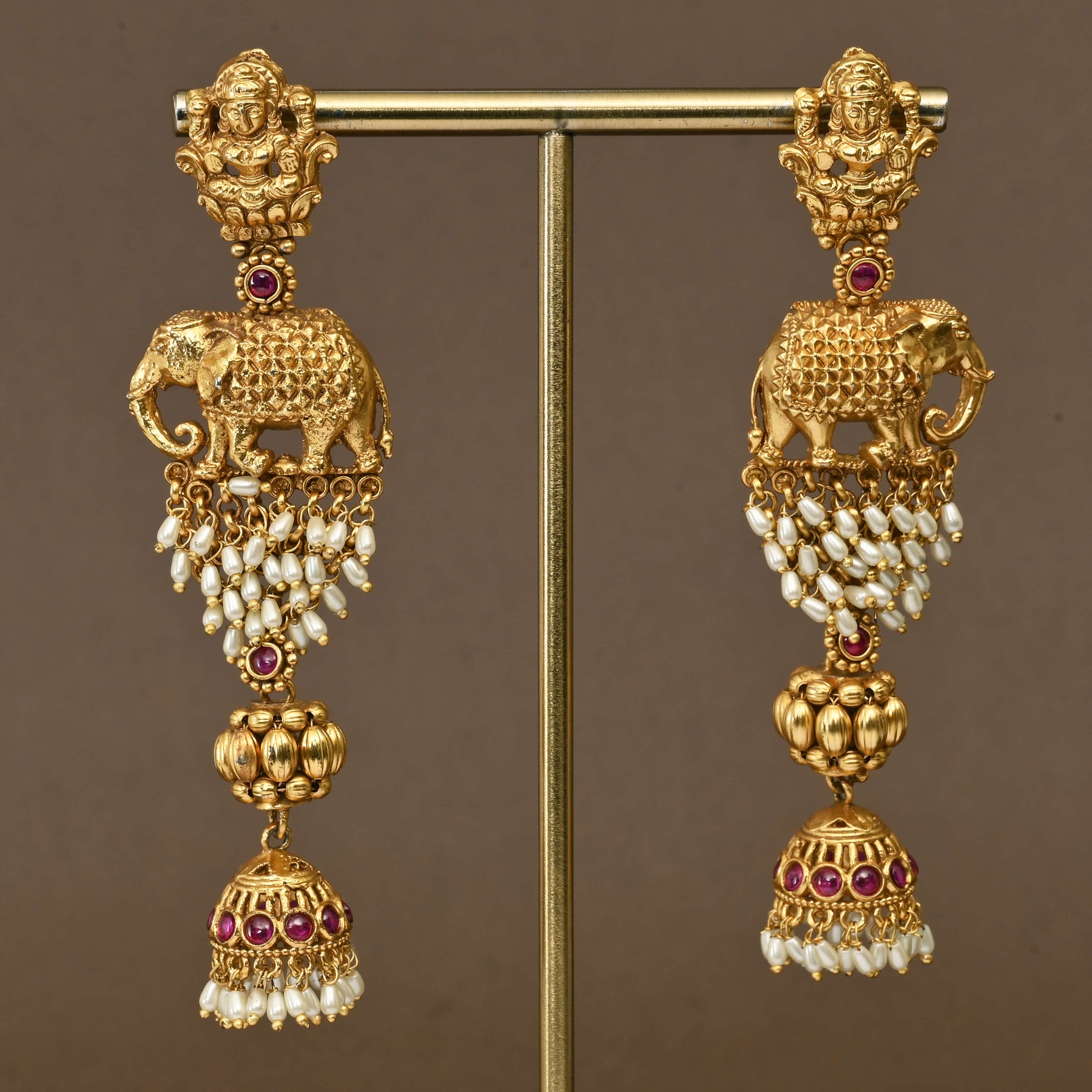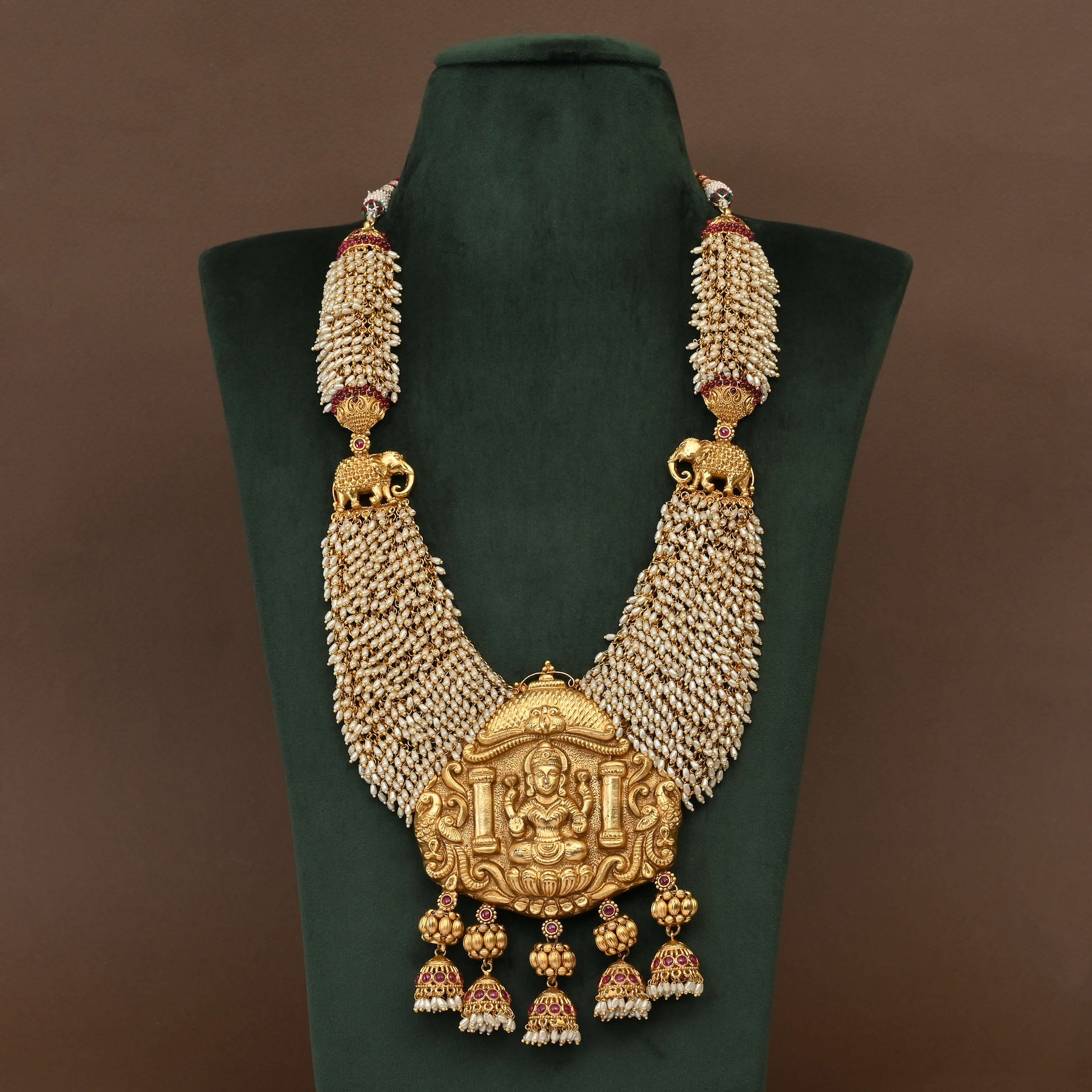 Elevate your traditional collection with this Temple Necklace Set, featuring an exquisite handcrafted goddess Lakshmi design. Finished in a rich gold tone, it offers the authentic allure of real gold while showcasing intricate craftsmanship. This exclusive piece blends heritage artistry with timeless elegance, perfect for complementing festive and ceremonial attire.