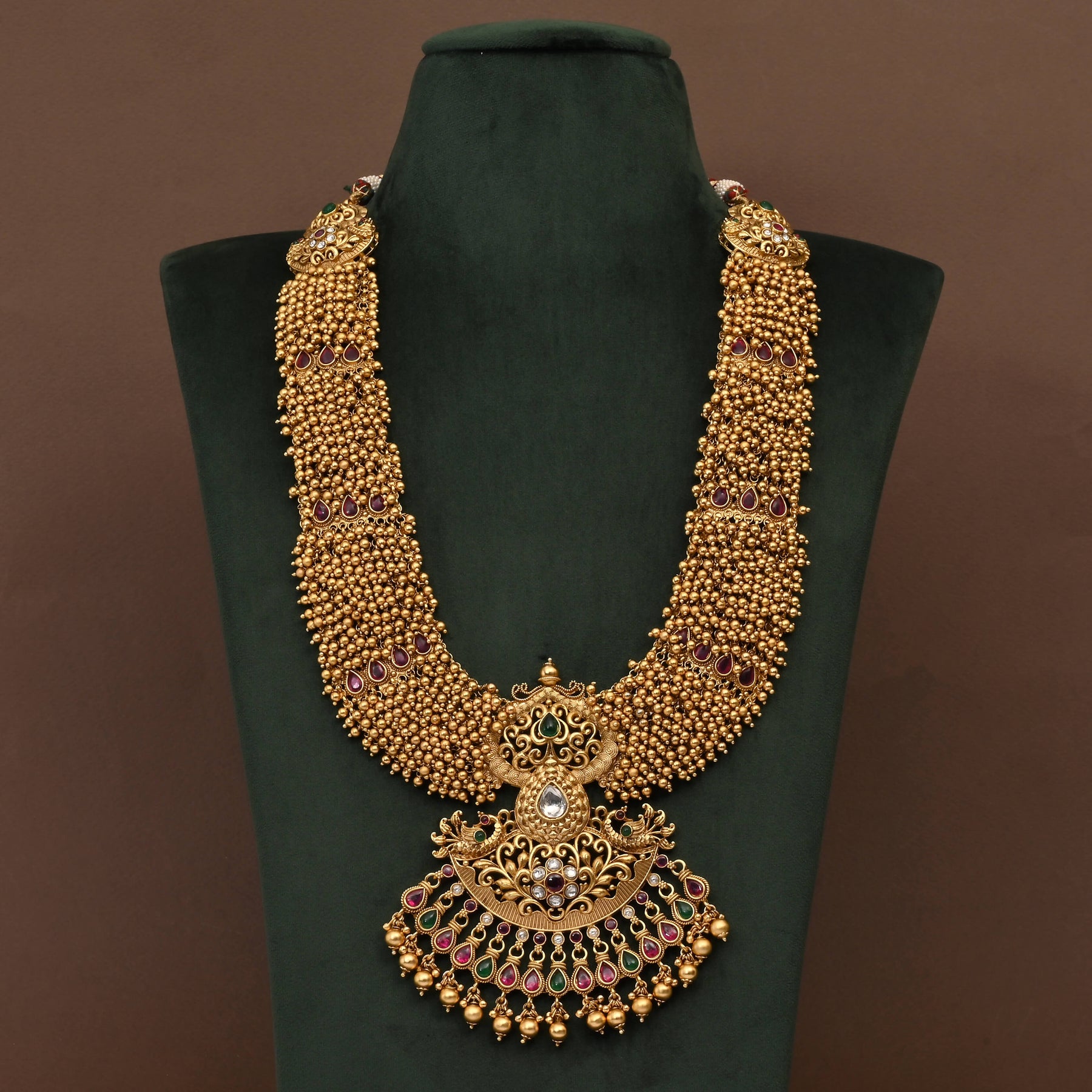 This handcrafted Temple Necklace Set in a gold finish perfectly replicates the appearance of real gold with a traditional design. Its exclusive craftsmanship highlights intricate details, making it a distinguished accessory ideal for special occasions that celebrate cultural heritage.