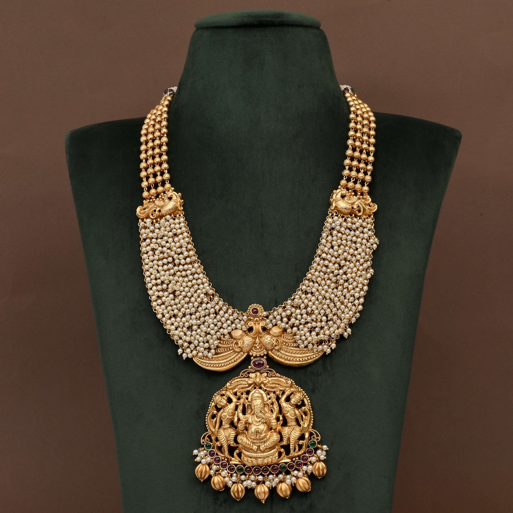 This handcrafted Temple Necklace Set offers an exclusive design with a traditional gold finish that closely resembles real gold. Meticulously crafted, it highlights the beauty of classic artistry, making it a refined choice for those seeking authentic, heritage-inspired jewelry.