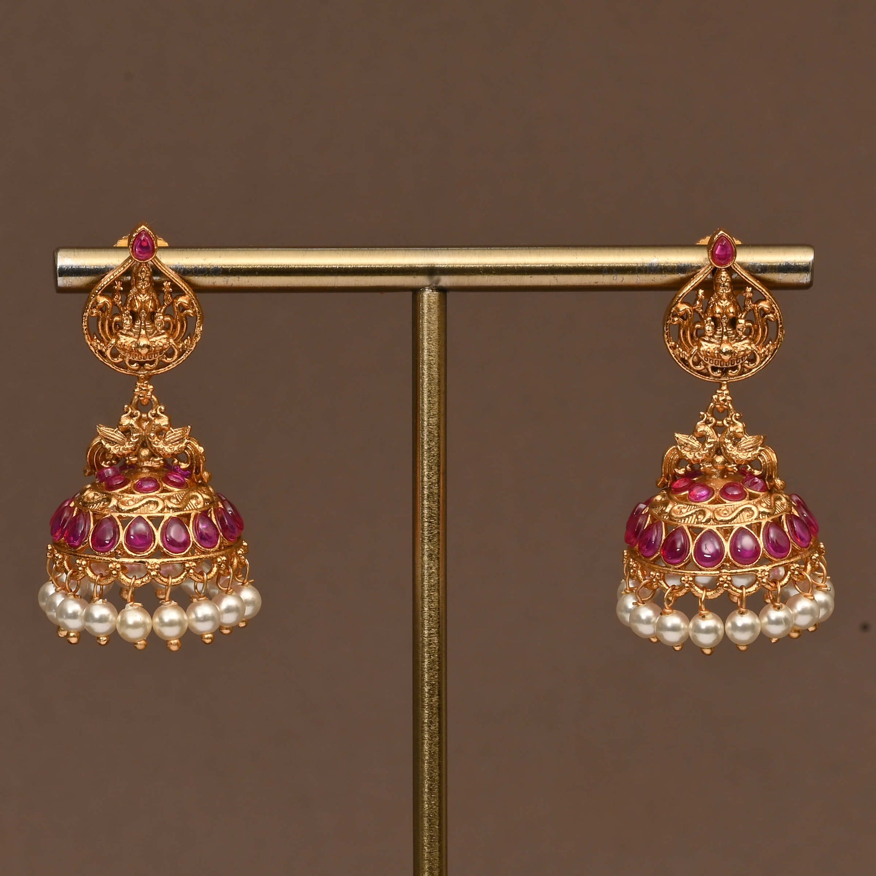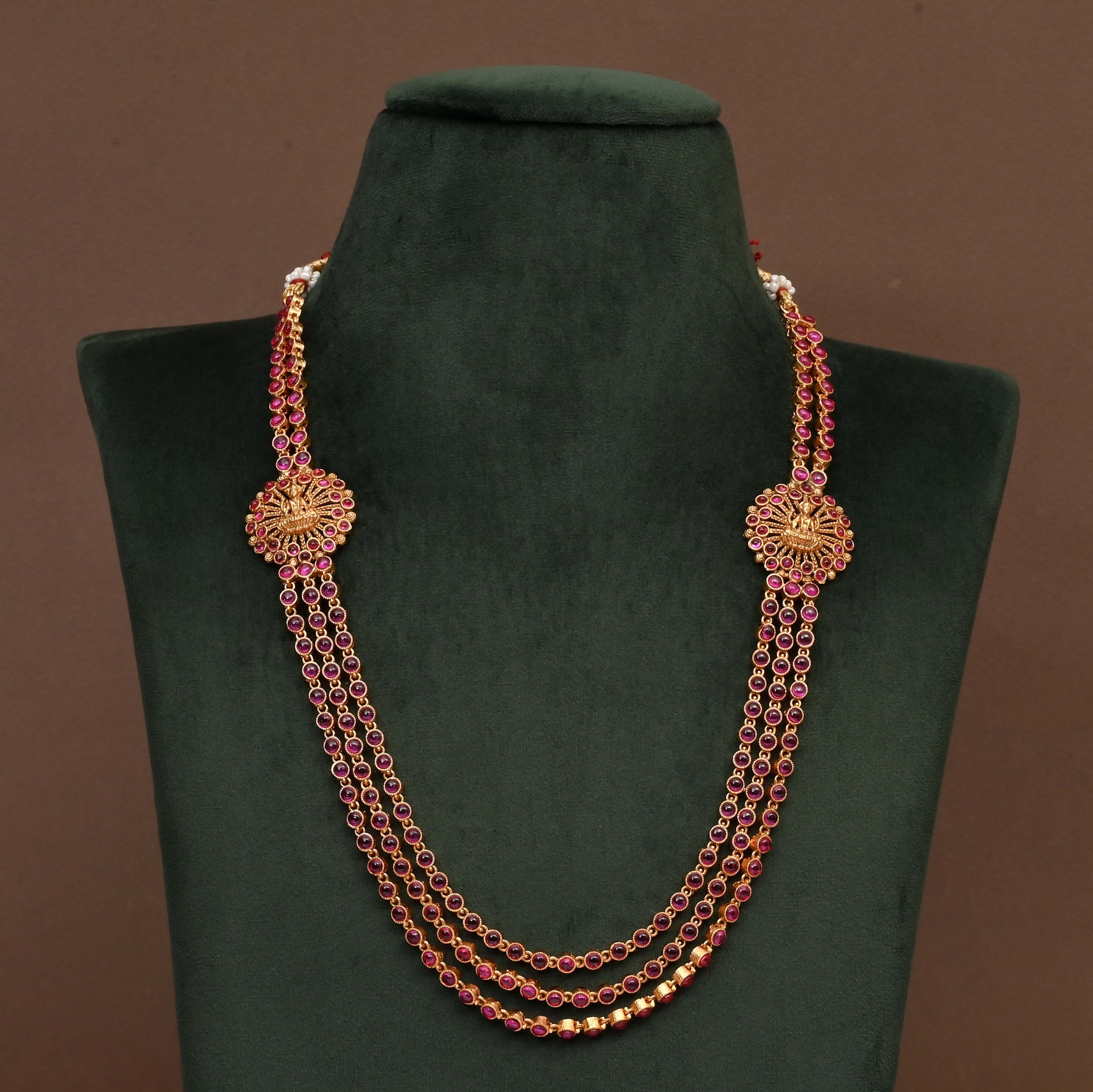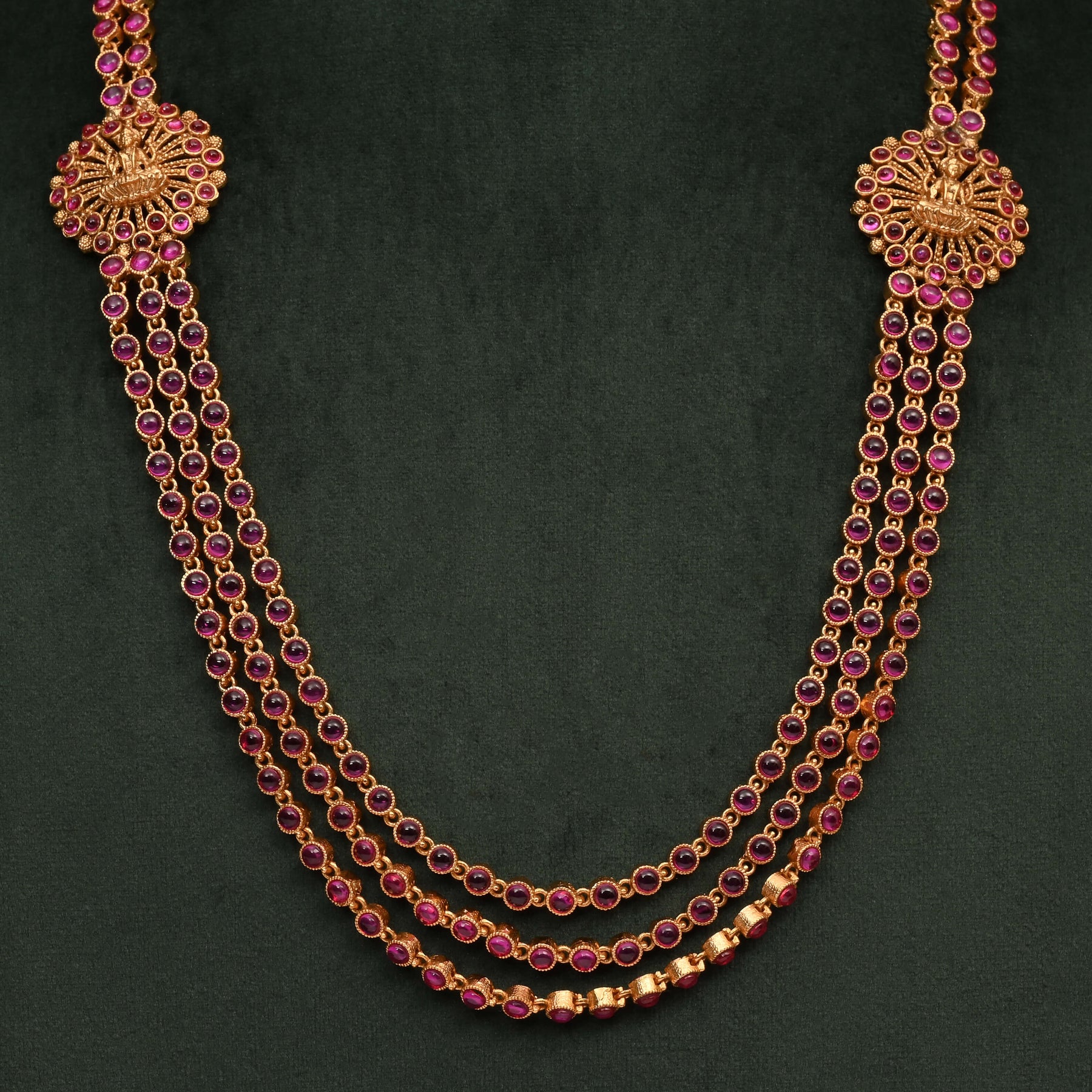 Elevate your traditional attire with this Temple Necklace Set, expertly crafted to mimic the rich allure of real gold. Featuring semi-precious ruby stones, this one-of-a-kind design showcases intricate craftsmanship and timeless heritage. Its authentic gold finish offers enduring elegance, making it an ideal statement piece for special occasions and cultural celebrations.