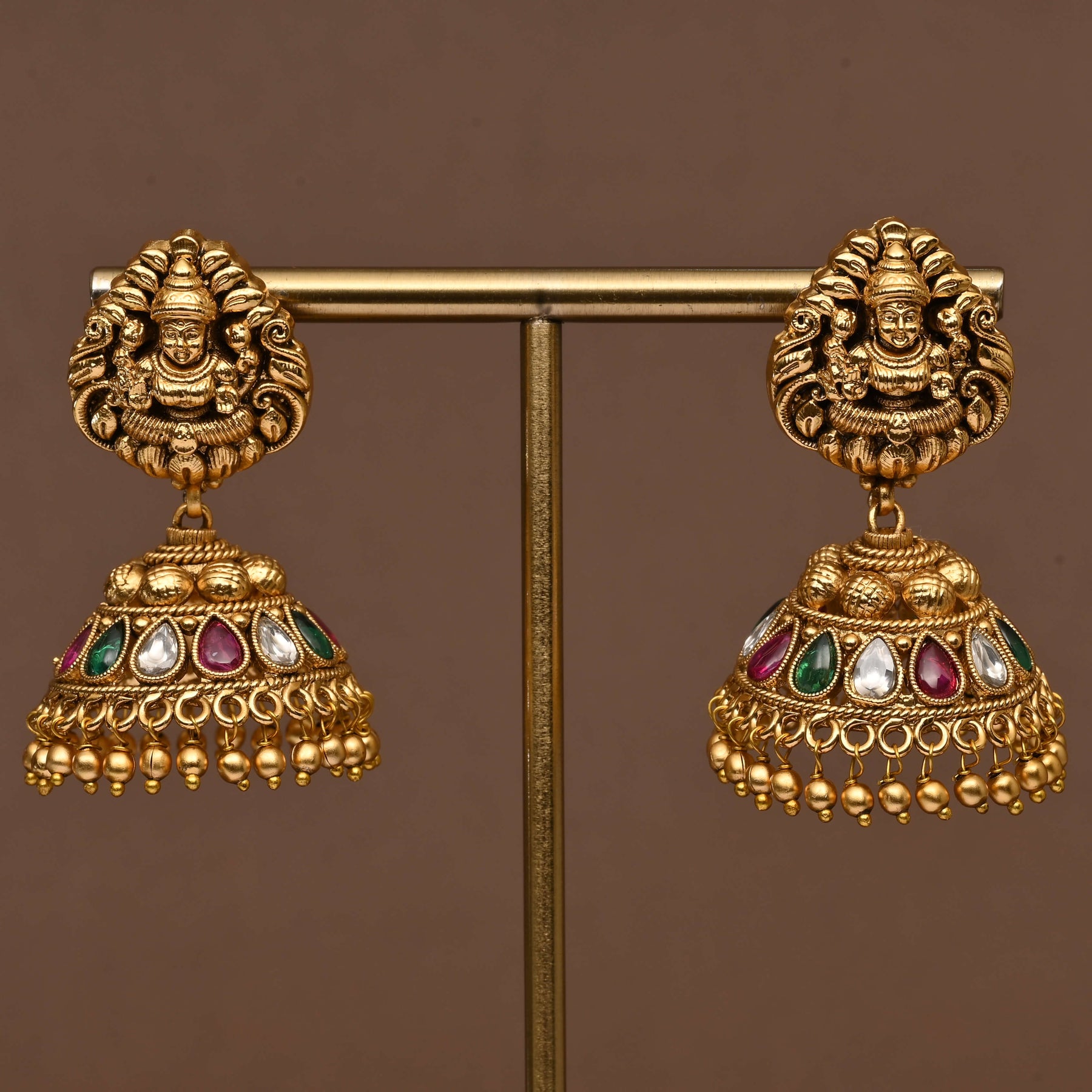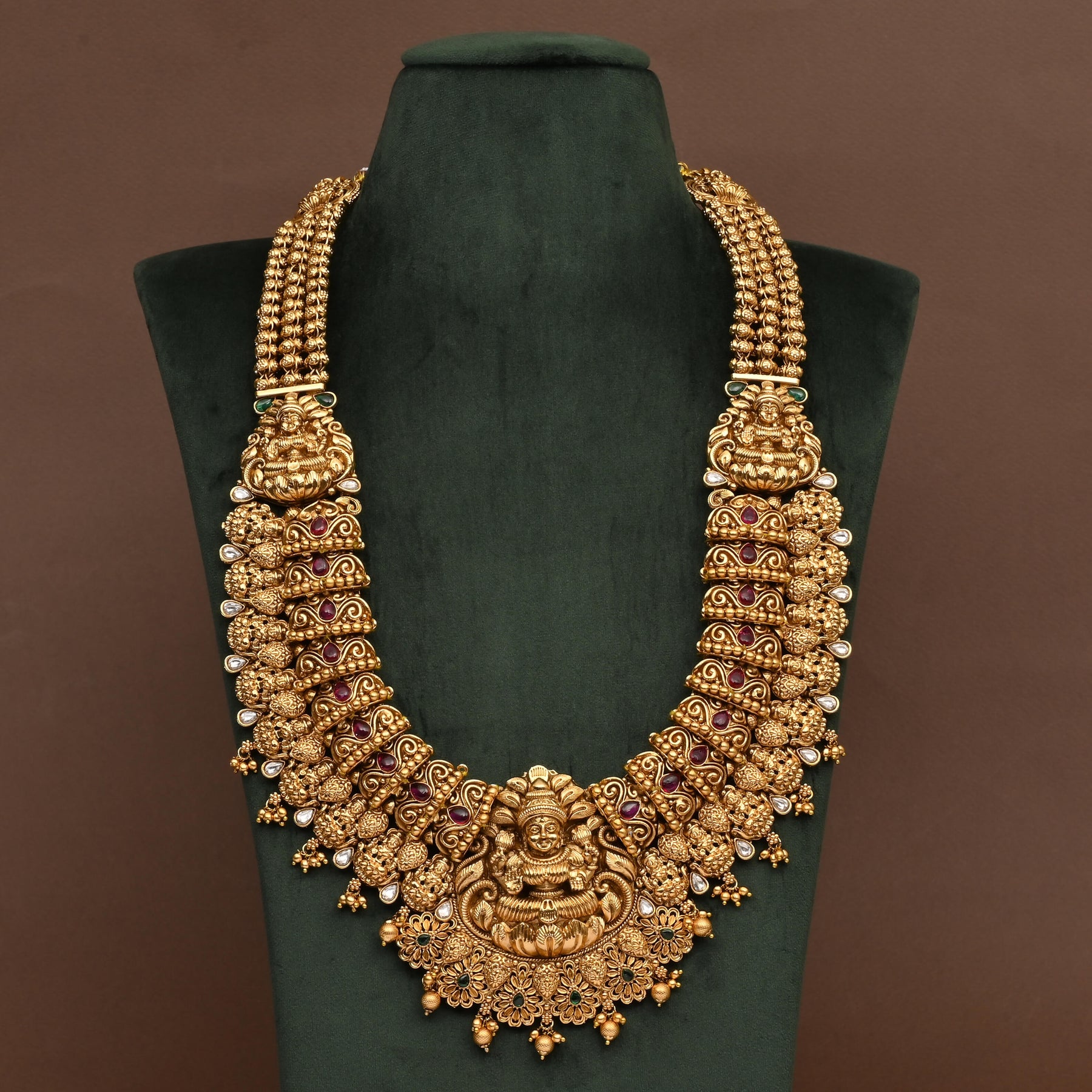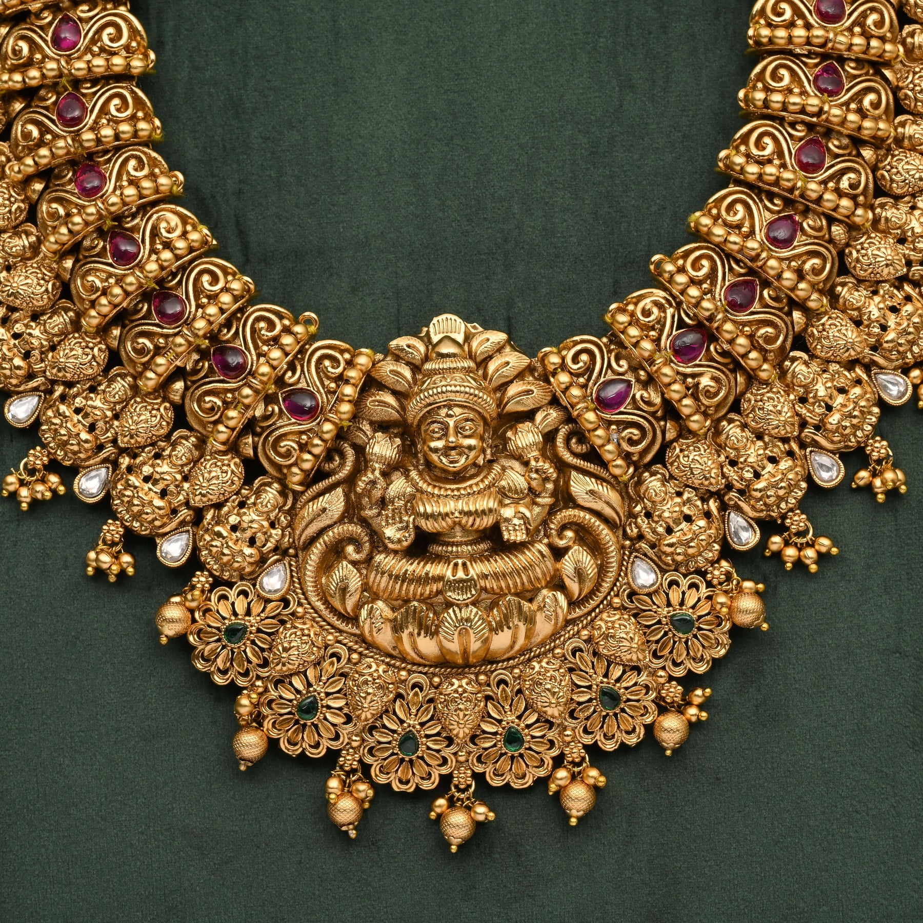 This Temple Necklace Set features a meticulously handcrafted design inspired by traditional motifs, showcasing the revered Lakshmi Goddess. Finished in a rich gold tone that mirrors real gold, it offers an authentic and elegant look. The exclusive craftsmanship ensures both cultural significance and timeless beauty, making it a distinguished addition to any jewelry collection.