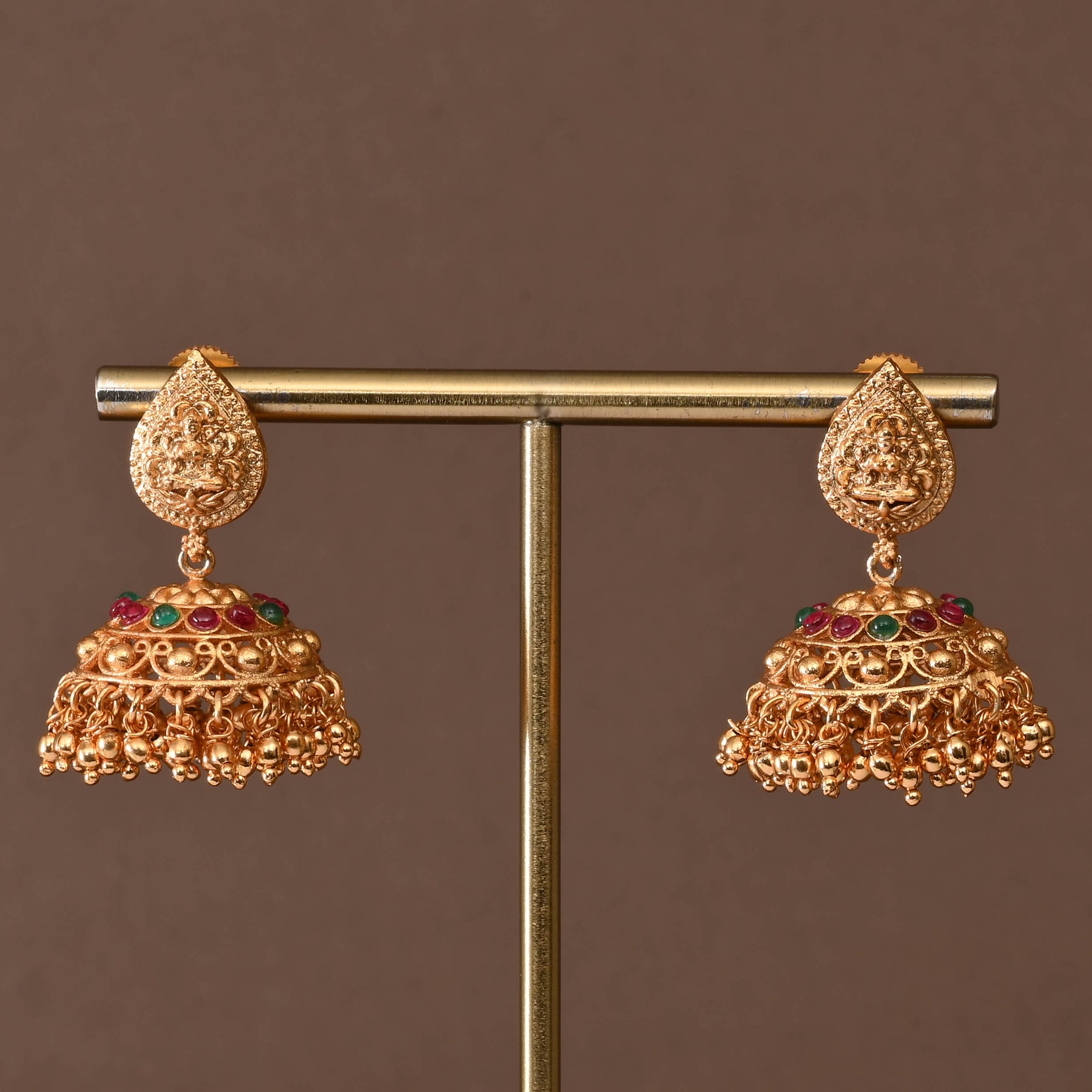 This Temple Necklace Set features an exquisite gold-finish design inspired by Goddess Lakshmi, embodying traditional elegance. Its craftsmanship replicates the rich appearance of real gold, making it a unique and standout piece. Perfect for enhancing cultural attire, it reflects timeless heritage with a one-of-a-kind design that celebrates tradition with refined artistry.
